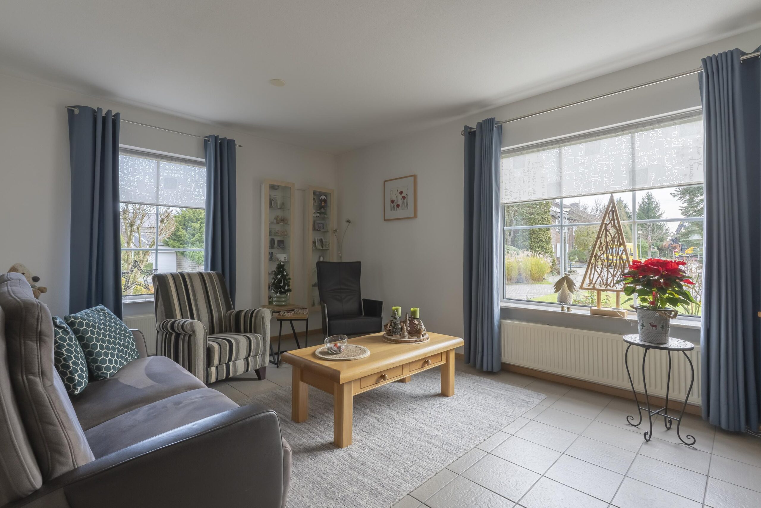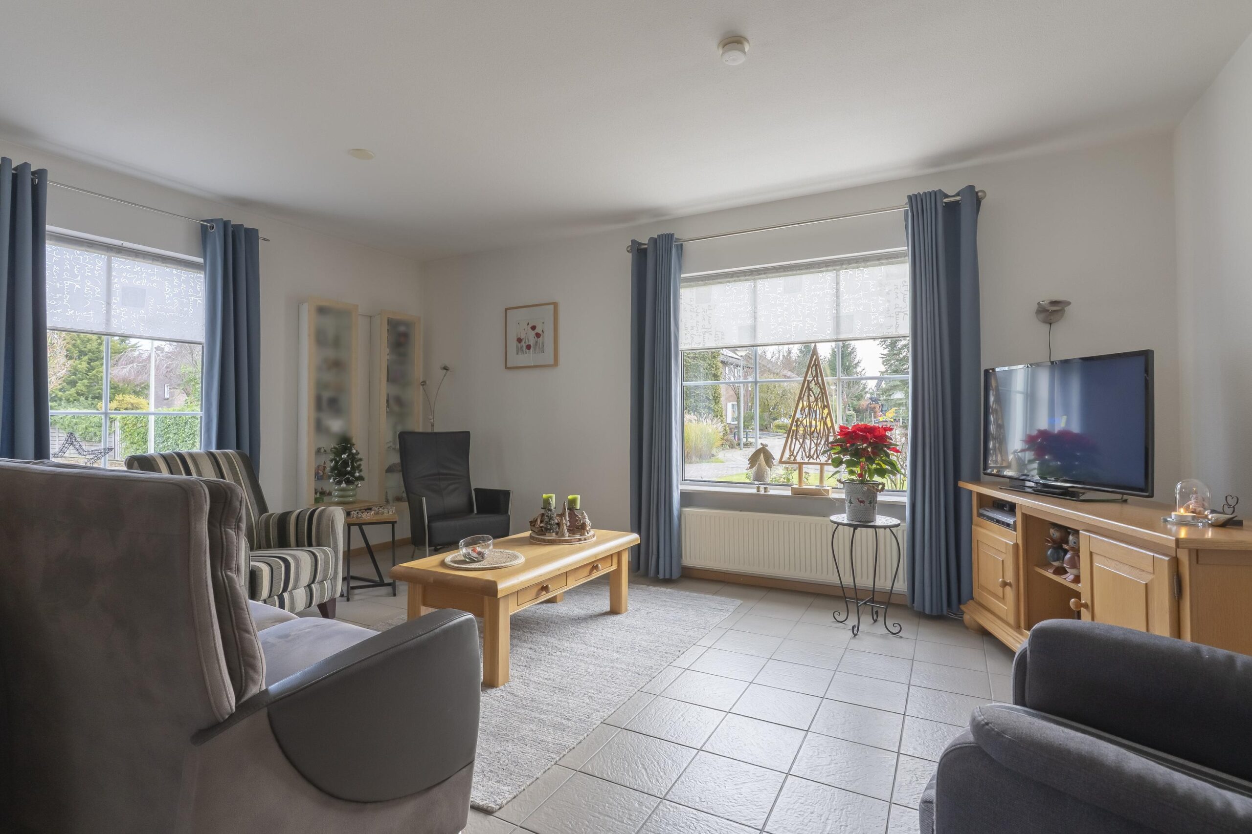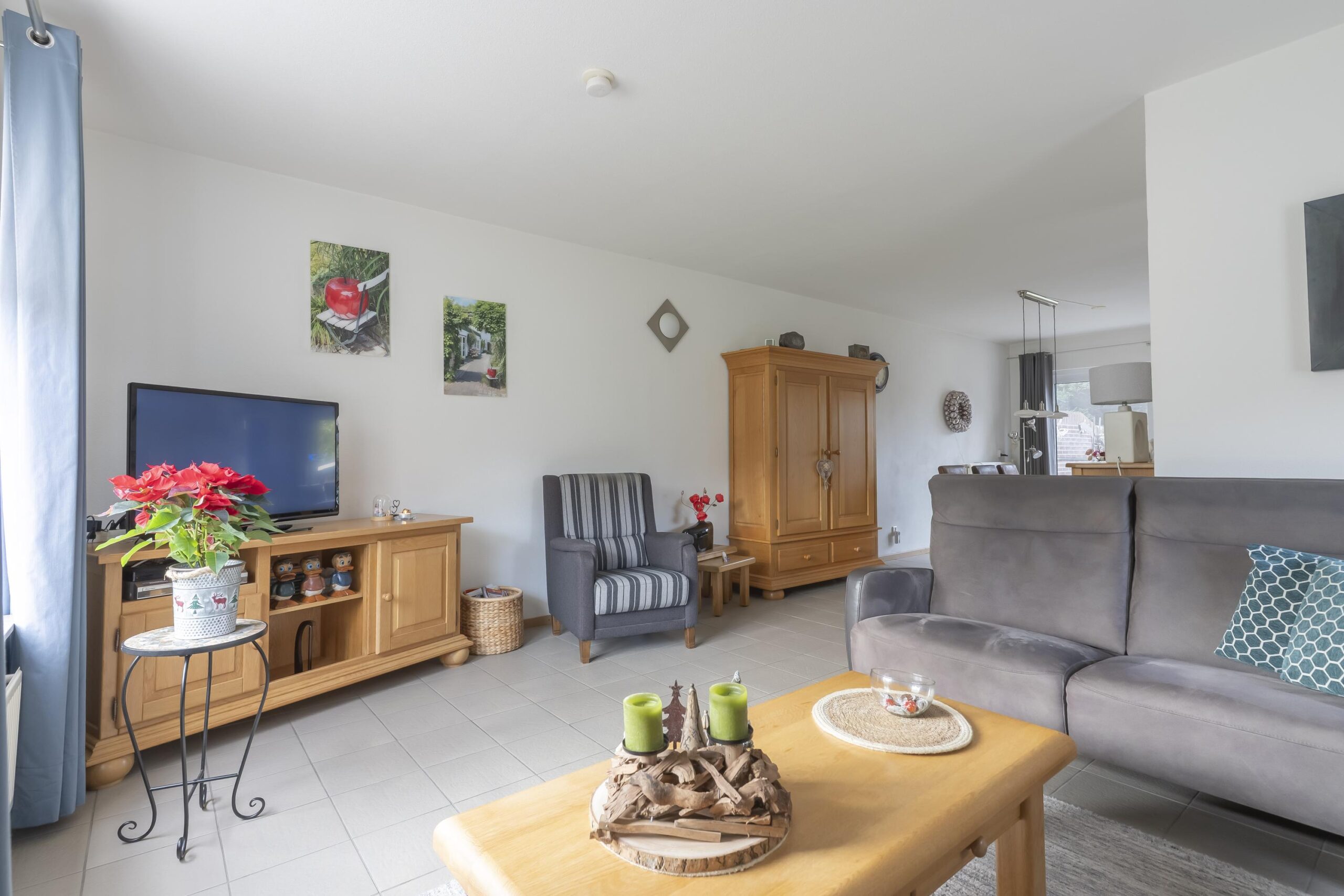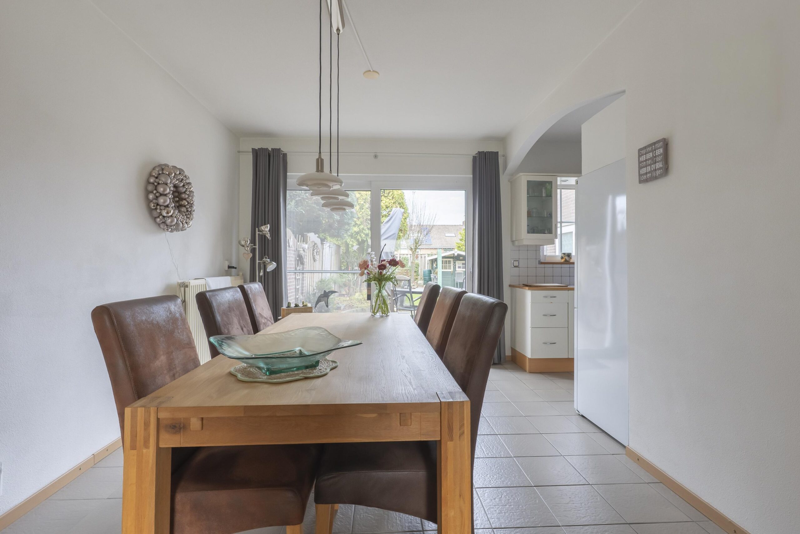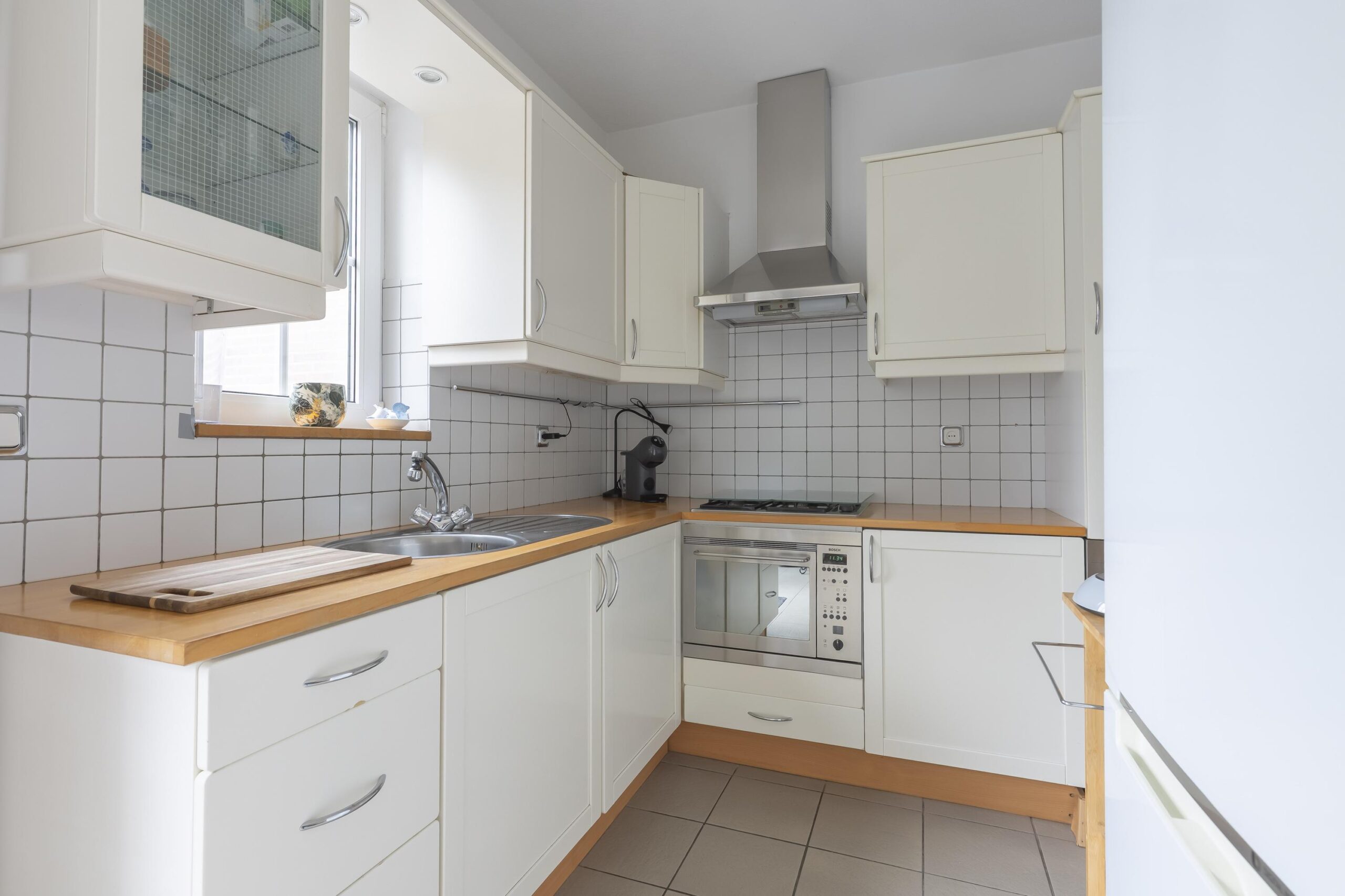 De L-vormige living biedt uitstekend lichtinval en is uitgerust met een royale schuifpui. Aansluitend bevindt zich de open, betegelde keuken, uitgevoerd met een moderne witte installatie en voorzien van inbouwapparatuur: een gaskookplaat, RVS-afzuigkap en vaatwasser.