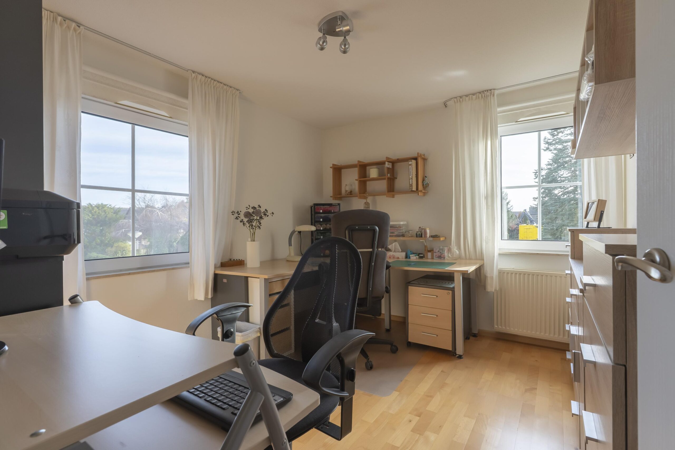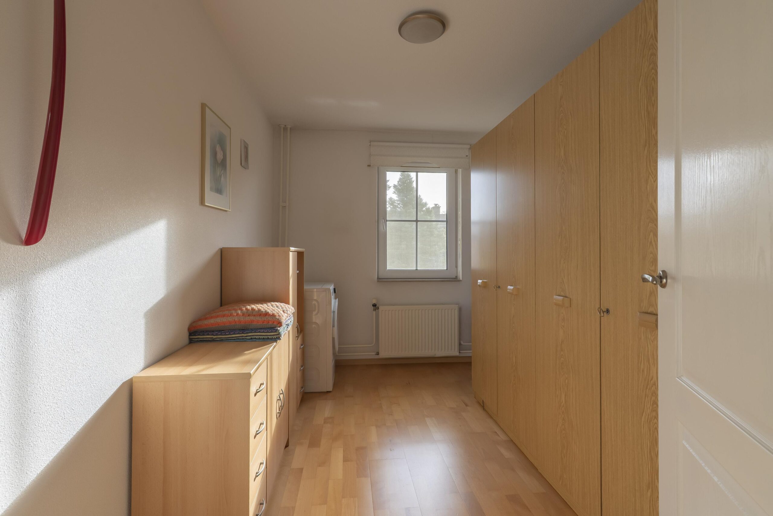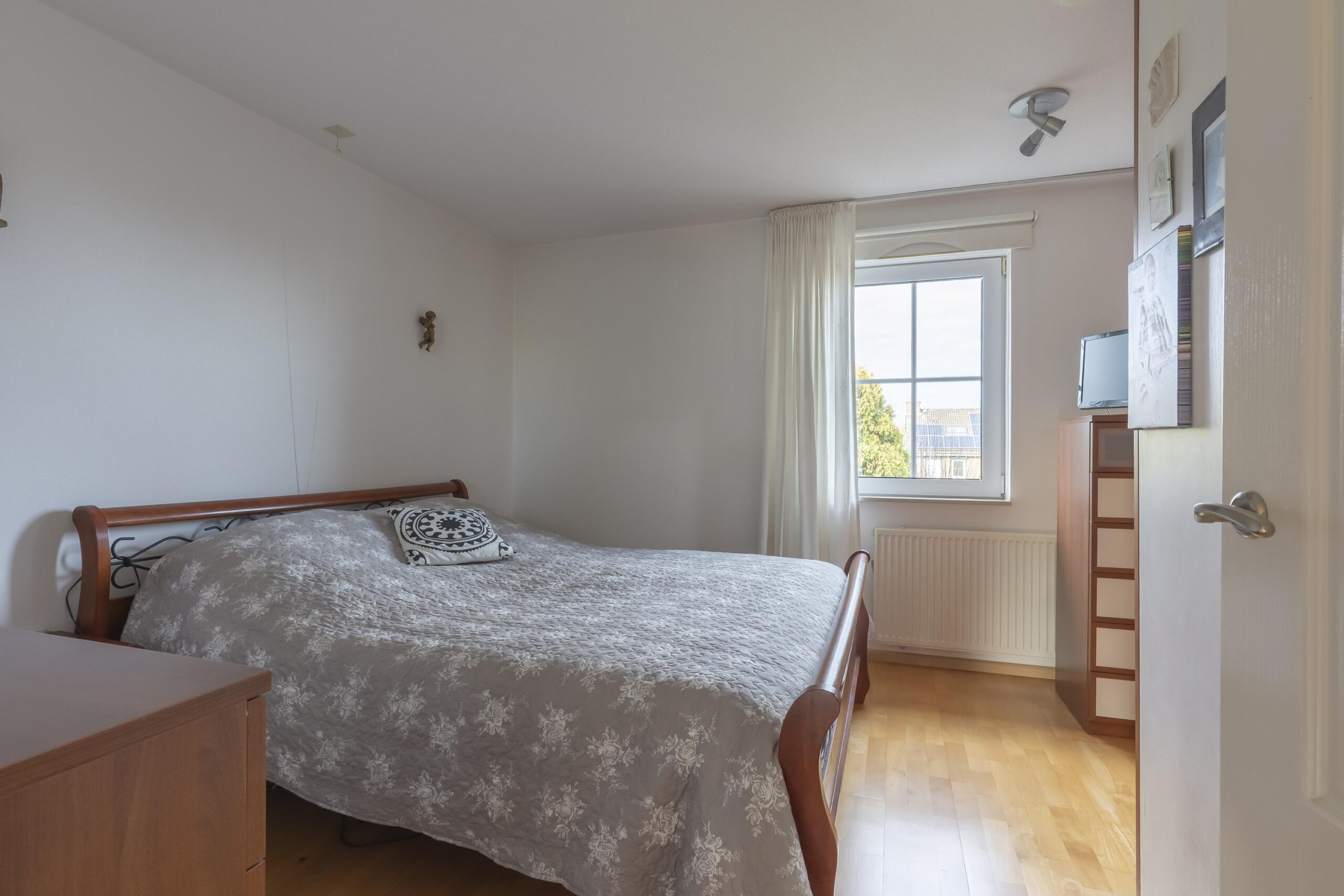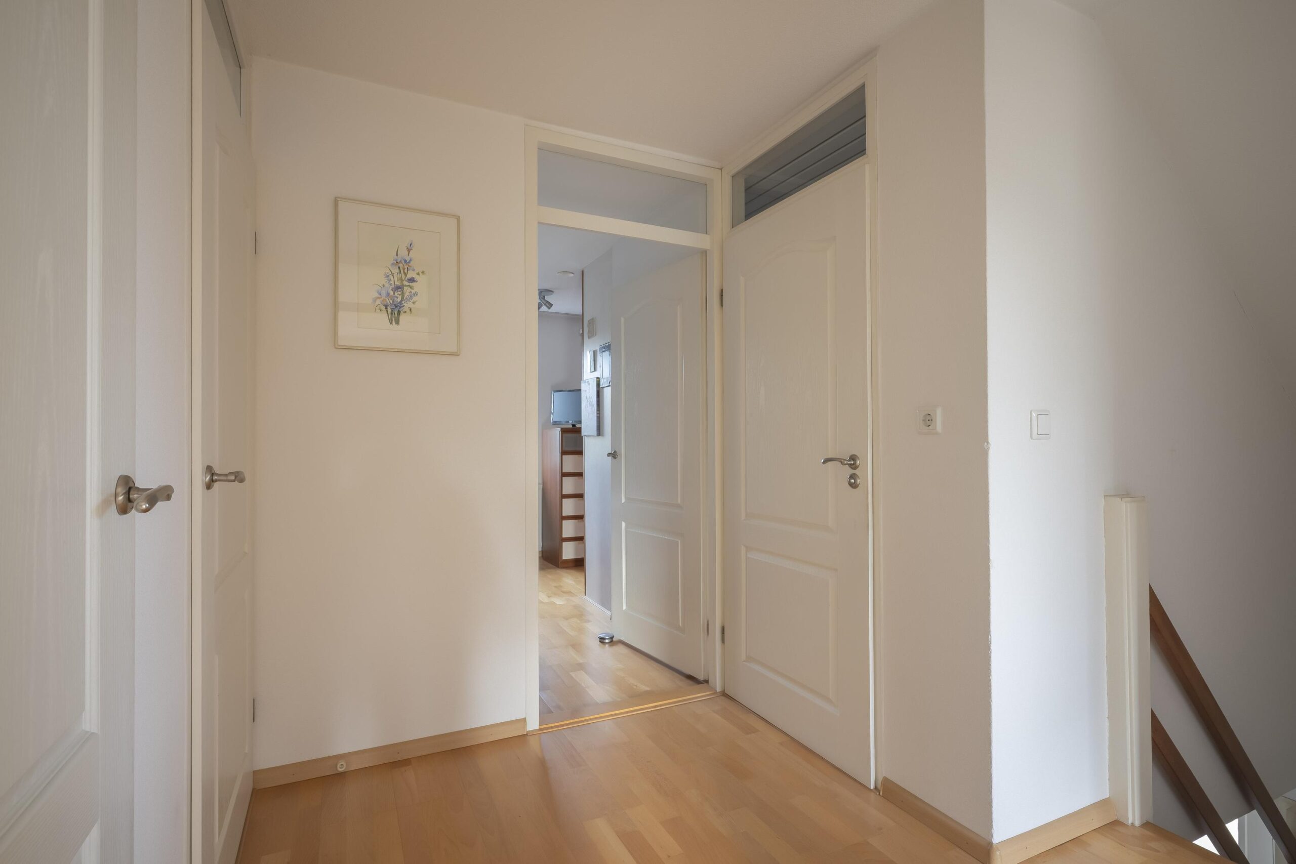 De overloop geeft toegang tot drie ruime, goed afgewerkte slaapkamers, alle voorzien van een laminaatvloer. De grote slaapkamer beschikt over een ingebouwde kast.