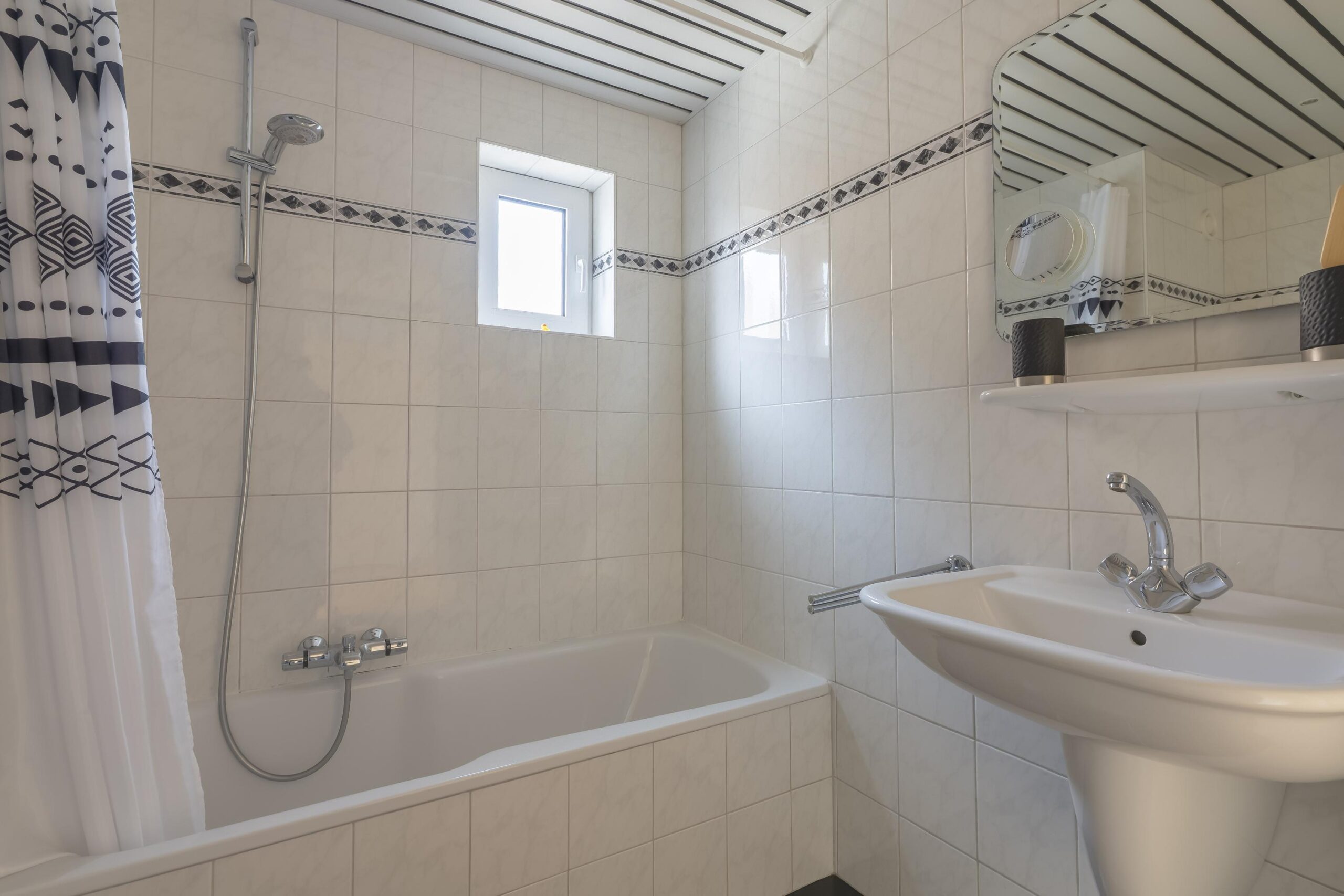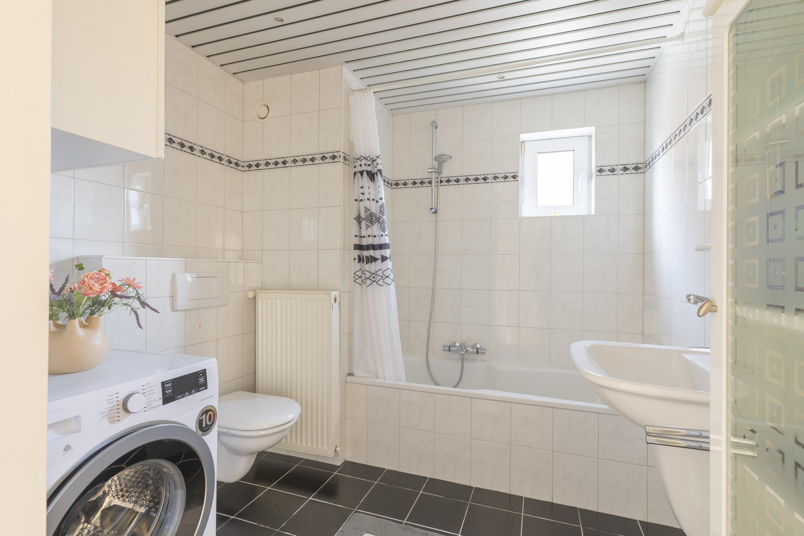 De geheel betegelde badkamer (ca. 5,4 m²) is voorzien van een vrij hangend toilet, wastafel en ligbad.