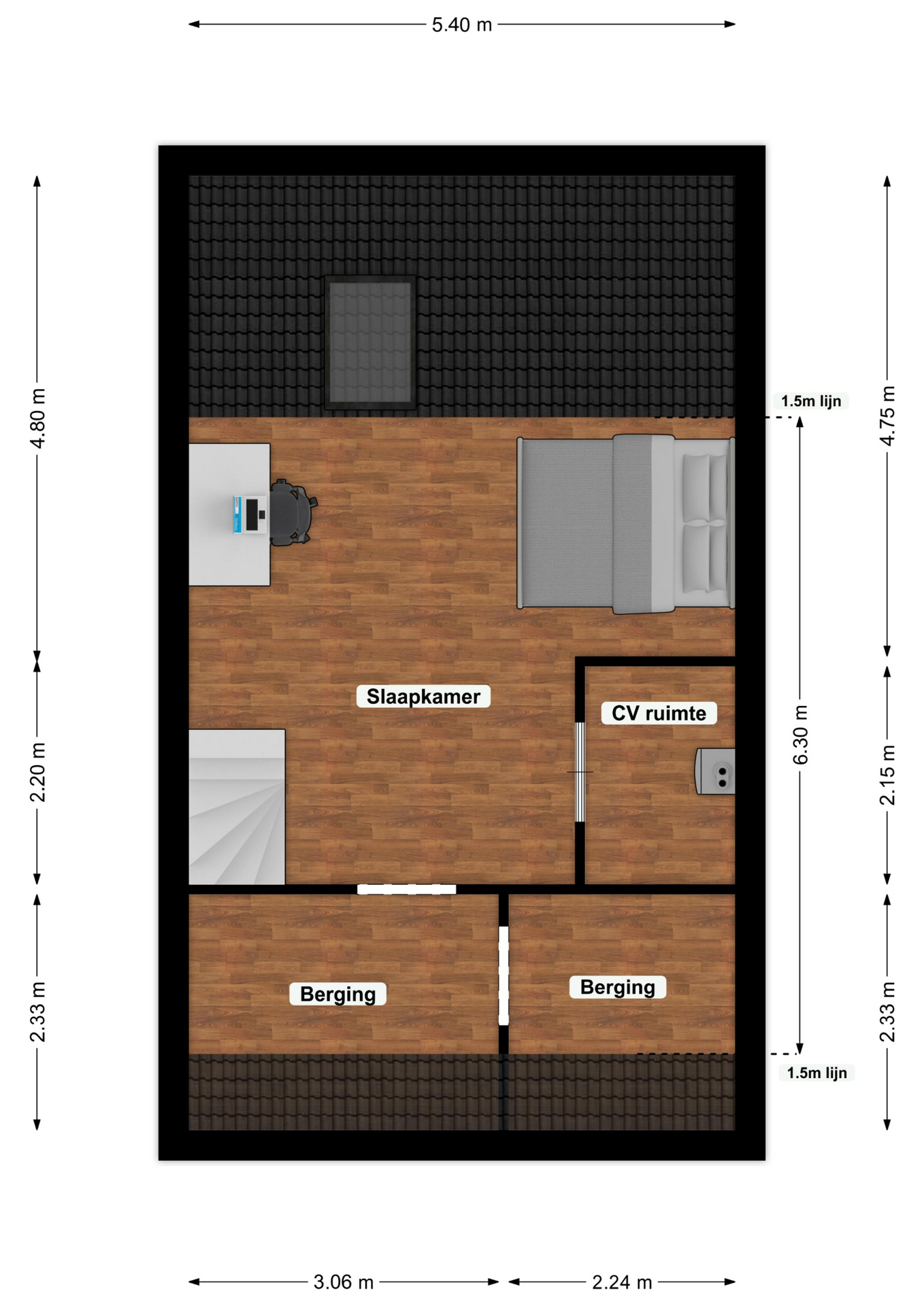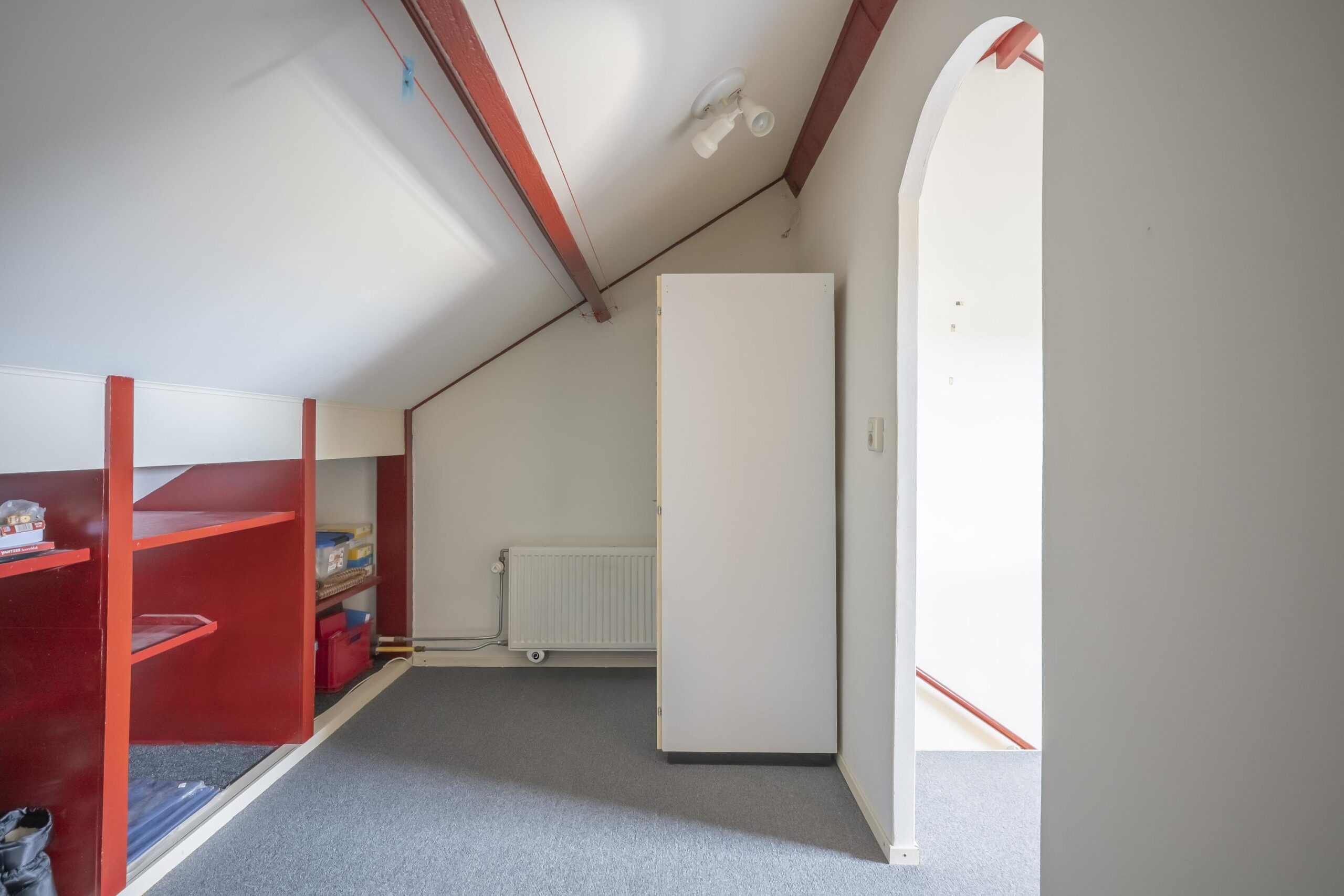 Via een vaste trap bereikt u de goed afgewerkte zolderverdieping, met veel bergruimte en een grote ruimte met Velux-dakraam, geschikt als slaap- of hobbykamer. Daarnaast is er een separate cv-ruimte met de combi-HR-ketel (Nefit, huur).