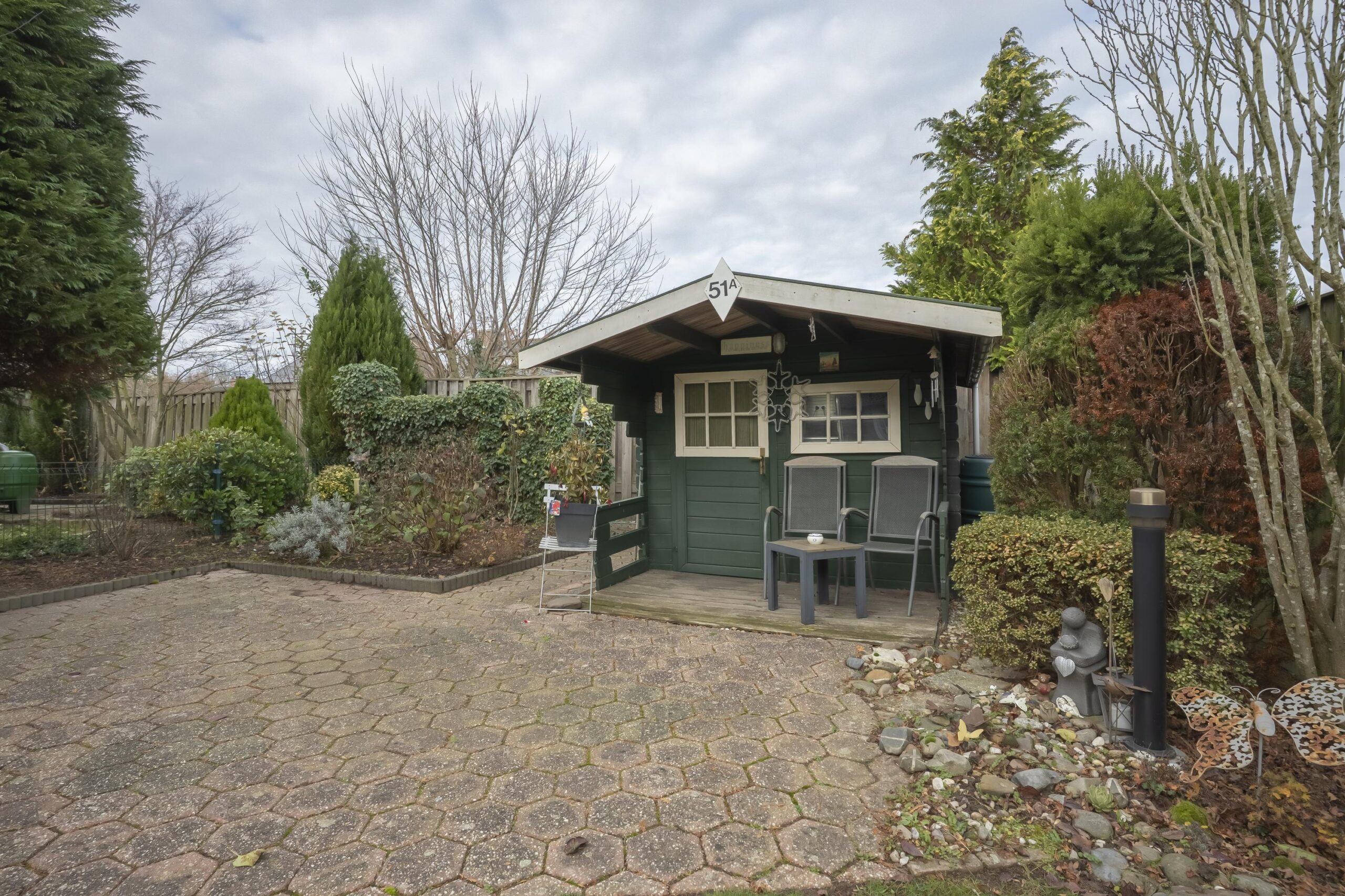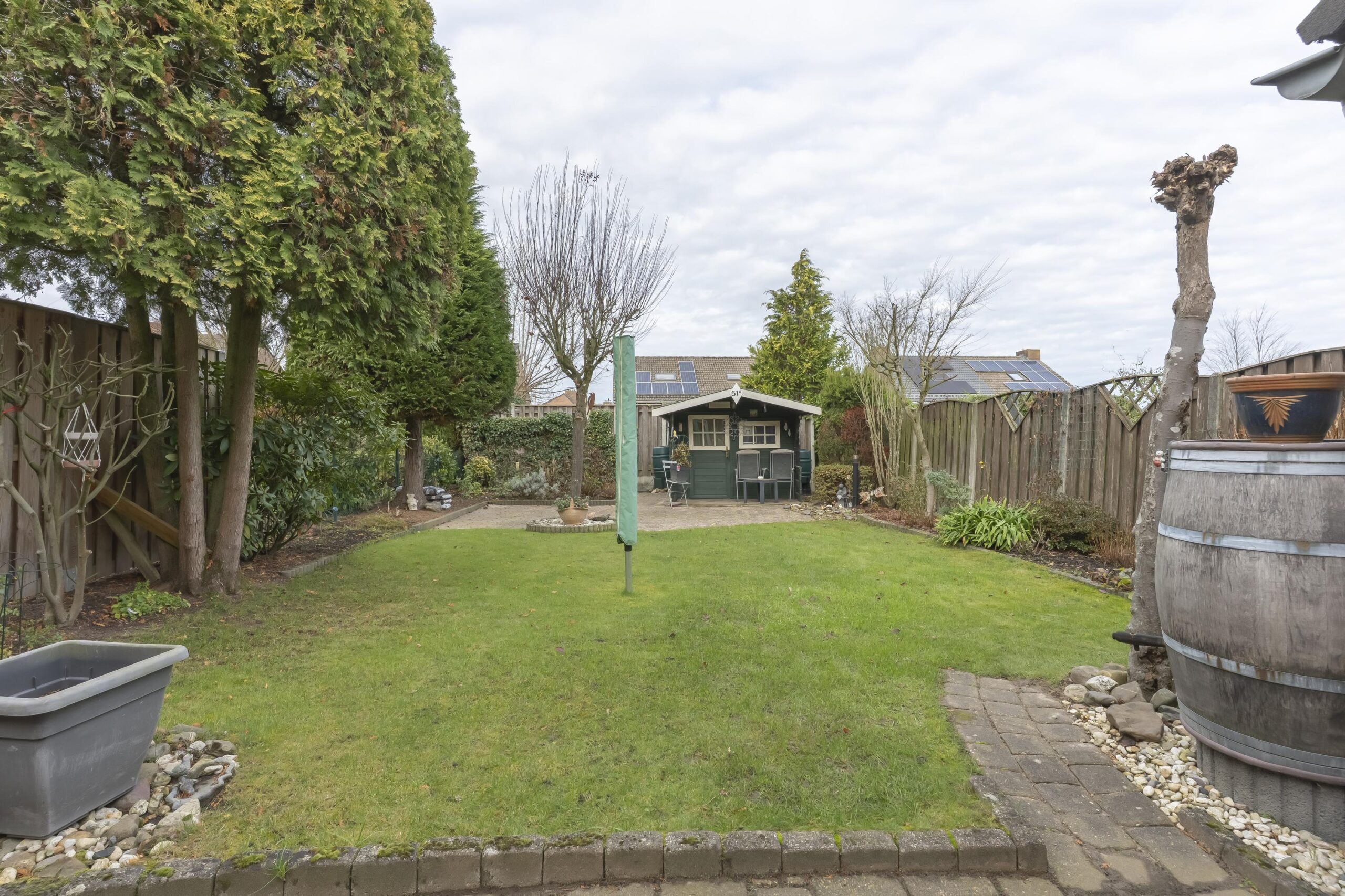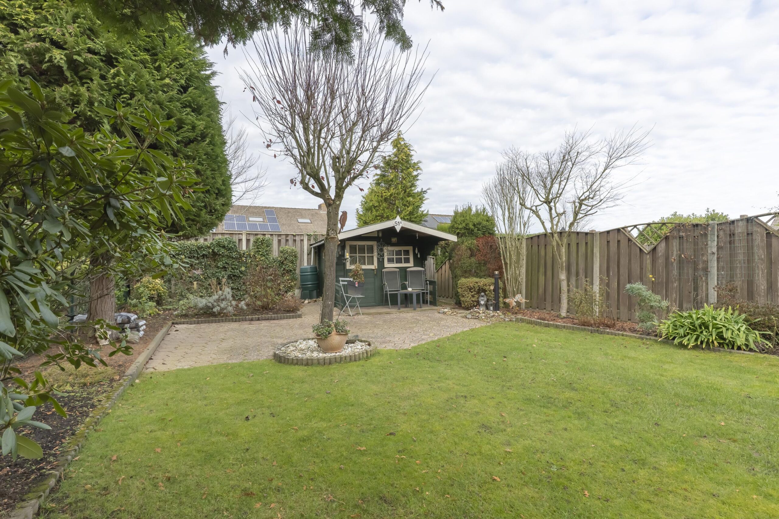 Via zowel de woonkamer als de garage heeft u toegang tot de ruime, geheel omsloten en zonnige tuin, met diverse terrassen, een tuinhuis, goede bezonning en optimale privacy (ca. 140m²).