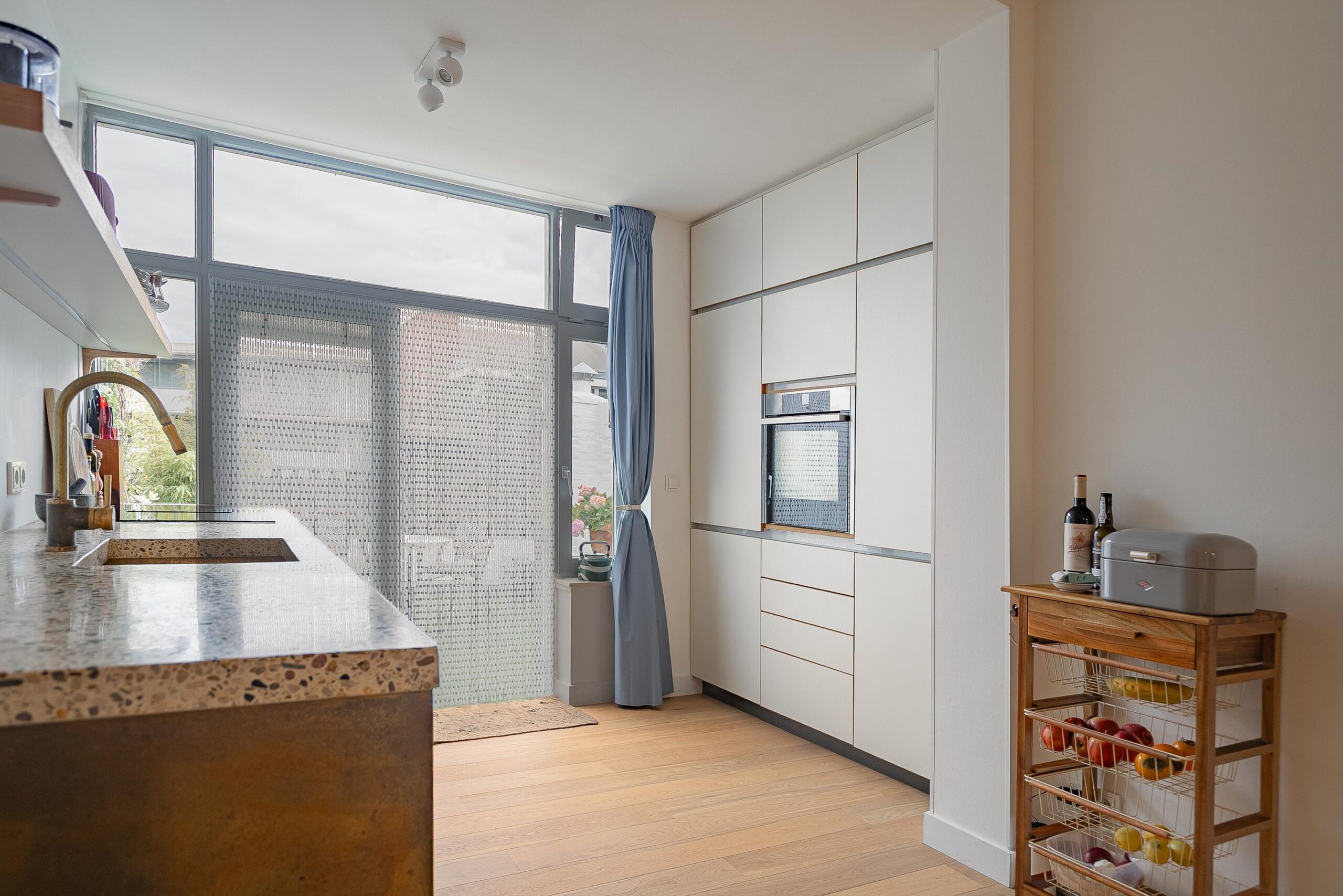 Middels moderne stalen schuifdeuren bereikt men de woon-/ eetkamer (ca. 26.5m²) met veel lichtinval en toegang tot de moderne open keuken. De keuken met kasten aan weerszijden (ca. 9m²) is voorzien van een koelkast, diepvries, vaatwasser, inductiekookplaat met vier zones en geïntegreerde afzuiging en een combi hetelucht oven. Daarbij is er vanuit de keuken toegang tot het dakterras. Dit dakterras (ca. 15m²) is voorzien van kunstgras en water- en elektrapunten. De gehele eerste verdieping is voorzien van vloerverwarming en een fraaie eikenhouten parketvloer.
