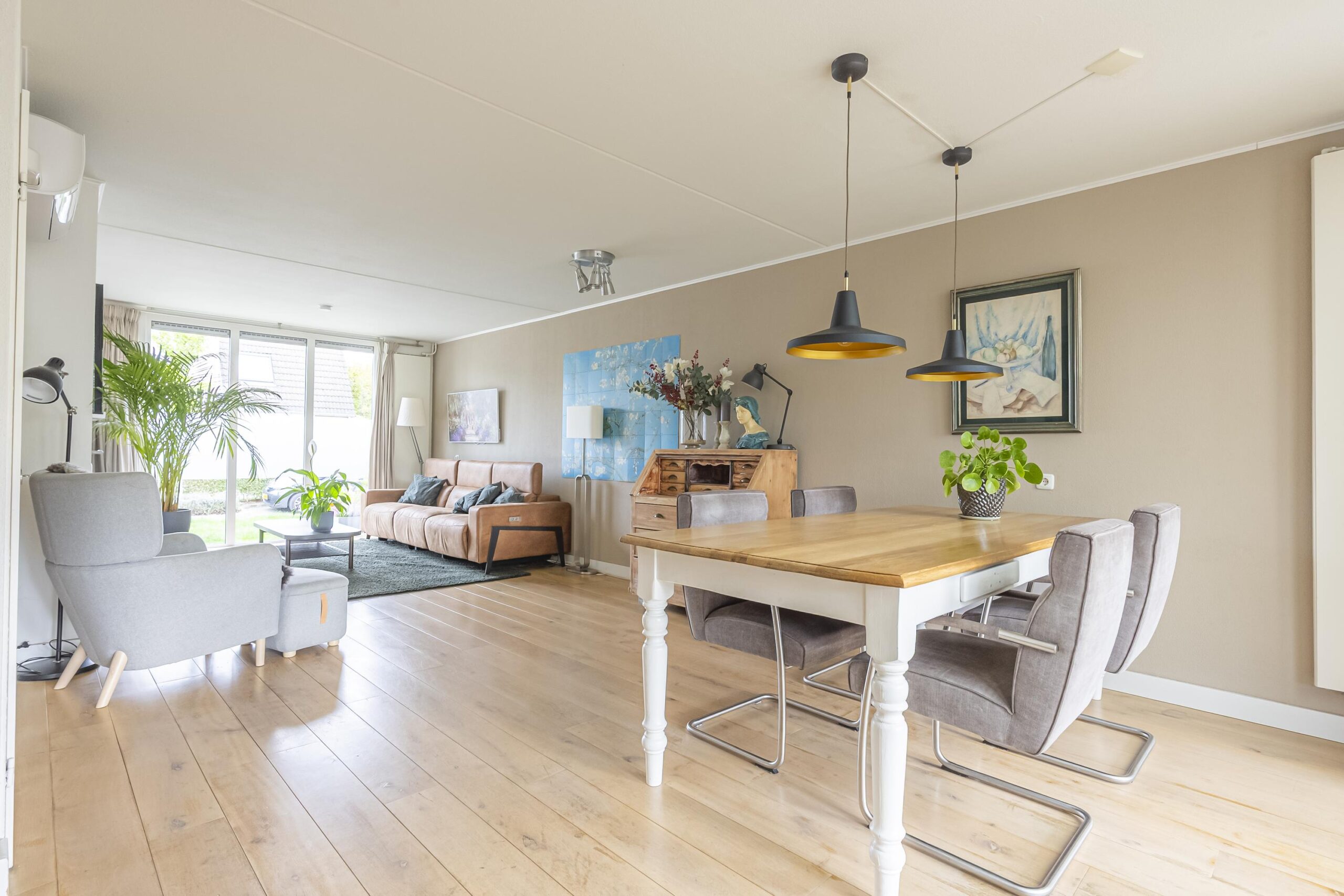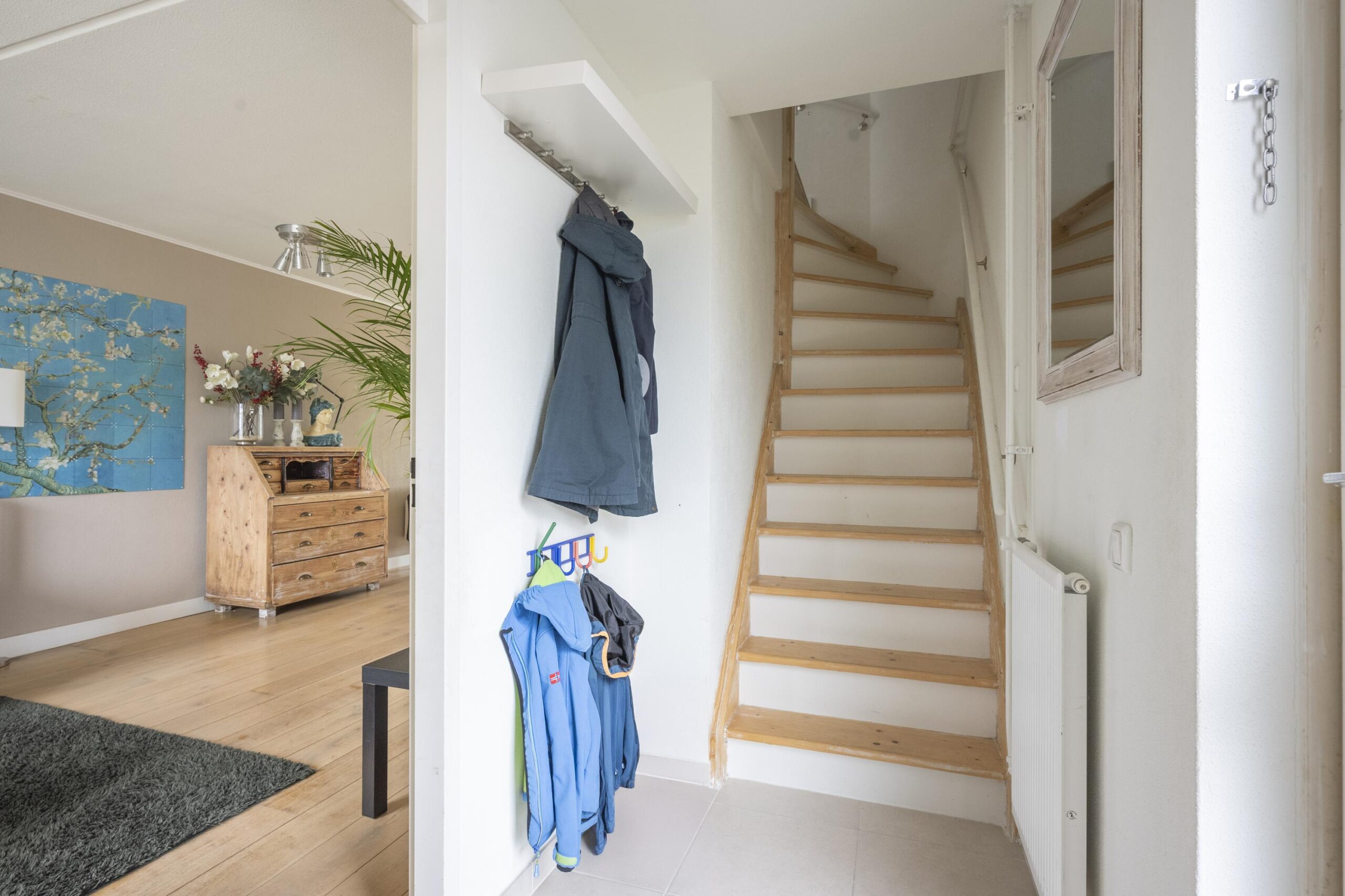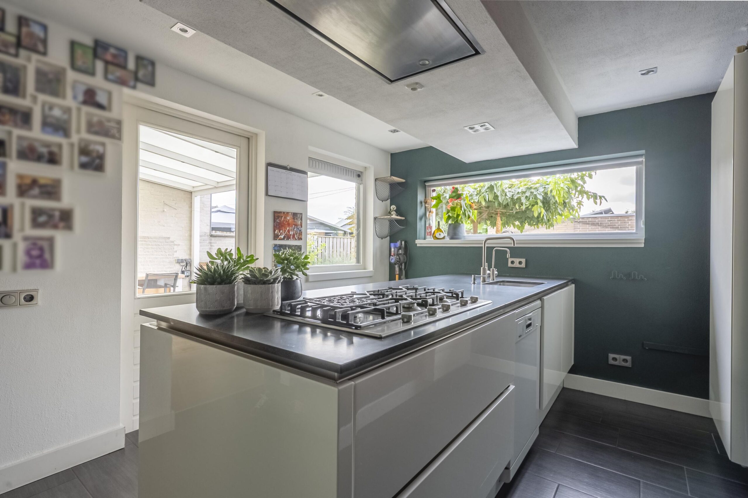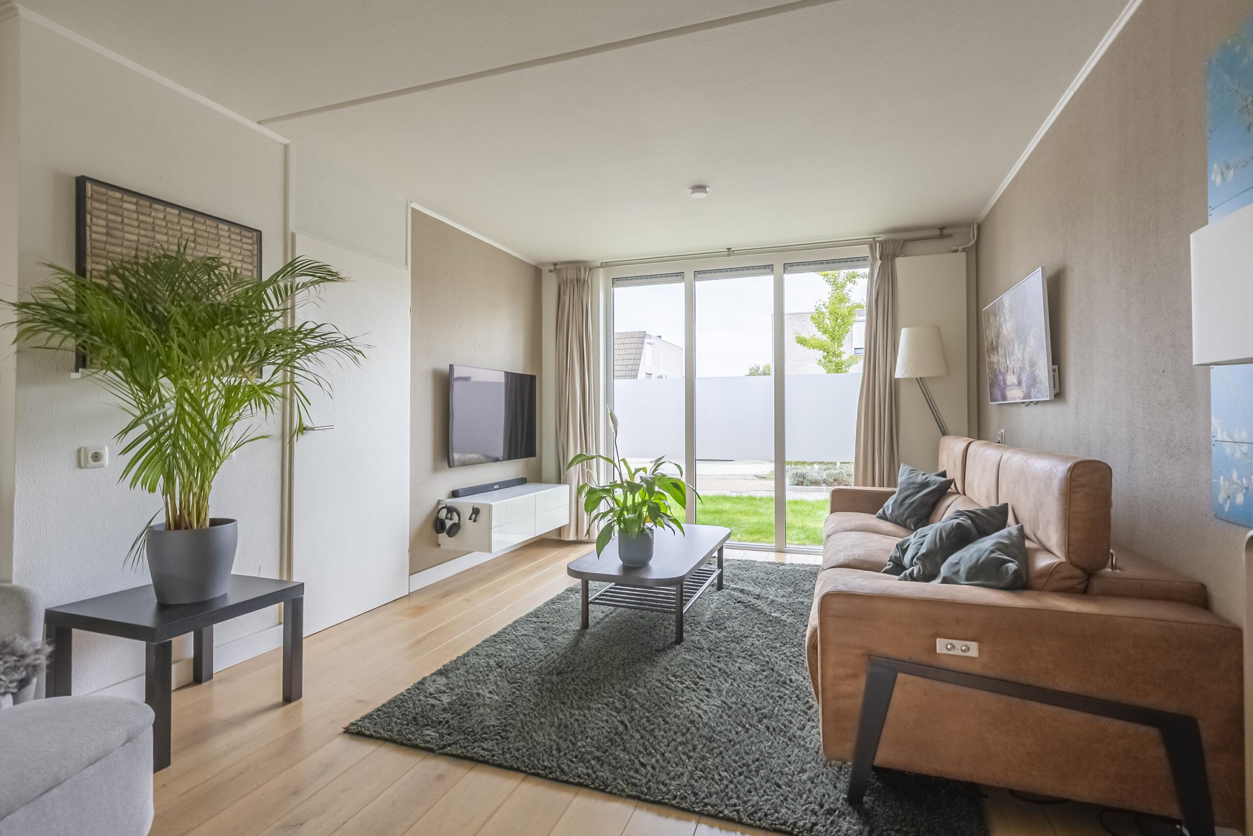 Begane grond: voortuin, oprit, entree, hal met plavuizenvloer, moderne meterkast, geheel betegeld zwevend toilet met fonteintje en trappenhuis. De woonkamer heeft een parketvloer, een bergkast onder de trap, airco-installatie en openslaande deuren naar de tuin. De keuken bevindt zich in de aanbouw achter de garage, heeft een tegelvloer en een moderne keuken-installatie met kookeiland en de navolgende apparatuur; koelkast, afzuigkap, vaatwasser, heteluchtoven met stoomfunctie, kookplaat en koffieapparaat. Vanuit hier is de garage inpandig bereikbaar. De garage heeft tevens een wasmachine-aansluiting, wordt verwarmd door een radiator, biedt plaats aan de C.V.-opstelling en is ook ideaal voor stalling en berging.