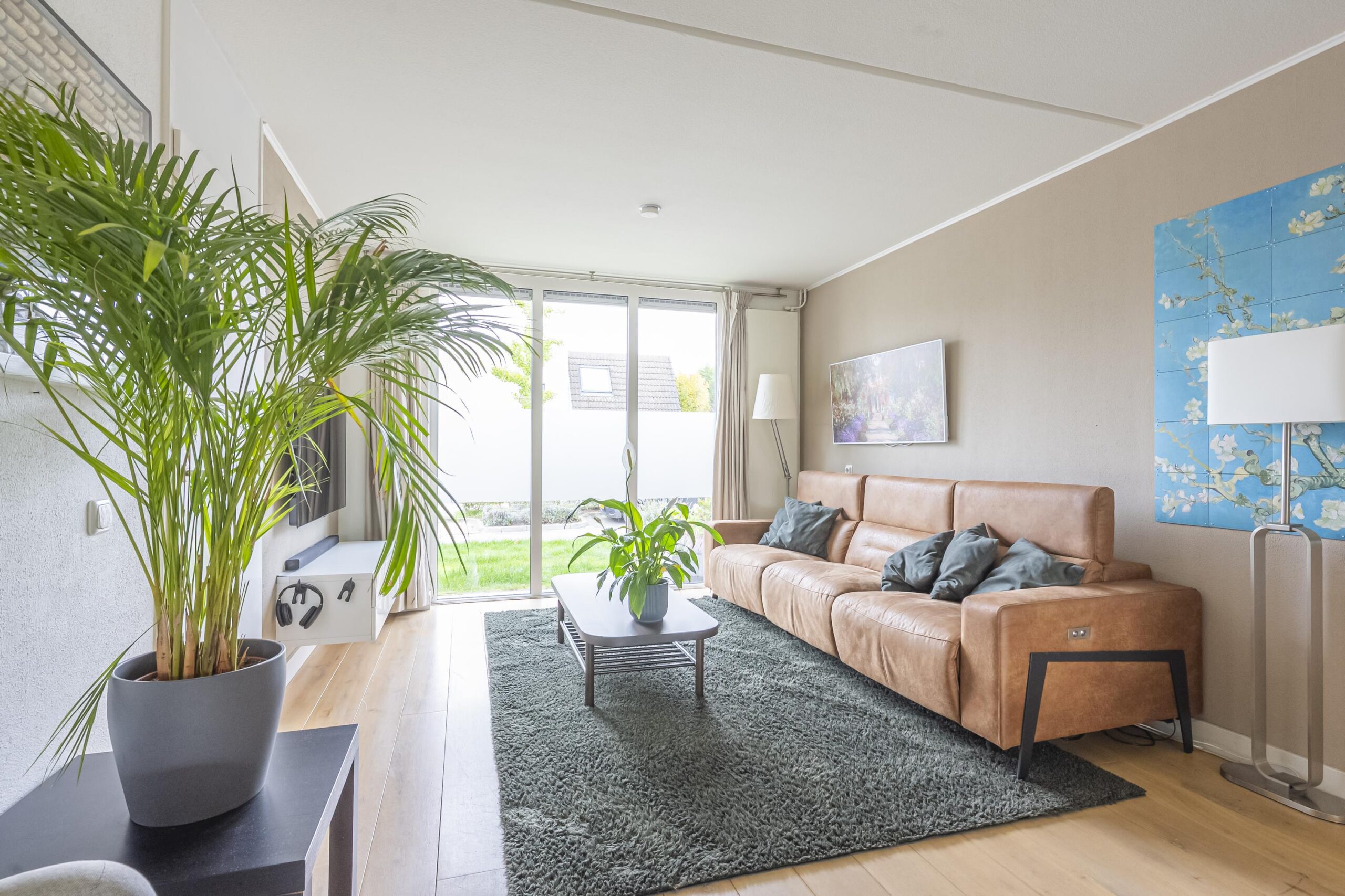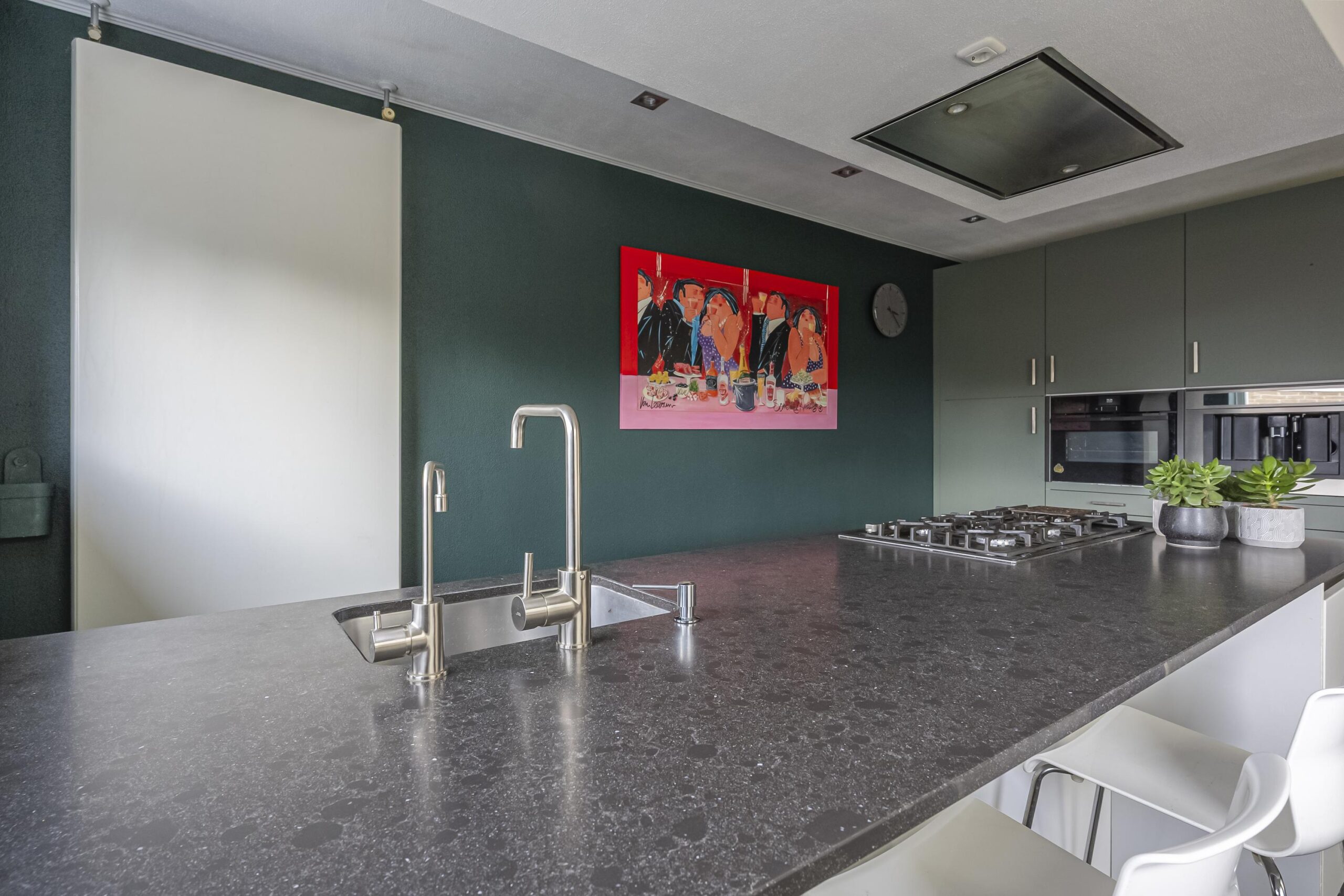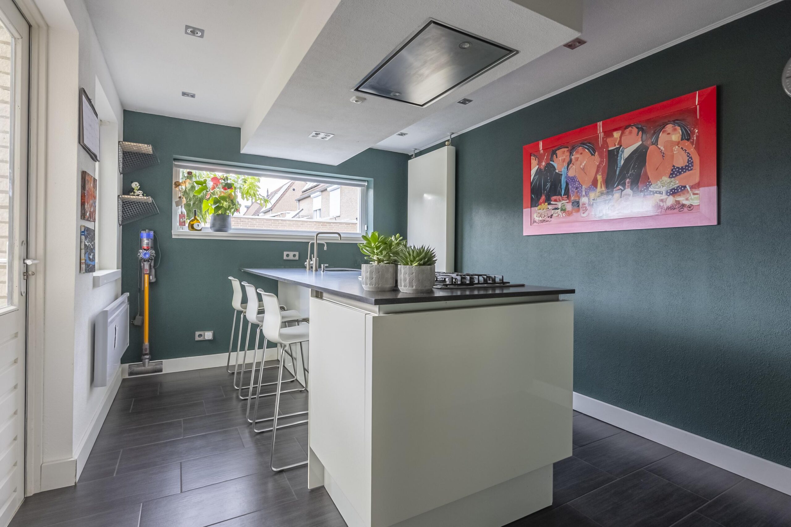 Begane grond: voortuin, oprit, entree, hal met plavuizenvloer, moderne meterkast, geheel betegeld zwevend toilet met fonteintje en trappenhuis. De woonkamer heeft een parketvloer, een bergkast onder de trap, airco-installatie en openslaande deuren naar de tuin. De keuken bevindt zich in de aanbouw achter de garage, heeft een tegelvloer en een moderne keuken-installatie met kookeiland en de navolgende apparatuur; koelkast, afzuigkap, vaatwasser, heteluchtoven met stoomfunctie, kookplaat en koffieapparaat. Vanuit hier is de garage inpandig bereikbaar. De garage heeft tevens een wasmachine-aansluiting, wordt verwarmd door een radiator, biedt plaats aan de C.V.-opstelling en is ook ideaal voor stalling en berging.