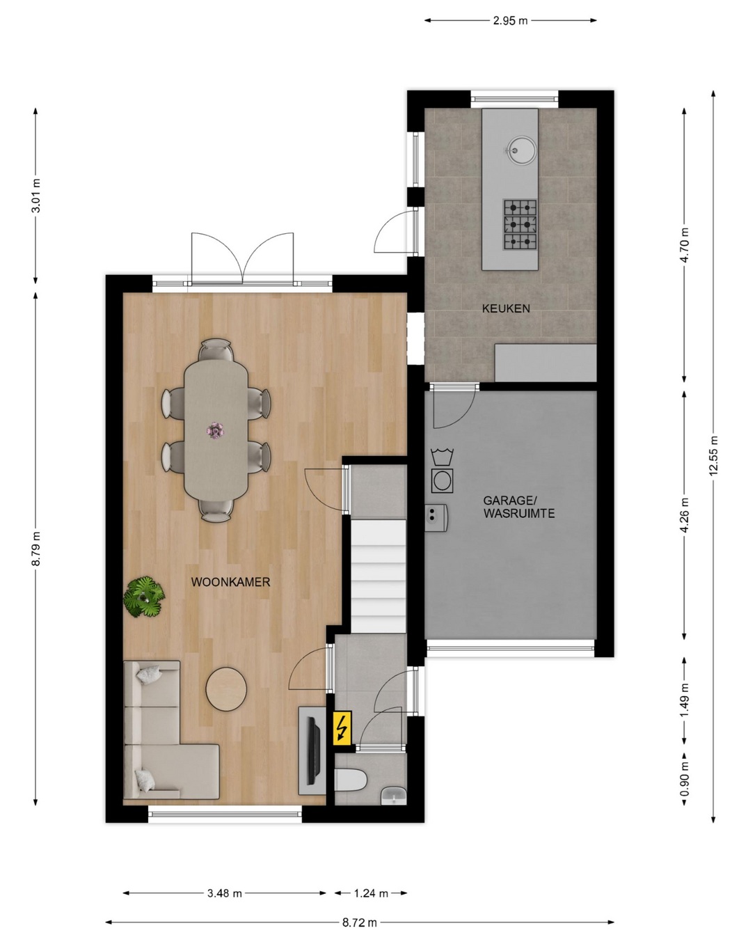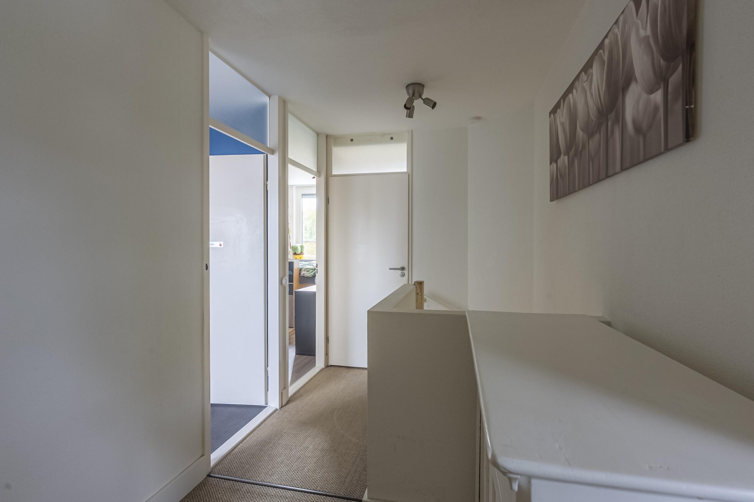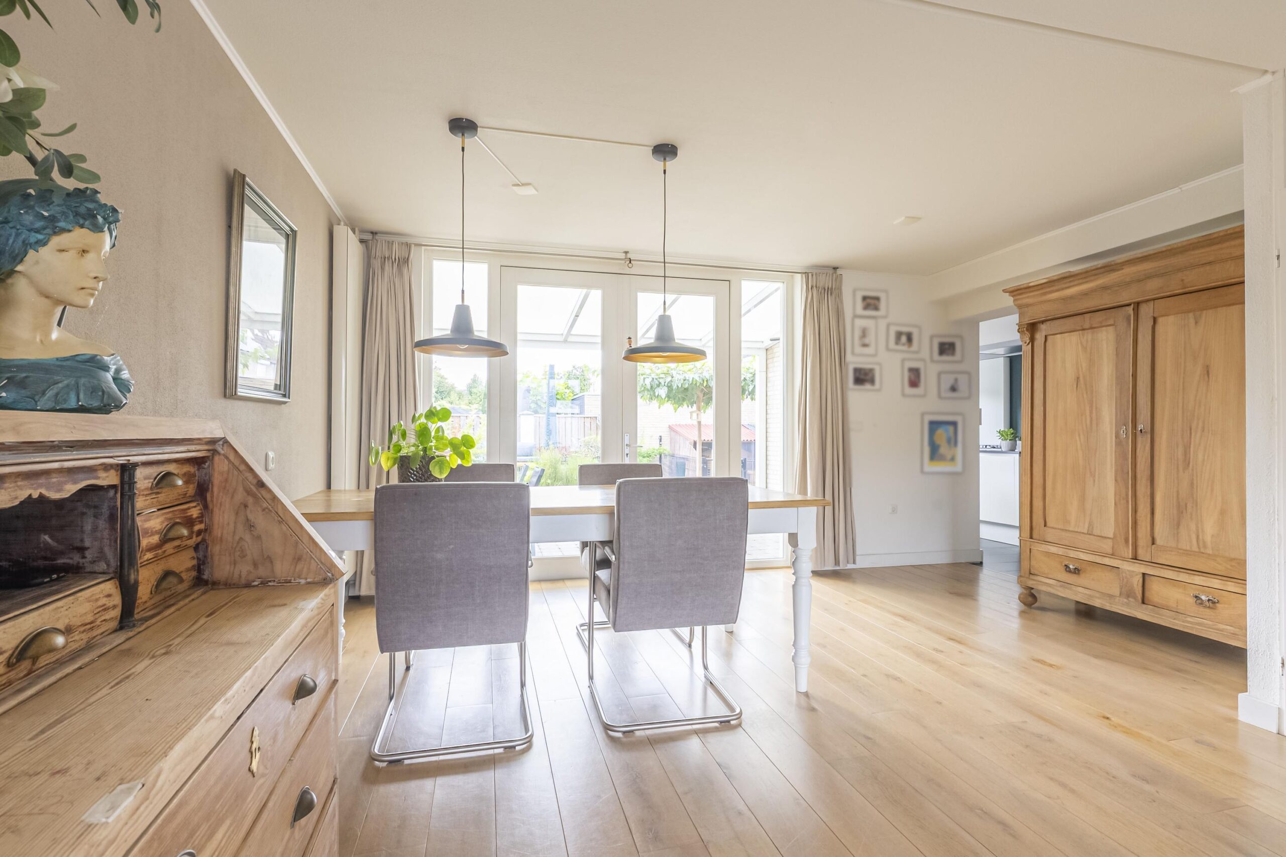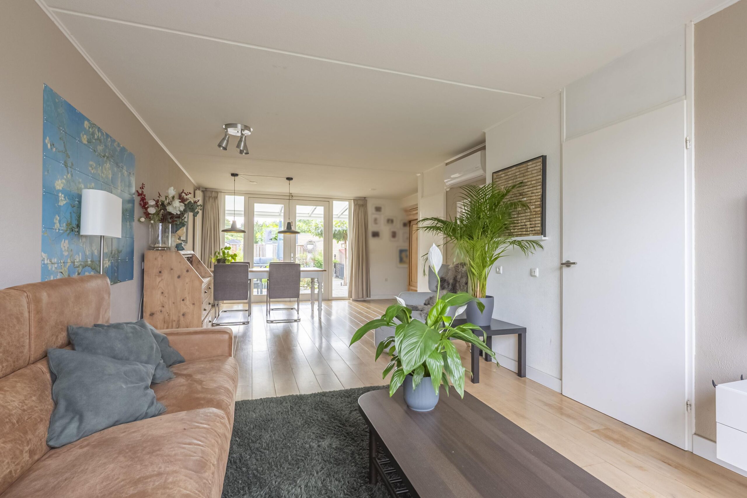 Begane grond: voortuin, oprit, entree, hal met plavuizenvloer, moderne meterkast, geheel betegeld zwevend toilet met fonteintje en trappenhuis. De woonkamer heeft een parketvloer, een bergkast onder de trap, airco-installatie en openslaande deuren naar de tuin. De keuken bevindt zich in de aanbouw achter de garage, heeft een tegelvloer en een moderne keuken-installatie met kookeiland en de navolgende apparatuur; koelkast, afzuigkap, vaatwasser, heteluchtoven met stoomfunctie, kookplaat en koffieapparaat. Vanuit hier is de garage inpandig bereikbaar. De garage heeft tevens een wasmachine-aansluiting, wordt verwarmd door een radiator, biedt plaats aan de C.V.-opstelling en is ook ideaal voor stalling en berging.
