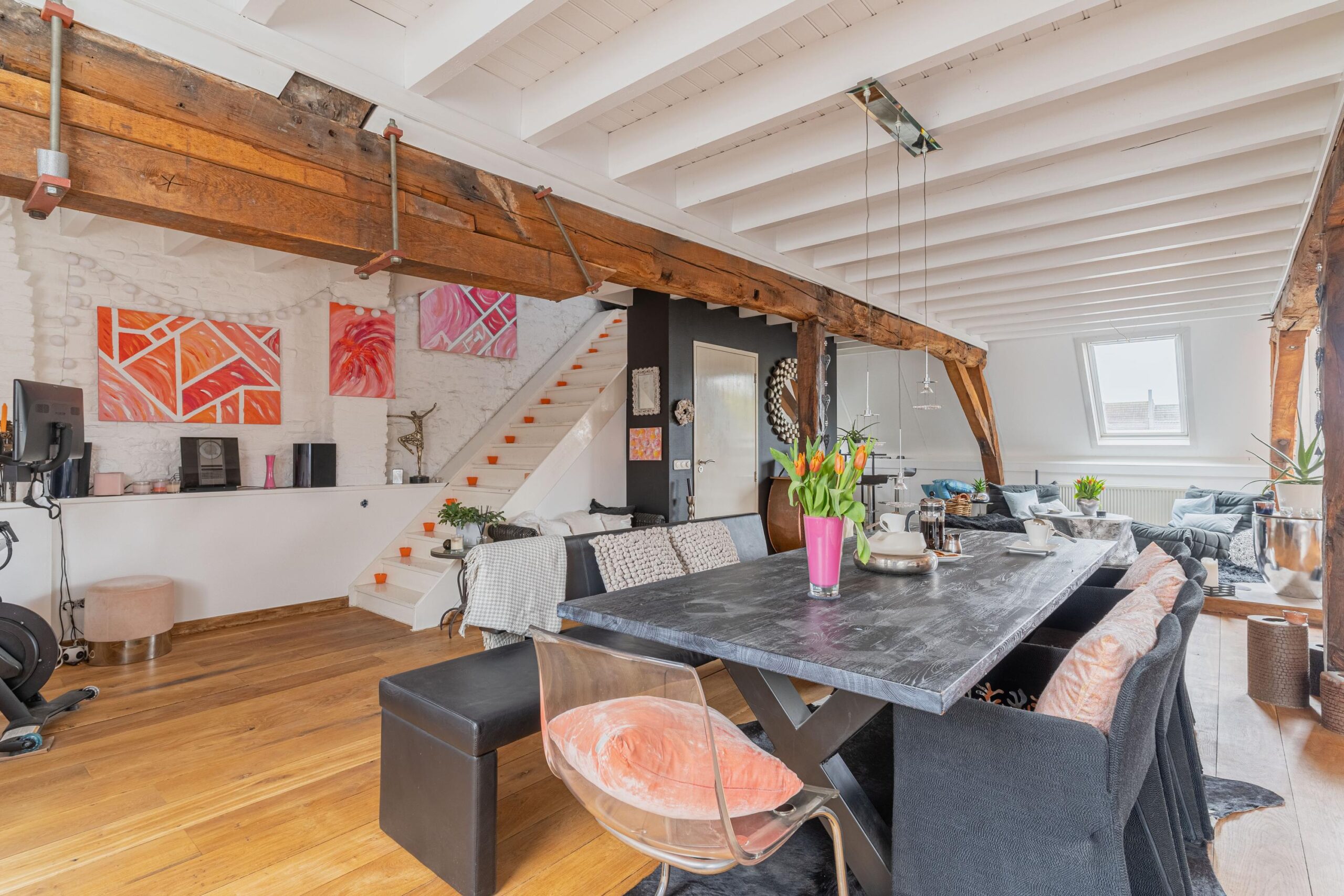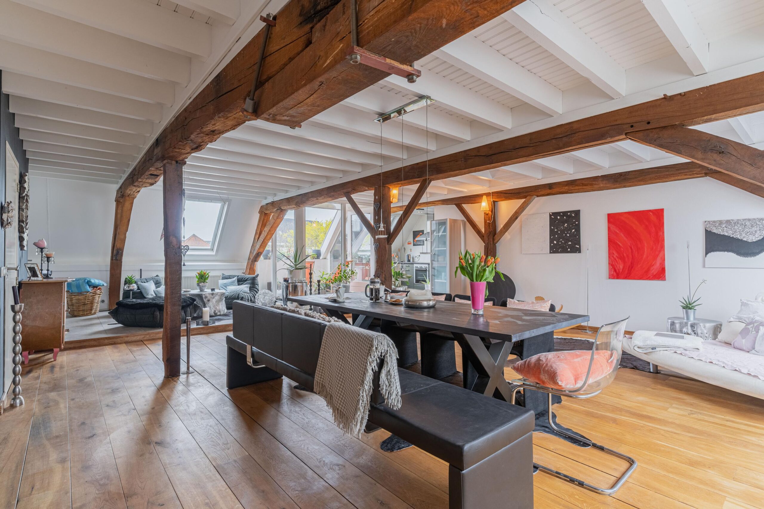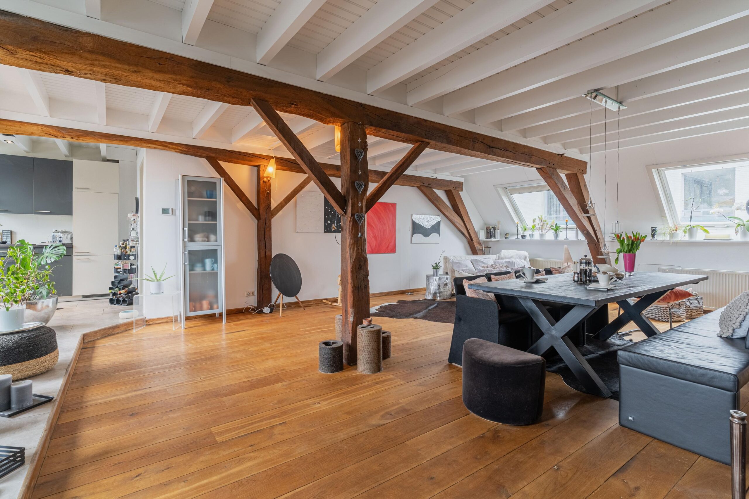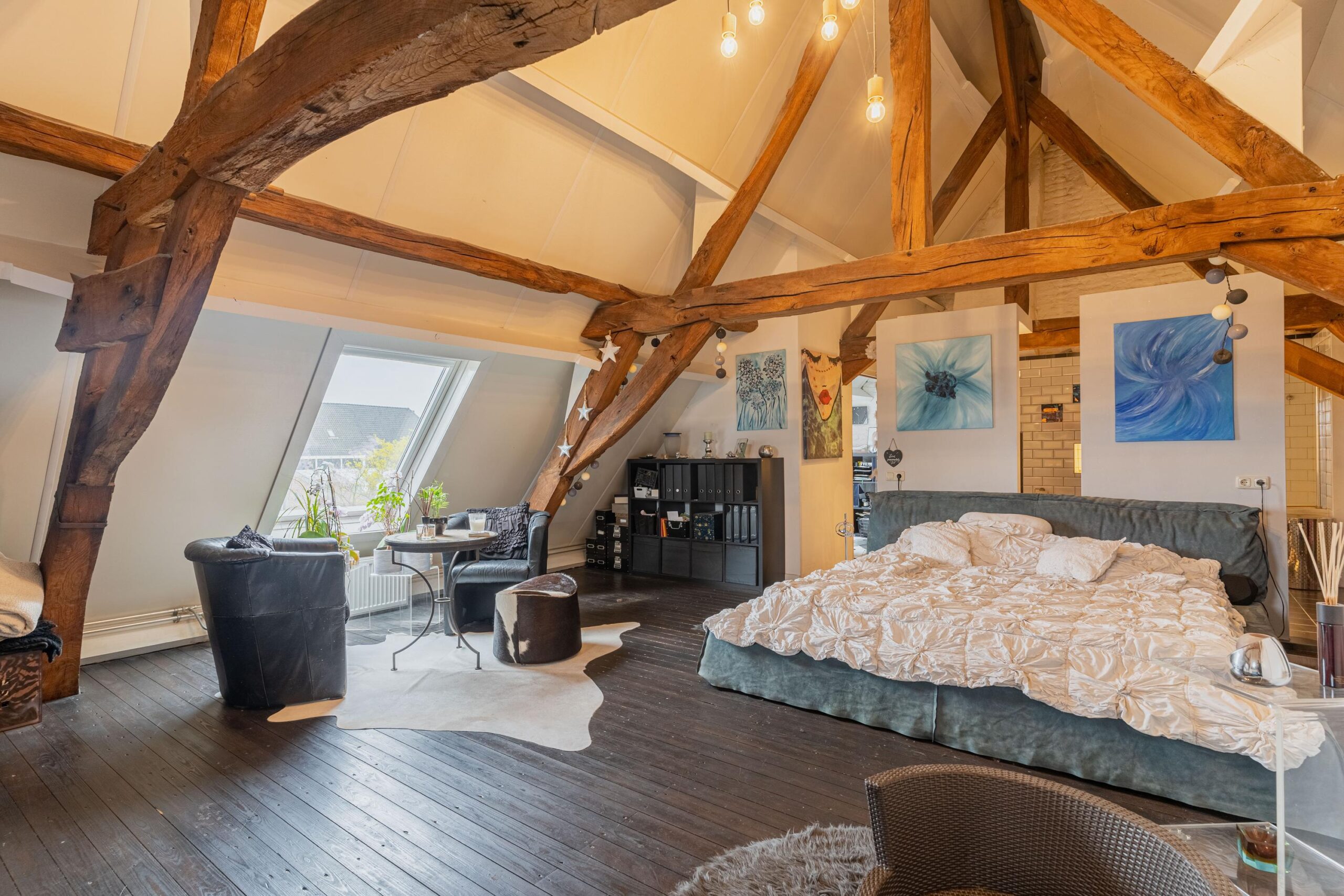 Via de vaste trap in de woonkamer is de verdieping bereikbaar. Hier bevindt zich een royale masterbedroom, waar je de beschikking hebt over een heuse walk-in-closet. Op de vloer ligt een houten vloer. Door de zichtbare houten balkconstructie, voelt deze verdieping net zo sfeervol als de rest van het appartement.