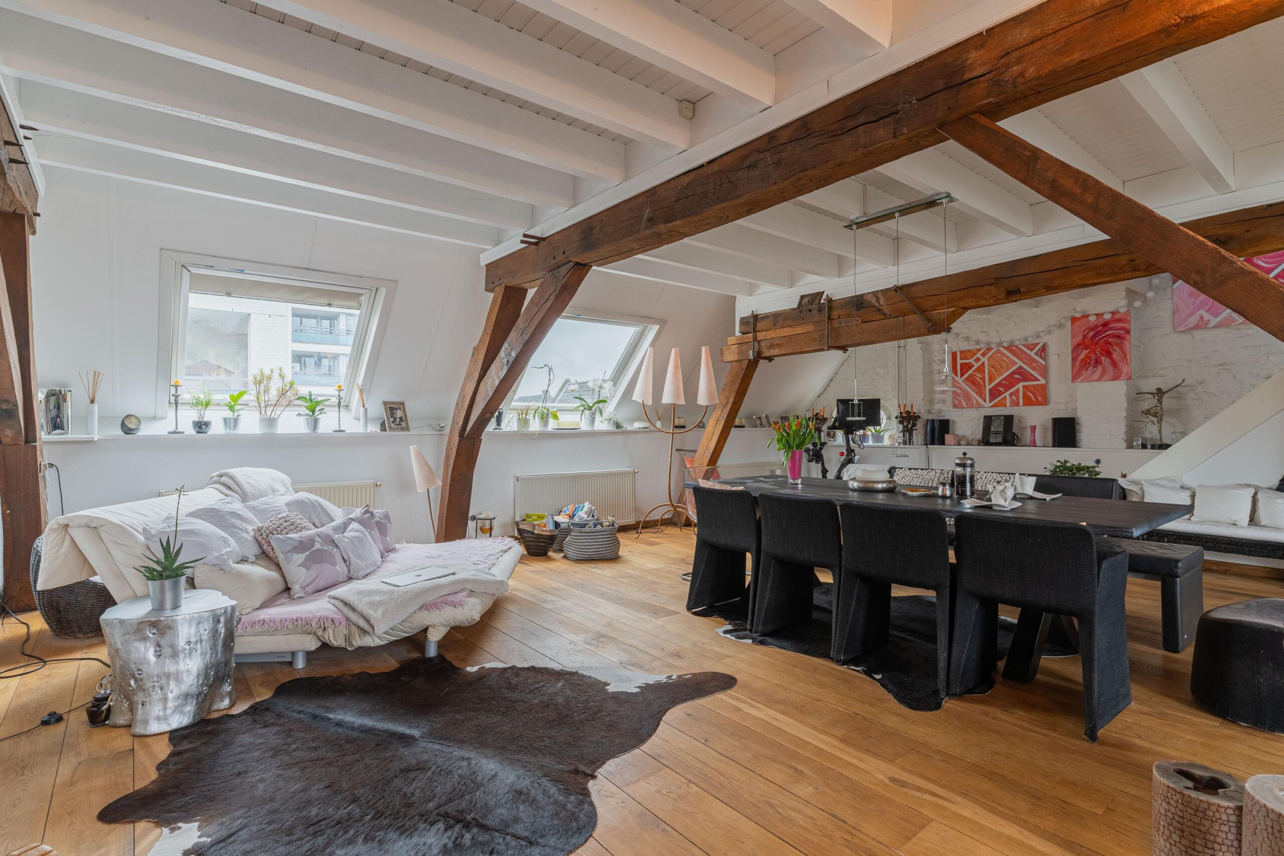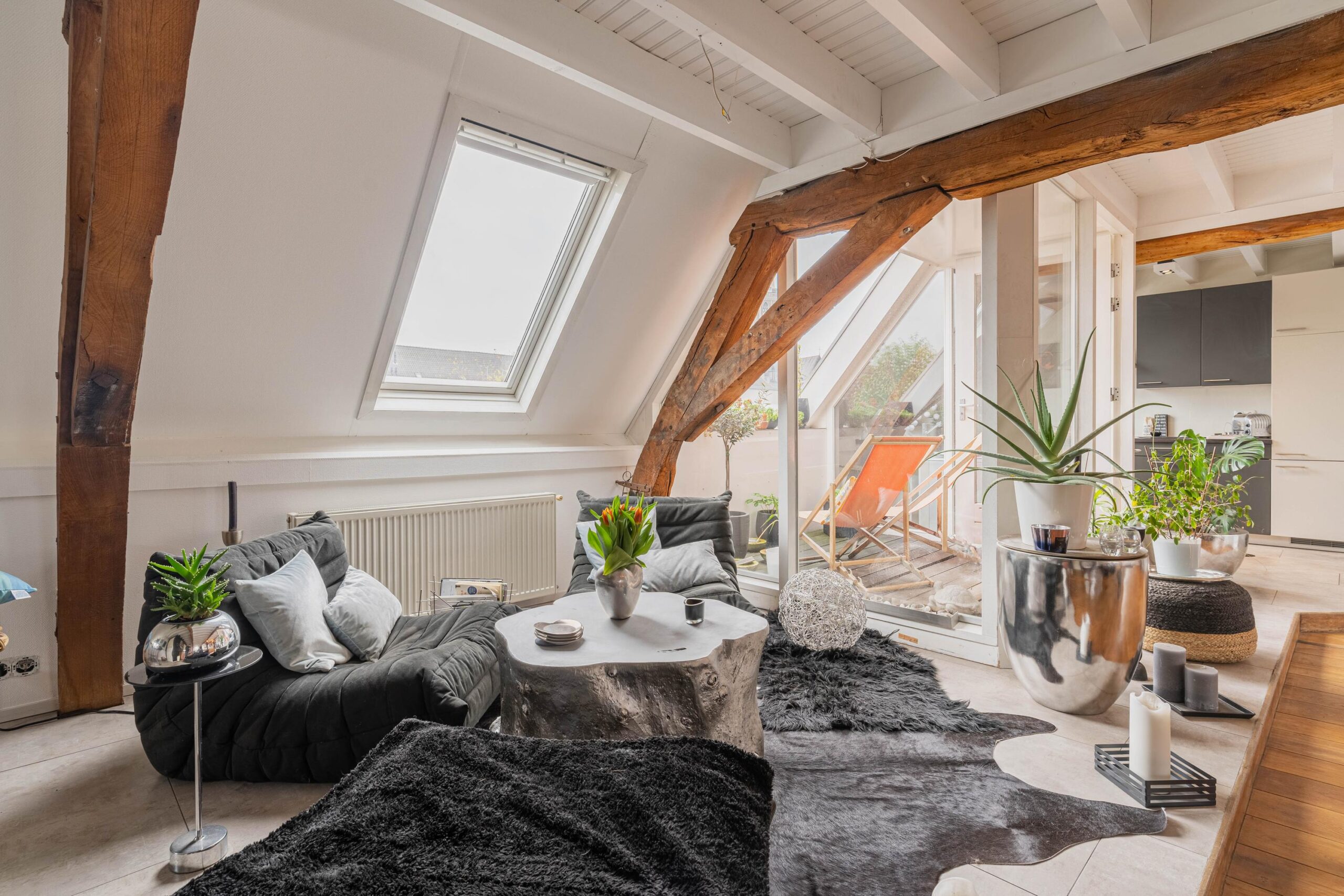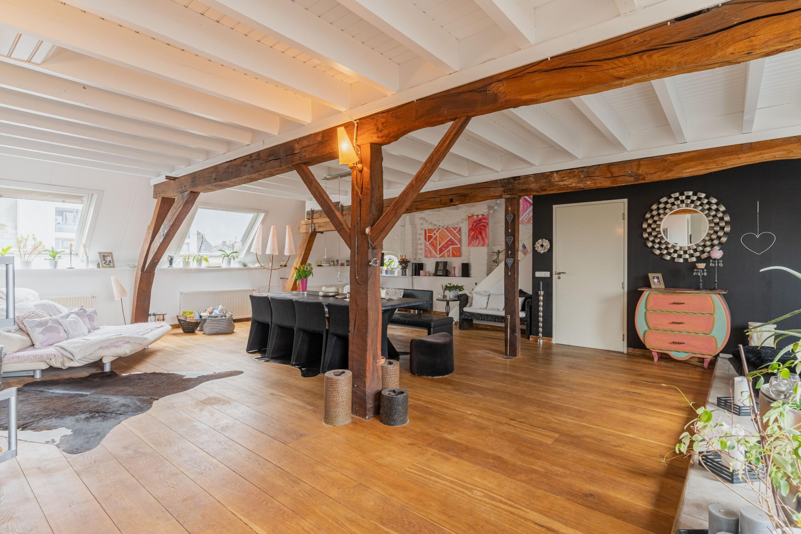 Via de vaste trap in de woonkamer is de verdieping bereikbaar. Hier bevindt zich een royale masterbedroom, waar je de beschikking hebt over een heuse walk-in-closet. Op de vloer ligt een houten vloer. Door de zichtbare houten balkconstructie, voelt deze verdieping net zo sfeervol als de rest van het appartement.
