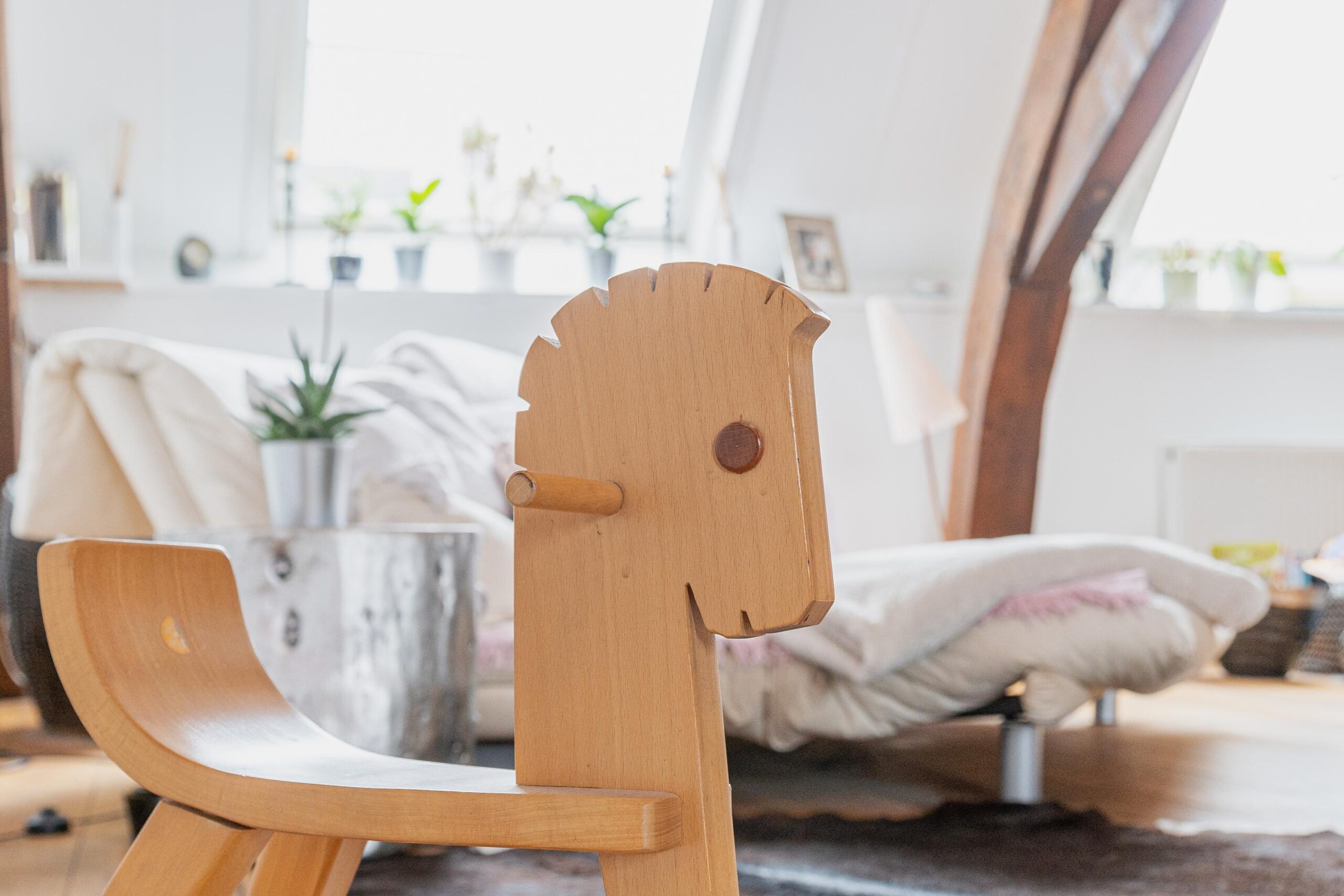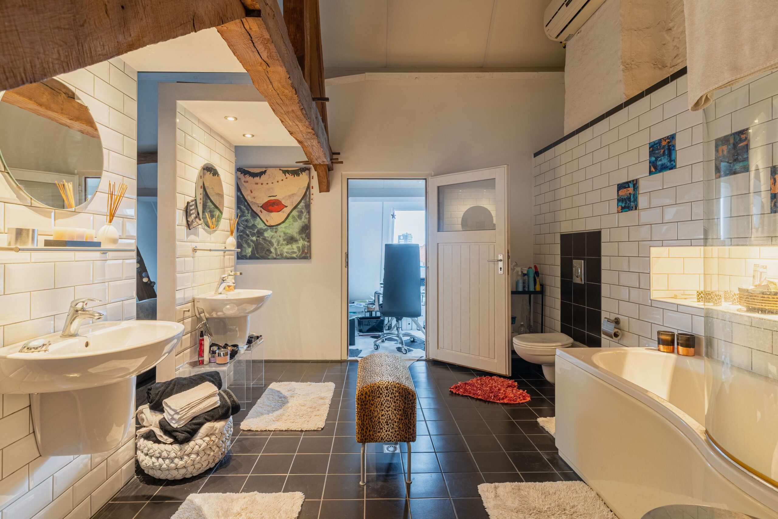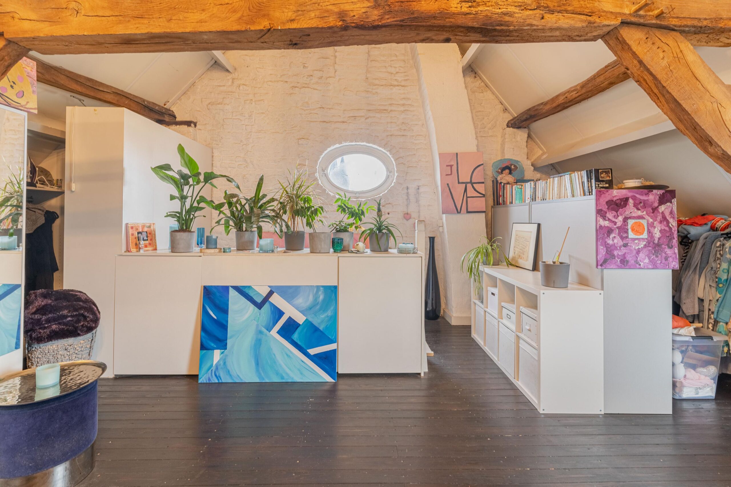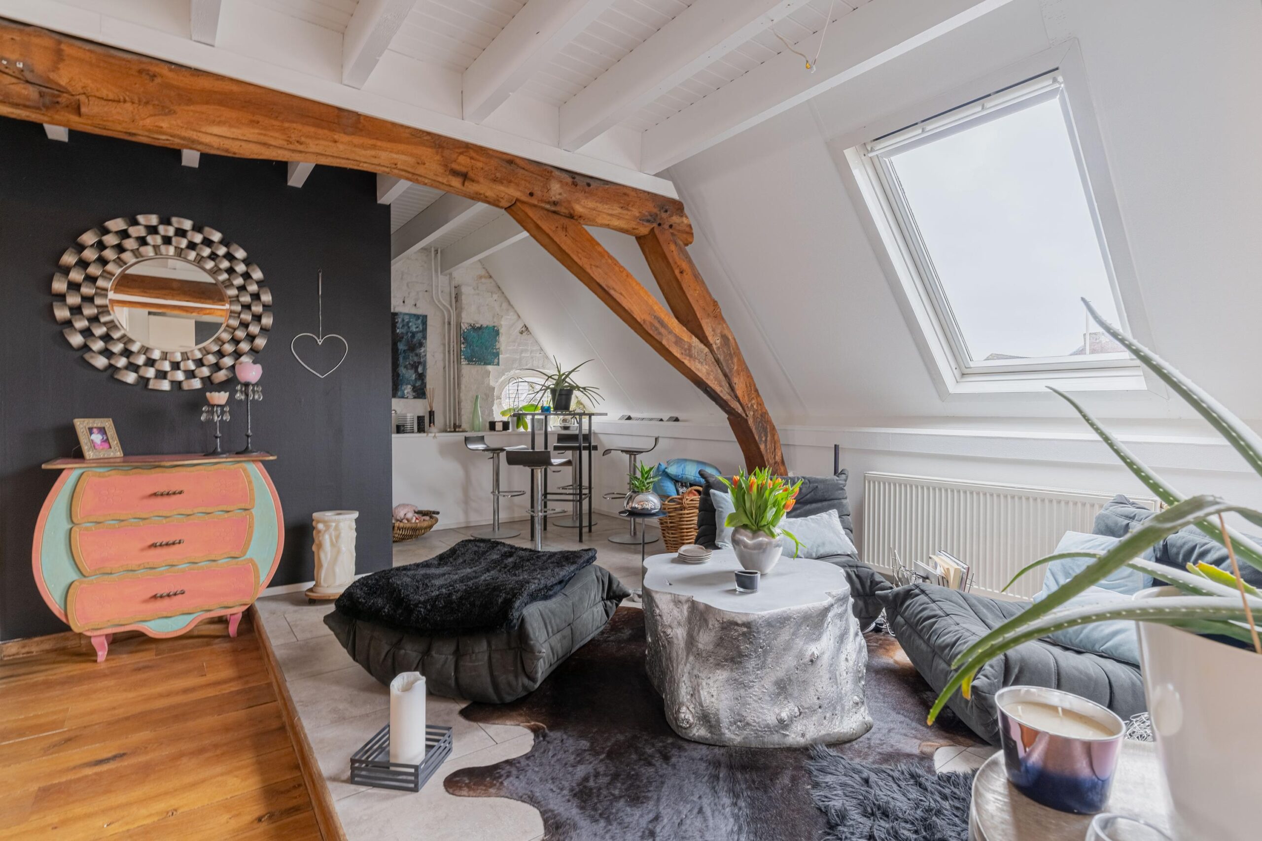 Via de vaste trap in de woonkamer is de verdieping bereikbaar. Hier bevindt zich een royale masterbedroom, waar je de beschikking hebt over een heuse walk-in-closet. Op de vloer ligt een houten vloer. Door de zichtbare houten balkconstructie, voelt deze verdieping net zo sfeervol als de rest van het appartement.
