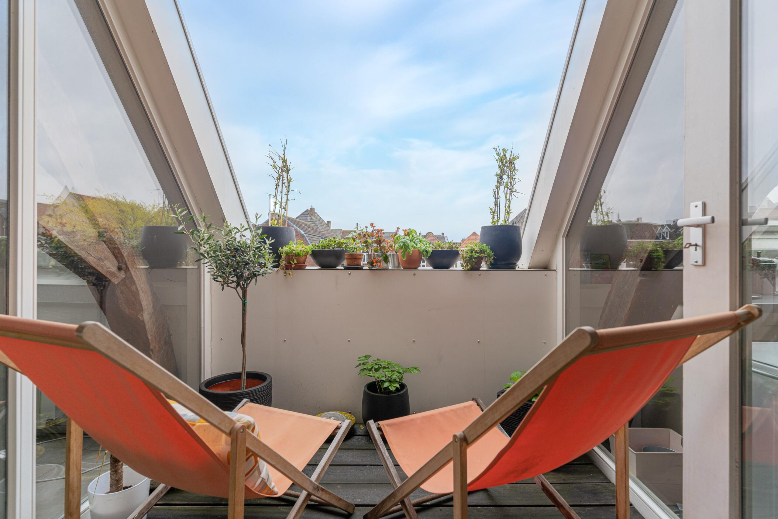 Centraal in het appartement is de loggia gerealiseerd. Deze is gelegen op het zuiden en voorzien van een hardhouten vlondervloer. Dit is een fijn plekje om even rustig te genieten van het leuke uitzicht. Door de vele raampartijen is er veel lichtinval in alle woongedeelten.