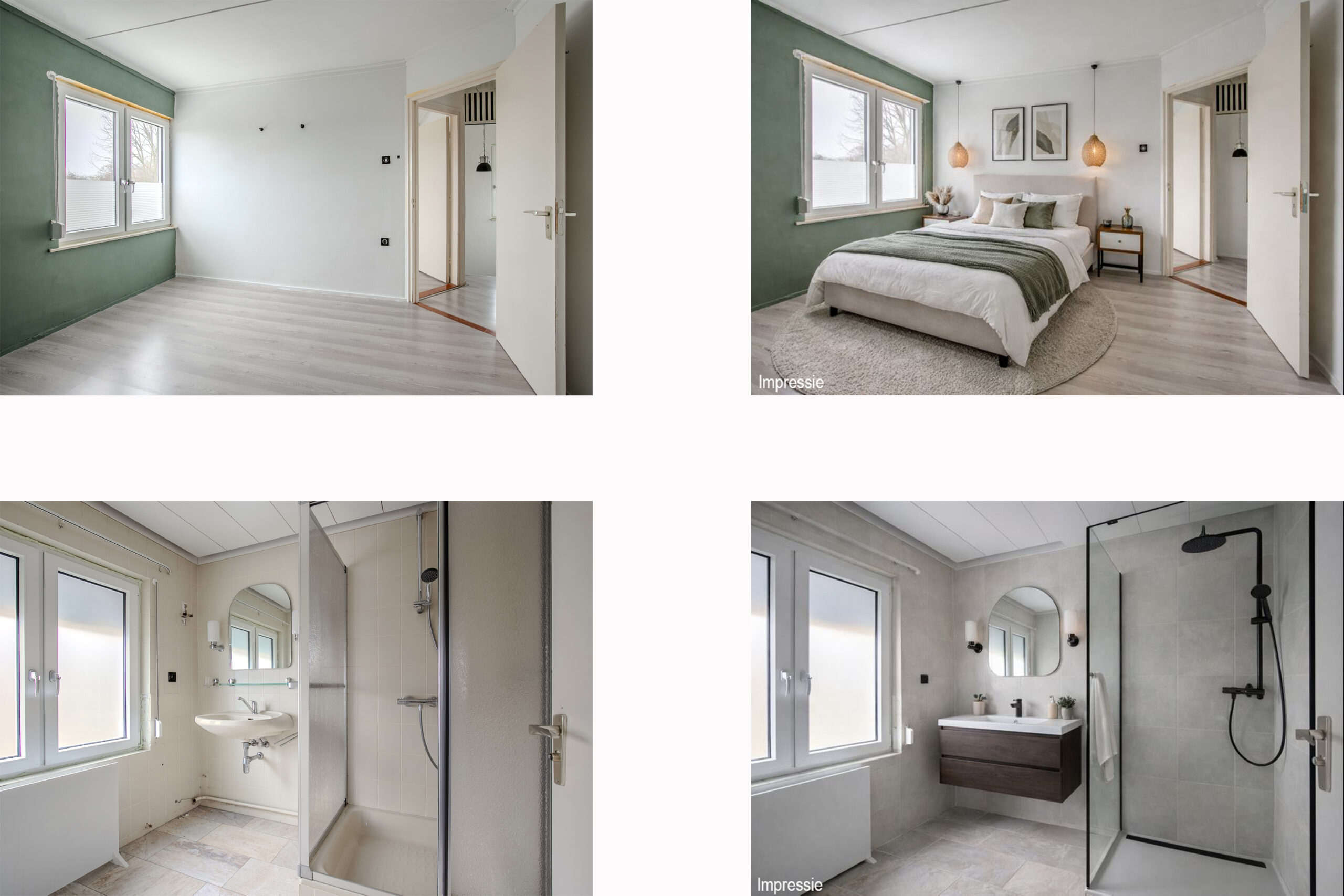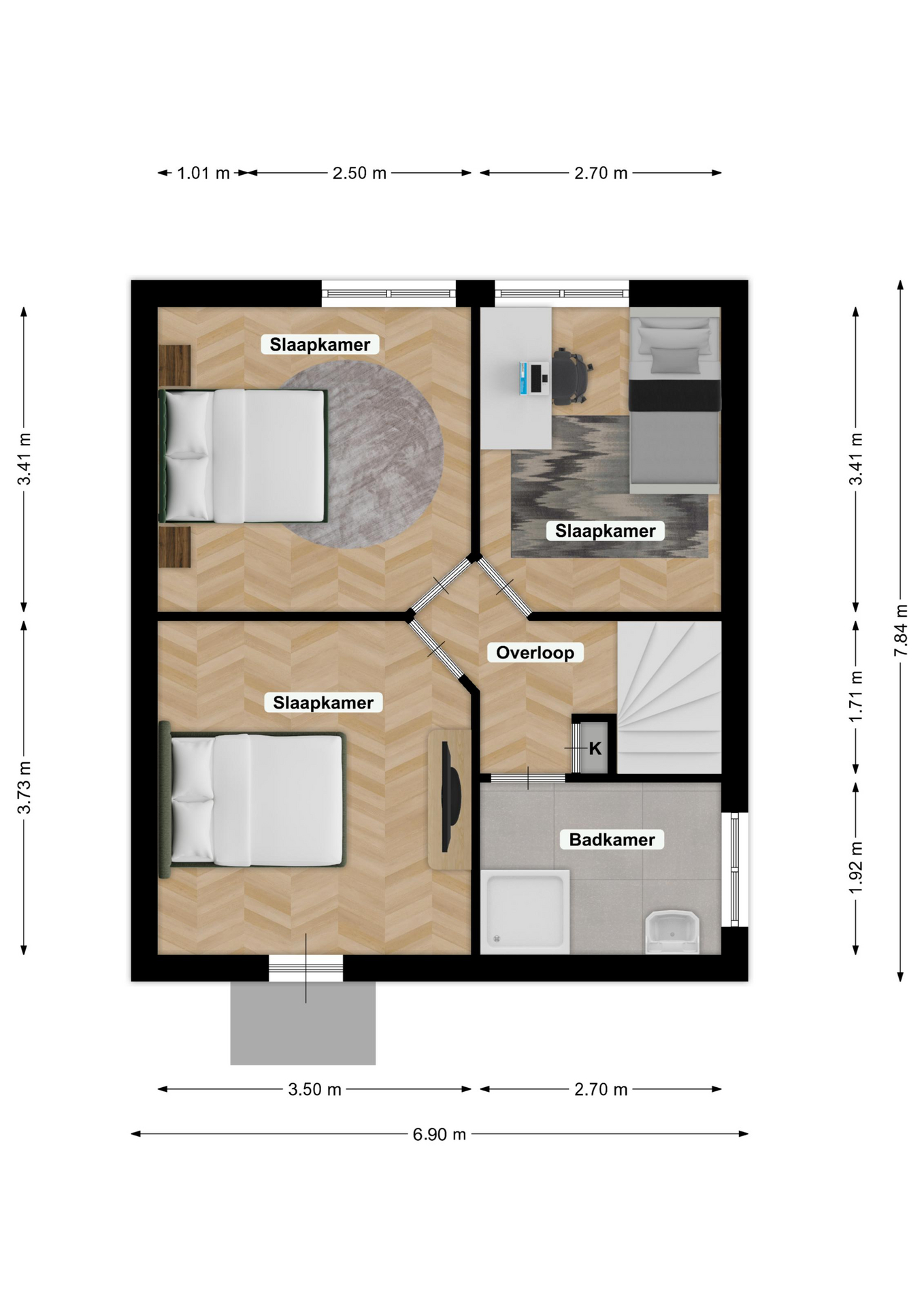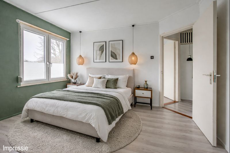 Overloop met toegang tot drie slaapkamers. Alle slaapkamers zijn afgewerkt met een lichte laminaatvloer en voorzien van handmatig bedienbare rolluiken. De afmetingen zijn respectievelijk: