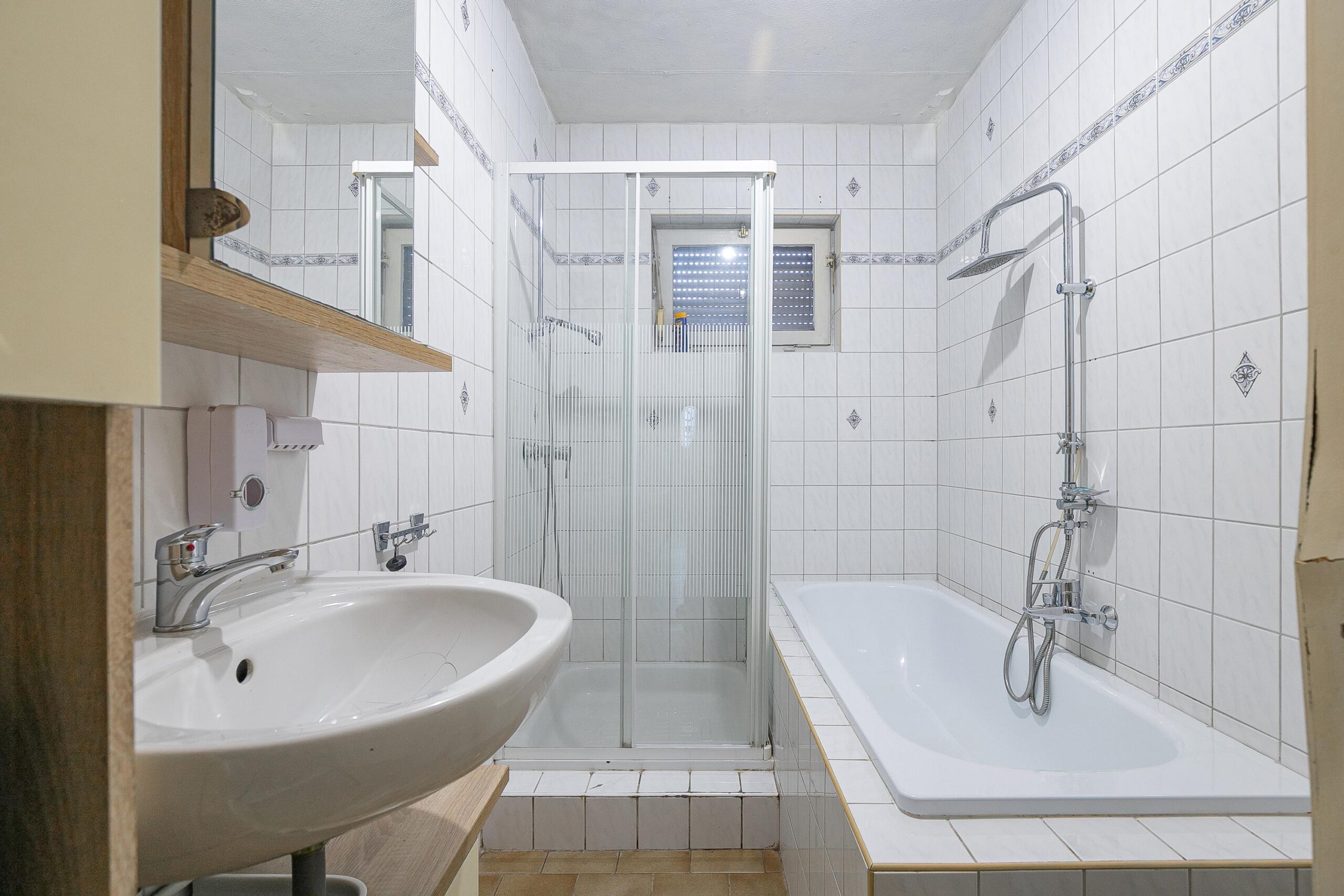 Betegelde badkamer met ligbad, vaste wastafel en vaste wastafel.