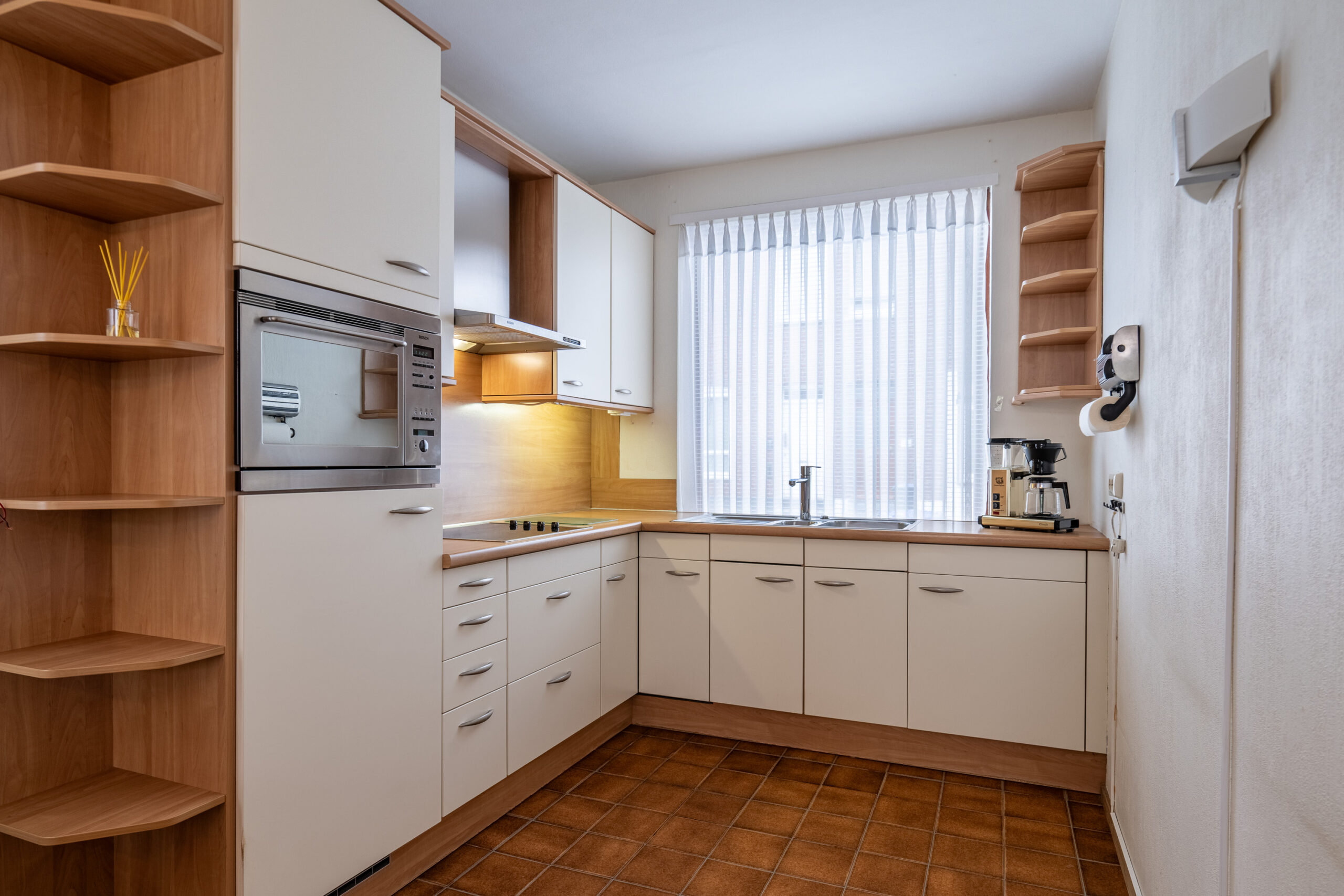 De open woonkamer geniet veel lichtinval door de vele raampartijen en is voorzien van een plavuizenvloer. De open keuken is voorzien van een keuken in L-opstelling inclusief de volgende apparatuur: koelkast, combi oven, keramische kookplaat en afzuigkap. Tevens is er in woonkamer nog een bergkast.