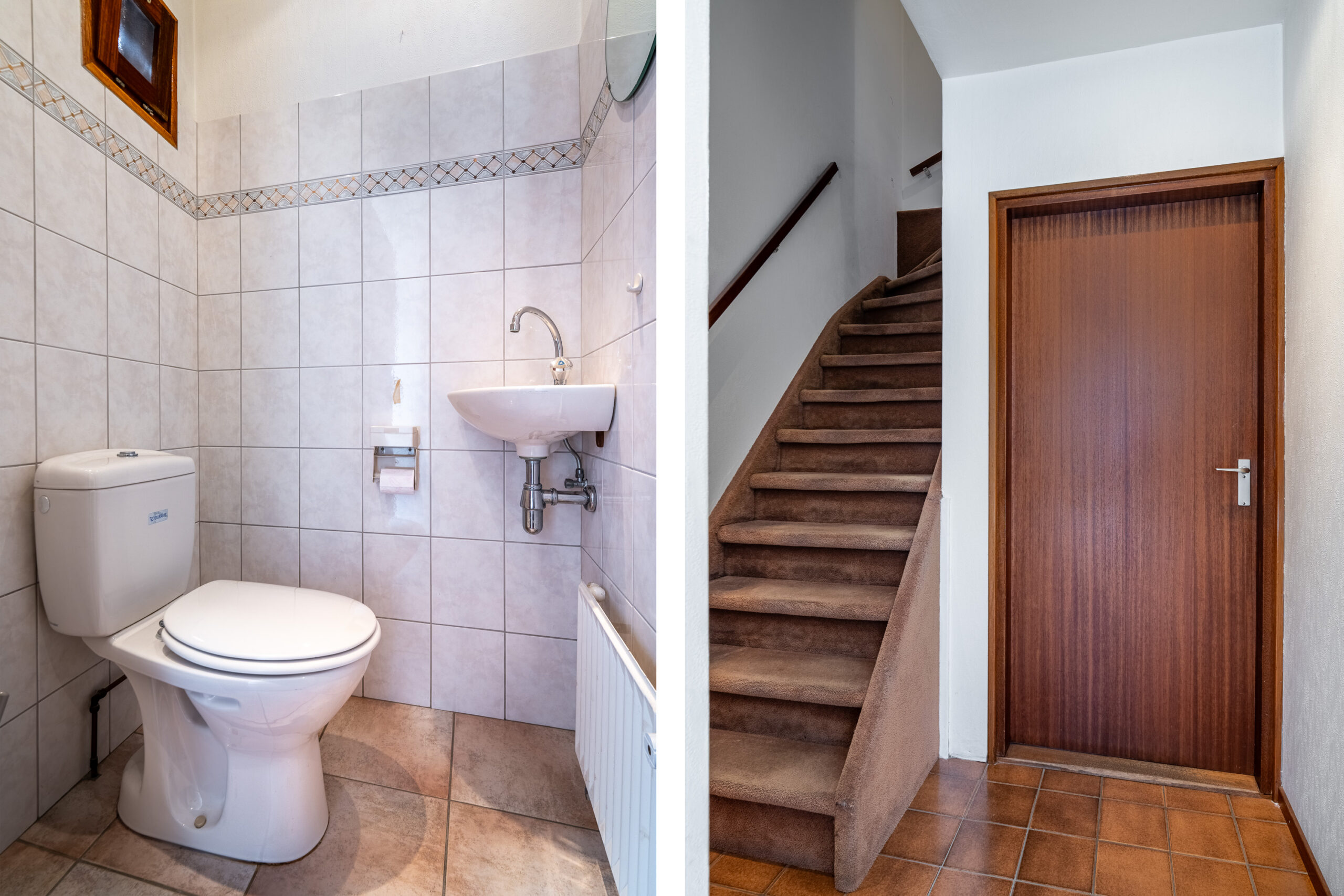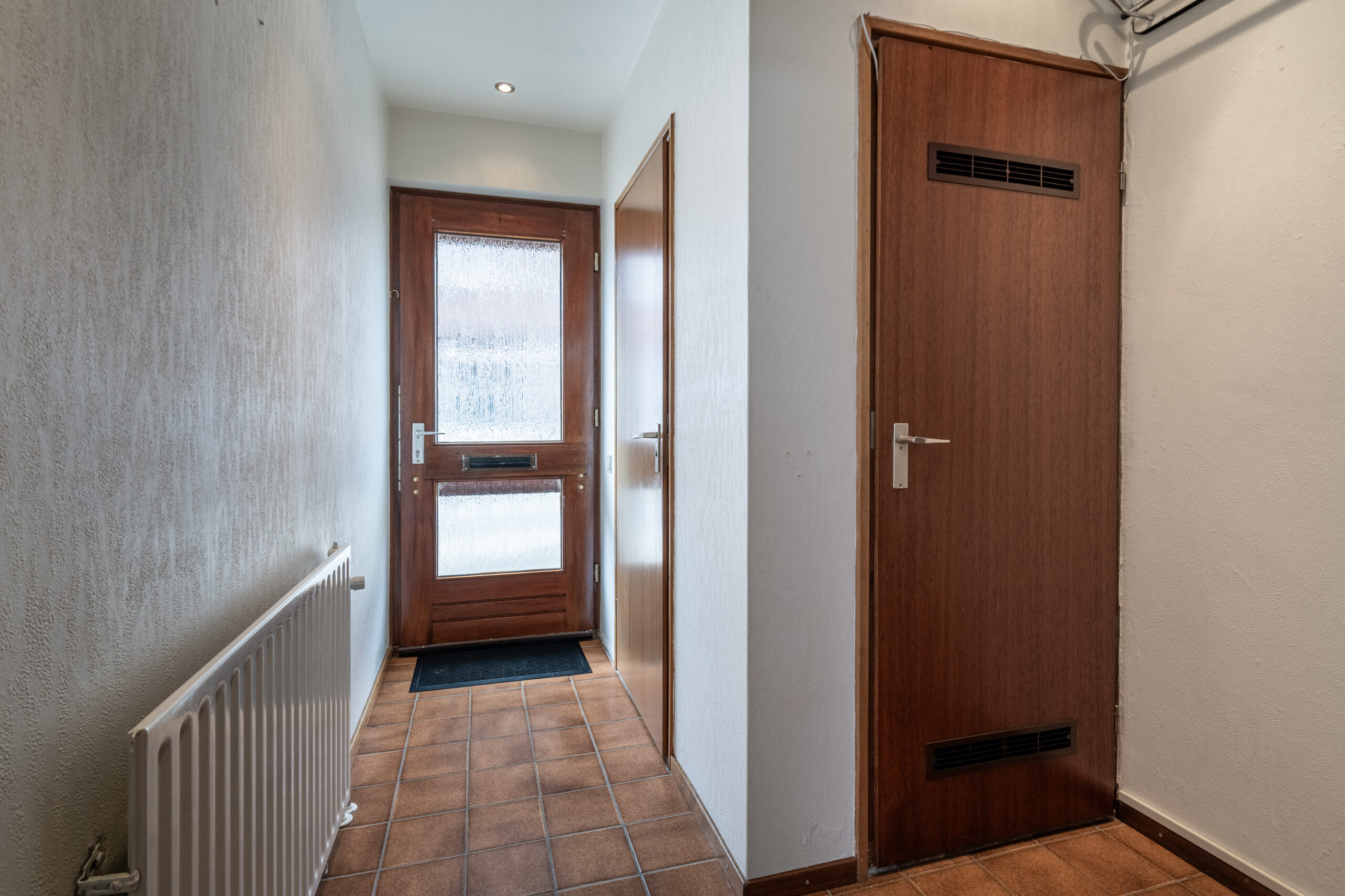 Overdekte entree. Hal met meterkast, toiletruimte met toilet en trapopgang naar de eerste verdieping.