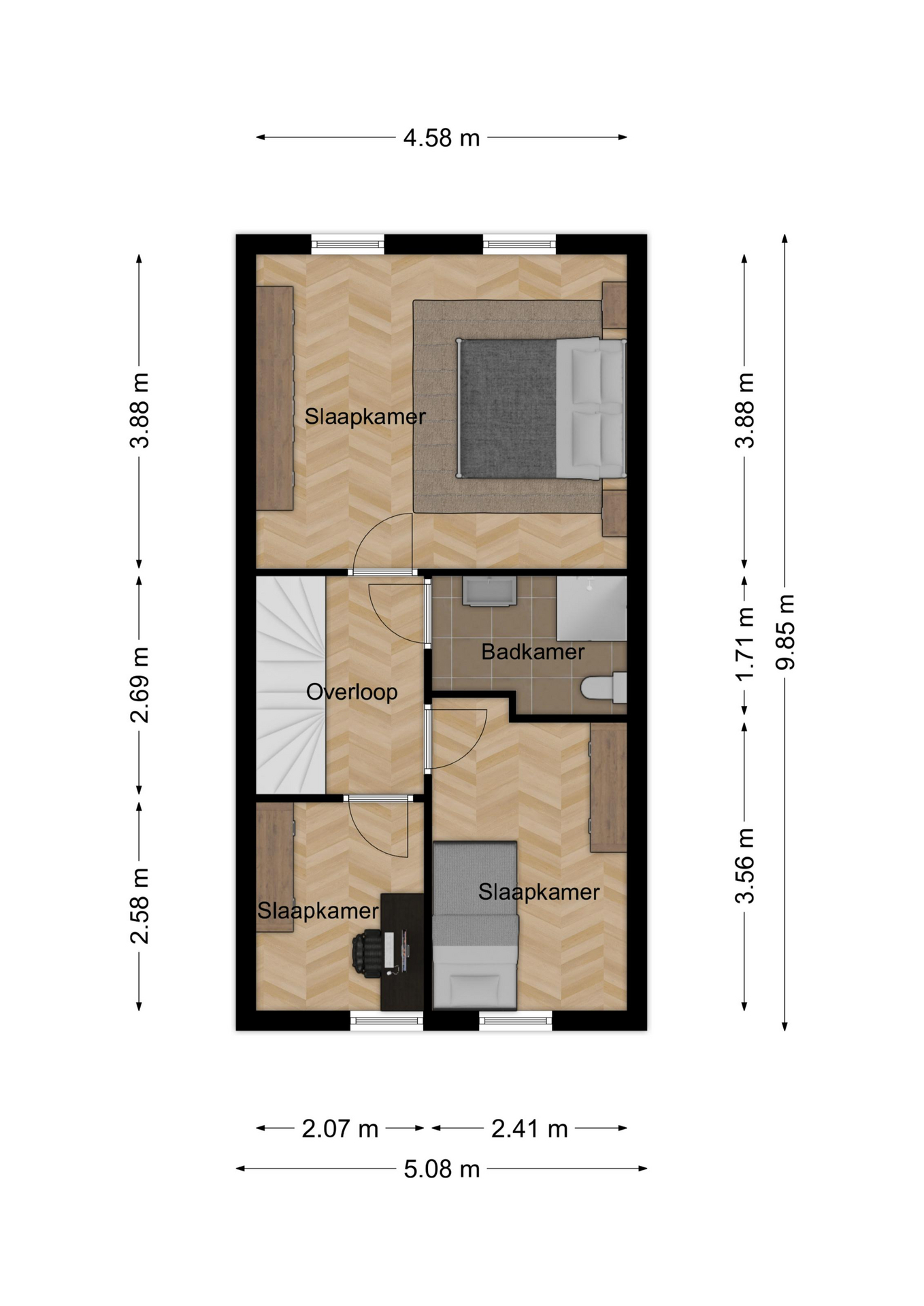 Ruime overloop met toegang naar drie slaapkamers respectievelijk 18m2, 9m2 en 6m2. De geheel betegelde badkamer is voorzien van een douchecabine met glazen wand, zwevend toilet, wastafel en designradiator.