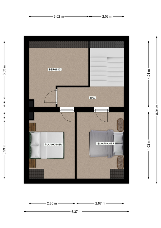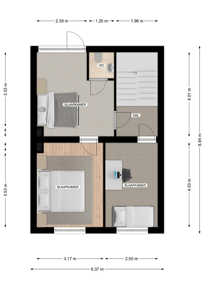Tweede verdieping; via vaste trap is de tweede verdieping bereikbaar waar ook drie slaapkamers zijn gelegen. Middels een klein luik is de vliering eventueel bereikbaar.