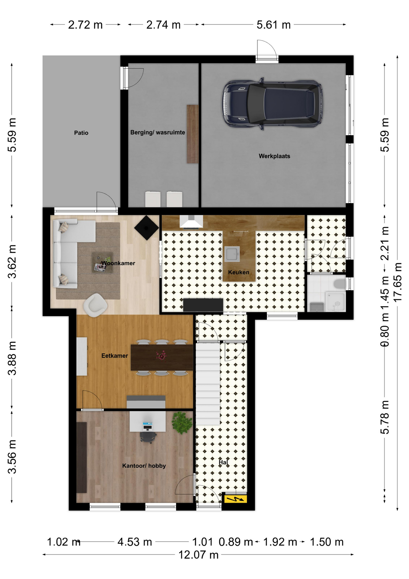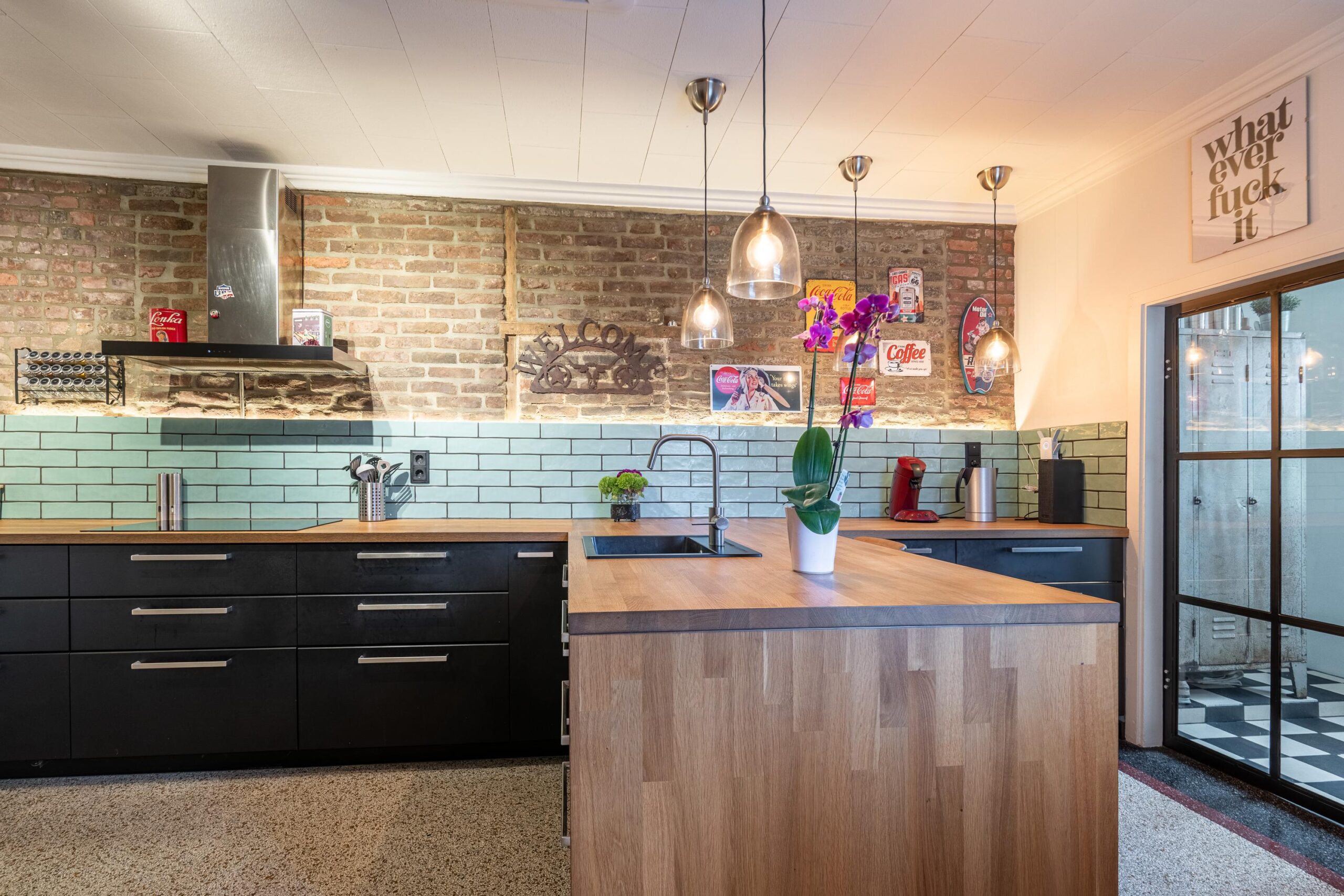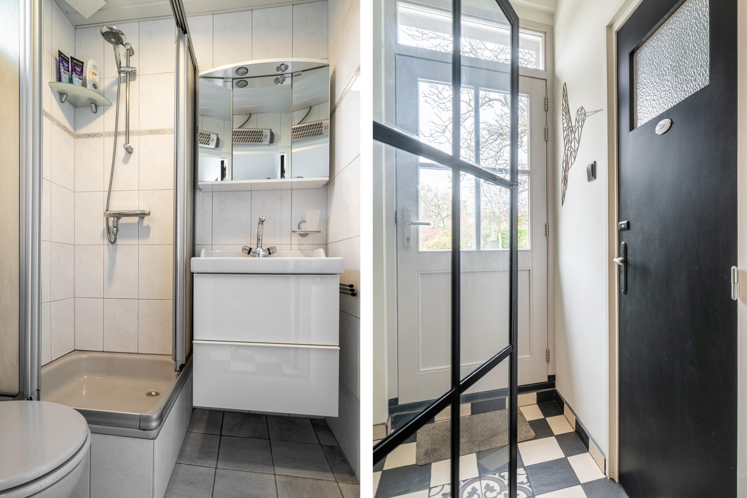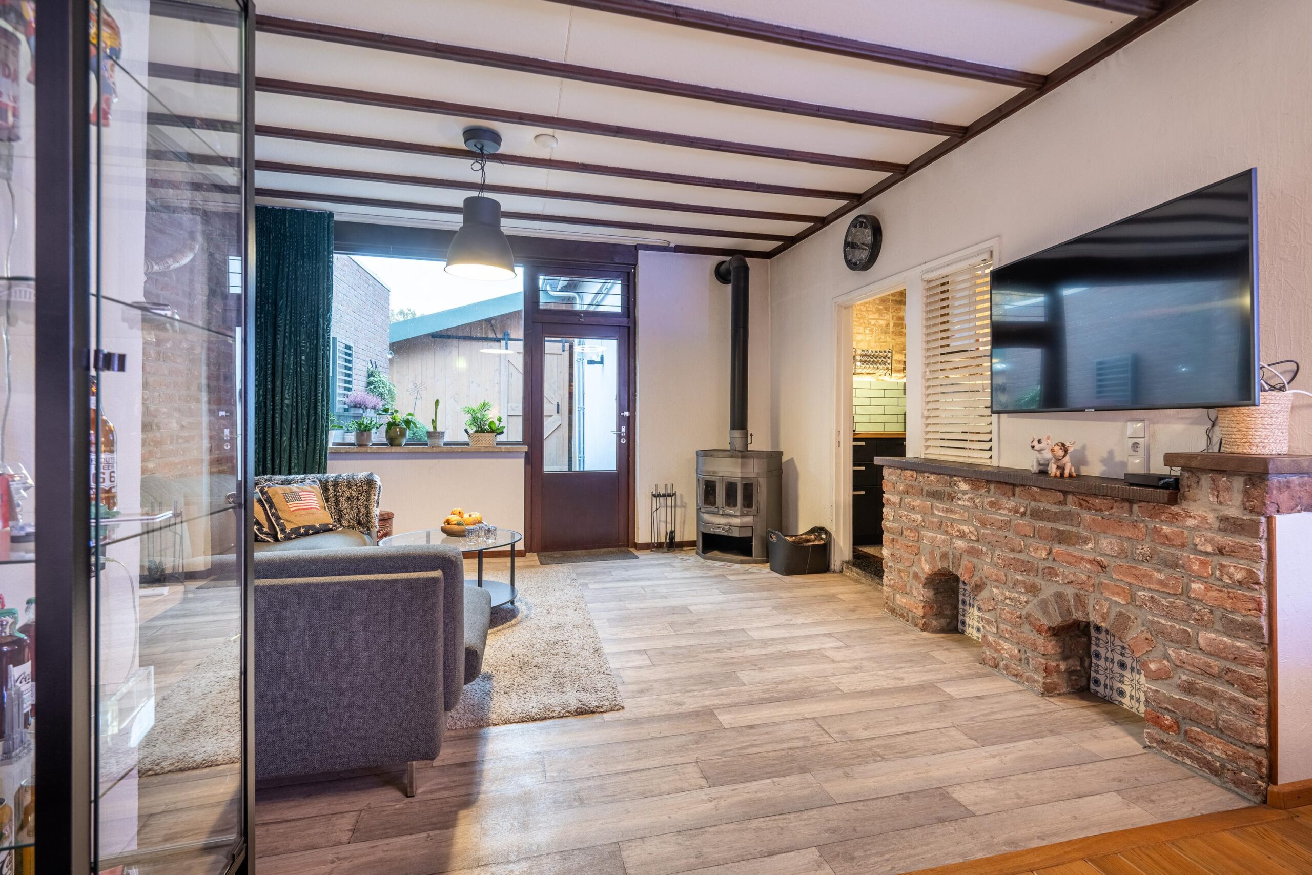 Via originele voordeur toegang tot statige ontvangsthal met terrazzo vloer, fraaie lambrisering, meterkast en karakteristieke trap naar de verdieping. Aan de voorzijde bevindt zich een multifunctionele ruimte. De kamer is momenteel in gebruik als kantoorruimte en voorzien van een stijlvolle laminaatvloer. De sfeervolle woonkamer is gedeeltelijk voorzien van schoon metselwerk, een karakteristieke schouw en een vrijstaande gietijzeren houtkachel. Vanuit de woonkamer toegang tot de zonnige patio, die leidt naar de berging en wasruimte. Royale, robuuste leefkeuken voorzien van T-vormige keukeninstallatie met veel opbergruimte en houten keukenblad. De keuken is voorzien van navolgende inbouwapparatuur: inductiekookplaat, RVS afzuigkap, oven, combimagnetron en vaatwasser. De keuken is eveneens afgewerkt met een terrazzo vloer, glazuurtegels, sfeervolle verlichting en wordt gekoeld en verwarmd middels een airconditioning. Via stijlvolle zwarte stalen deur toegang tot de zij entree met badkamer, voorzien van douche, wastafel en toilet. Tevens toegang tot de vliering.