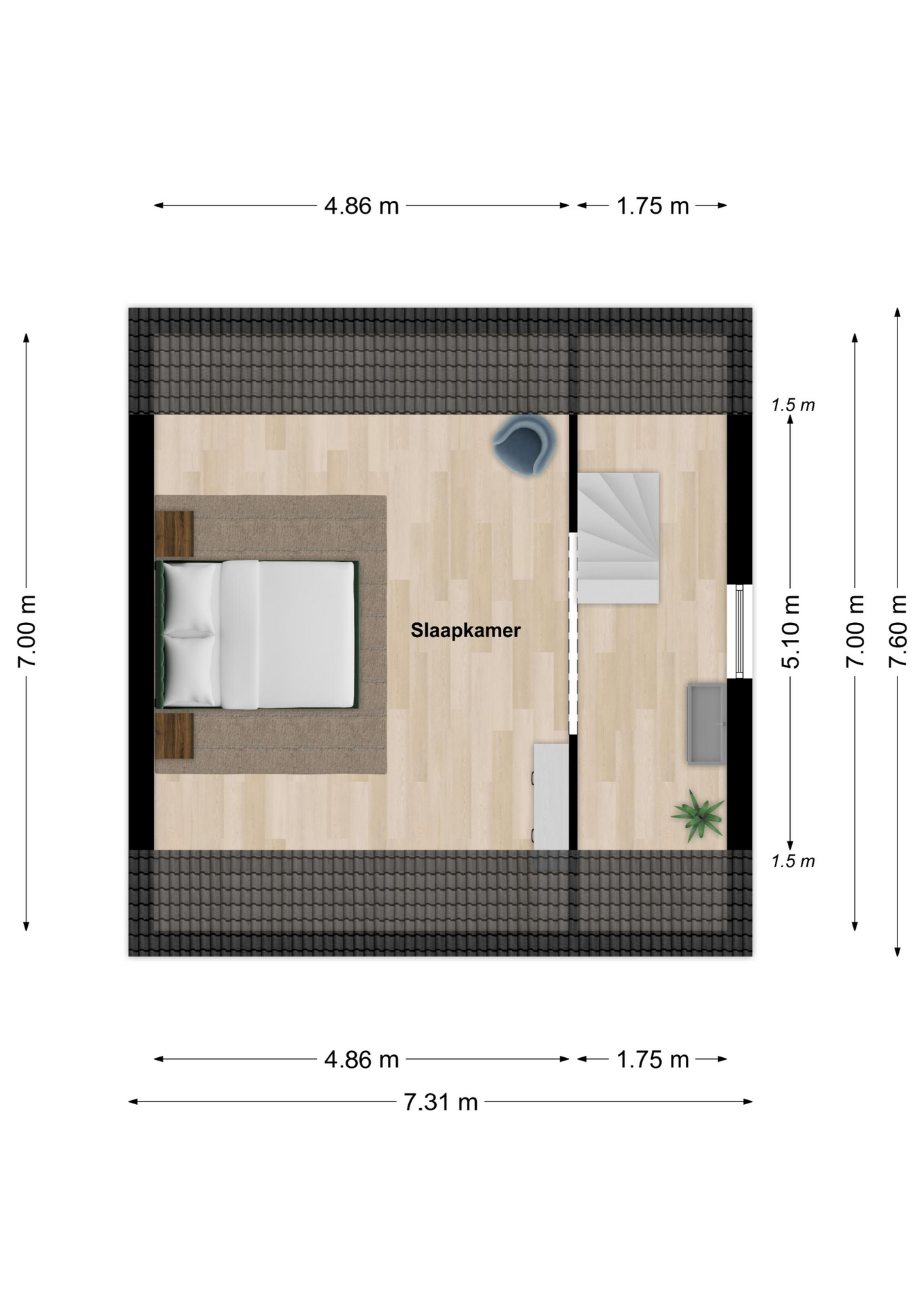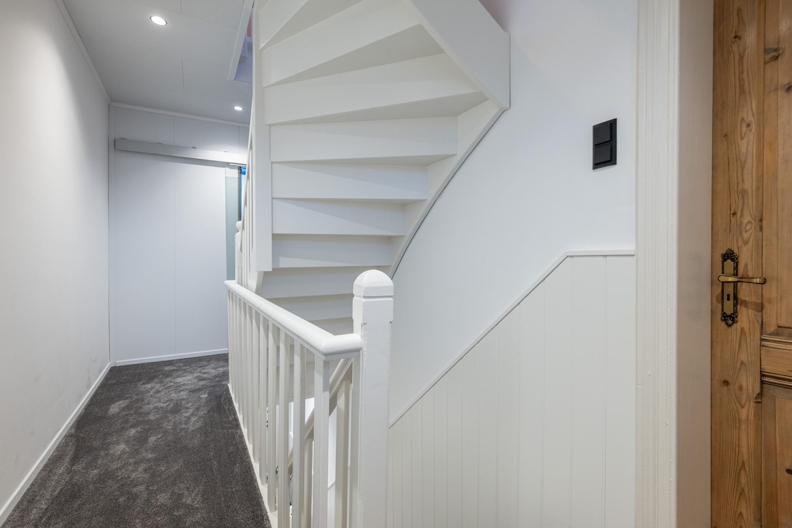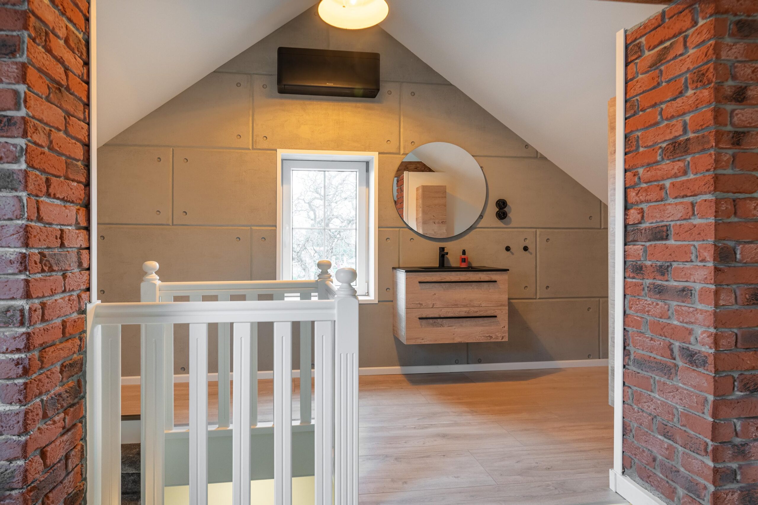 Via vaste trap toegang tot de master bedroom voorzien van Velux dakraam, airconditioning, fraaie led verlichting en luxe wastafelmeubel. De zichtbare dakconstructie geven deze kamer extra charme.