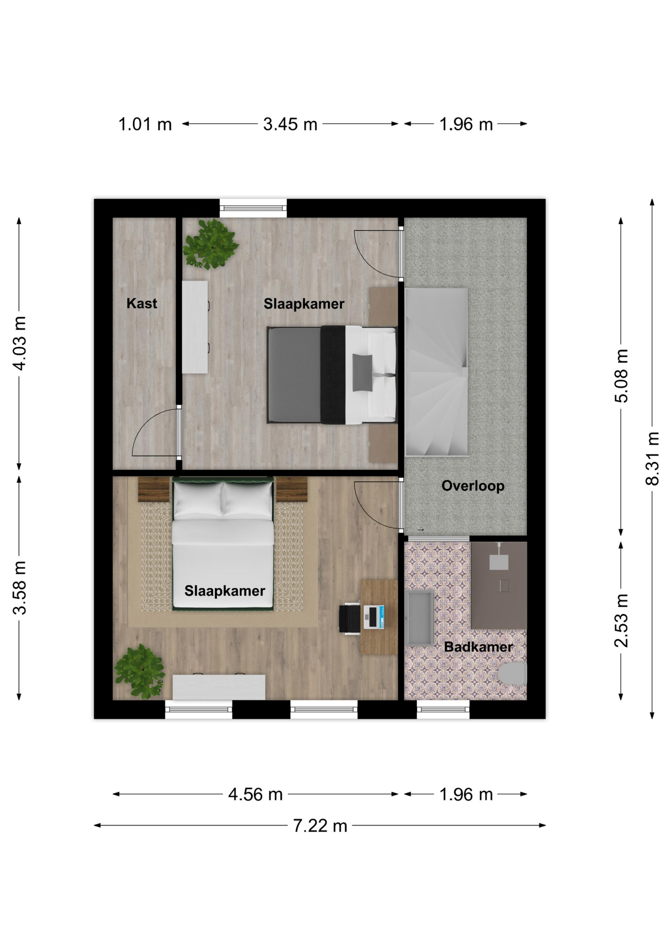 Overloop met toegang tot twee ruime slaapkamers, beide voorzien van moderne laminaatvloeren en airconditioning. De slaapkamer aan de achterzijde beschikt over een royale inloopkast. Luxe, volledig betegelde badkamer (2023) voorzien van royale inloopdouche met glazen schuifdeuren, tweede vrijhangend toilet, elektrische handdoekradiator en luxe wastafelmeubel met composieten blad en ingebouwde kranen.