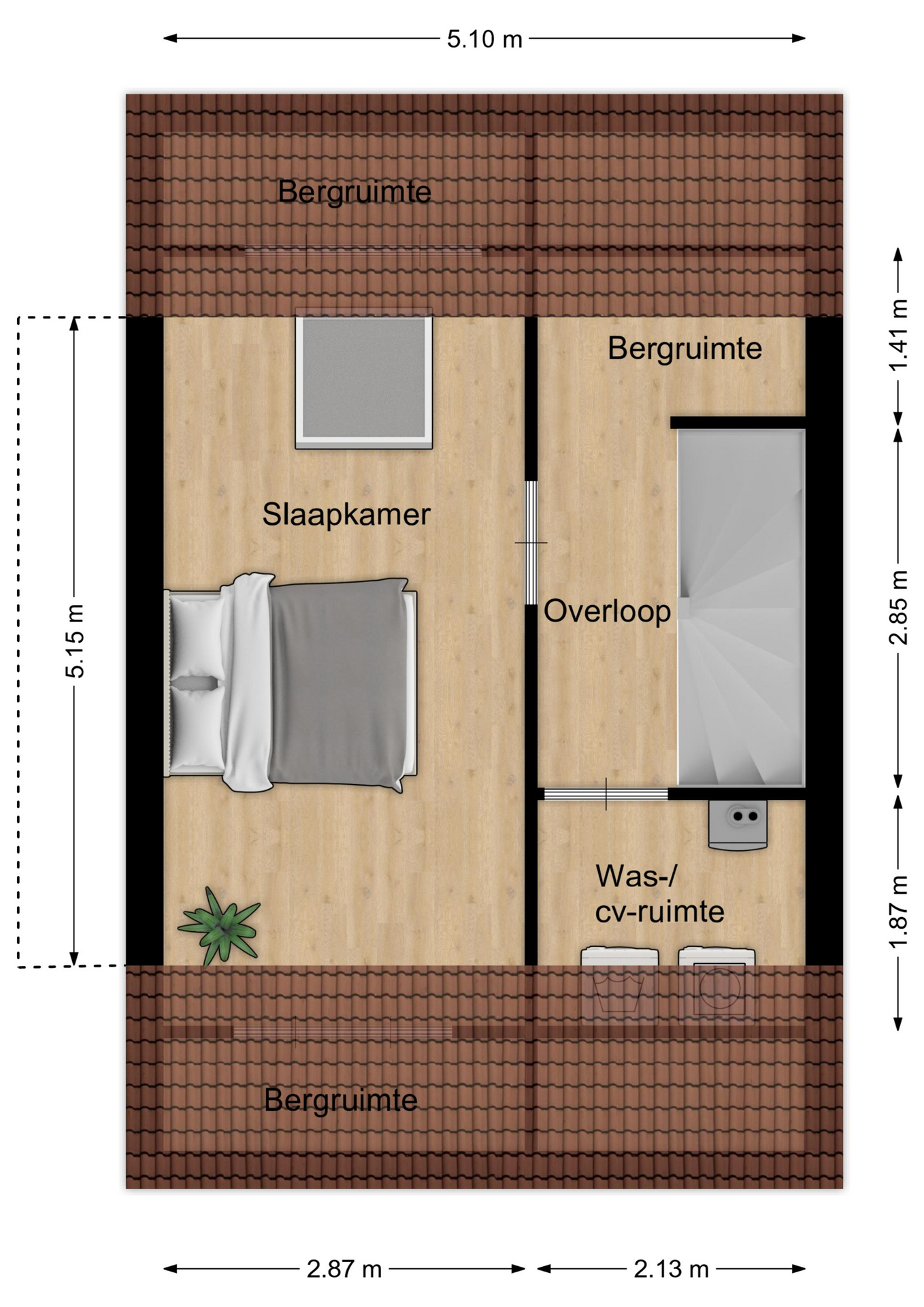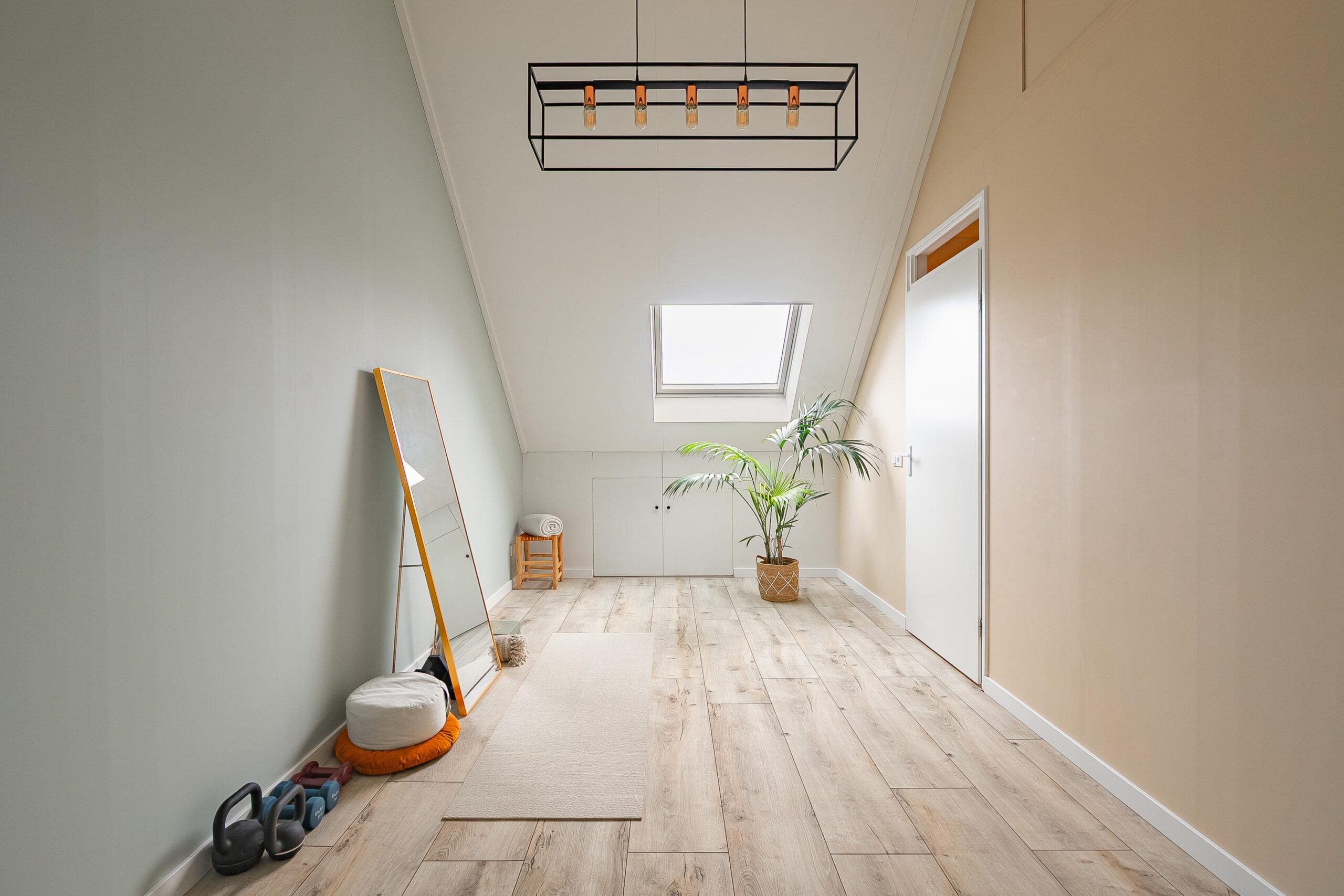 Overloop met bergruimte. Mooi afgewerkte, vierde slaapkamer (ca. 14.8m²) met dakraam en een hoog plafond tot in de nok van de woning. Was/cv-ruimte met witgoedaansluitingen, opstelling CV-combiketel (merk Intergas, bouwjaar 2018, eigendom) en WTW-systeem.