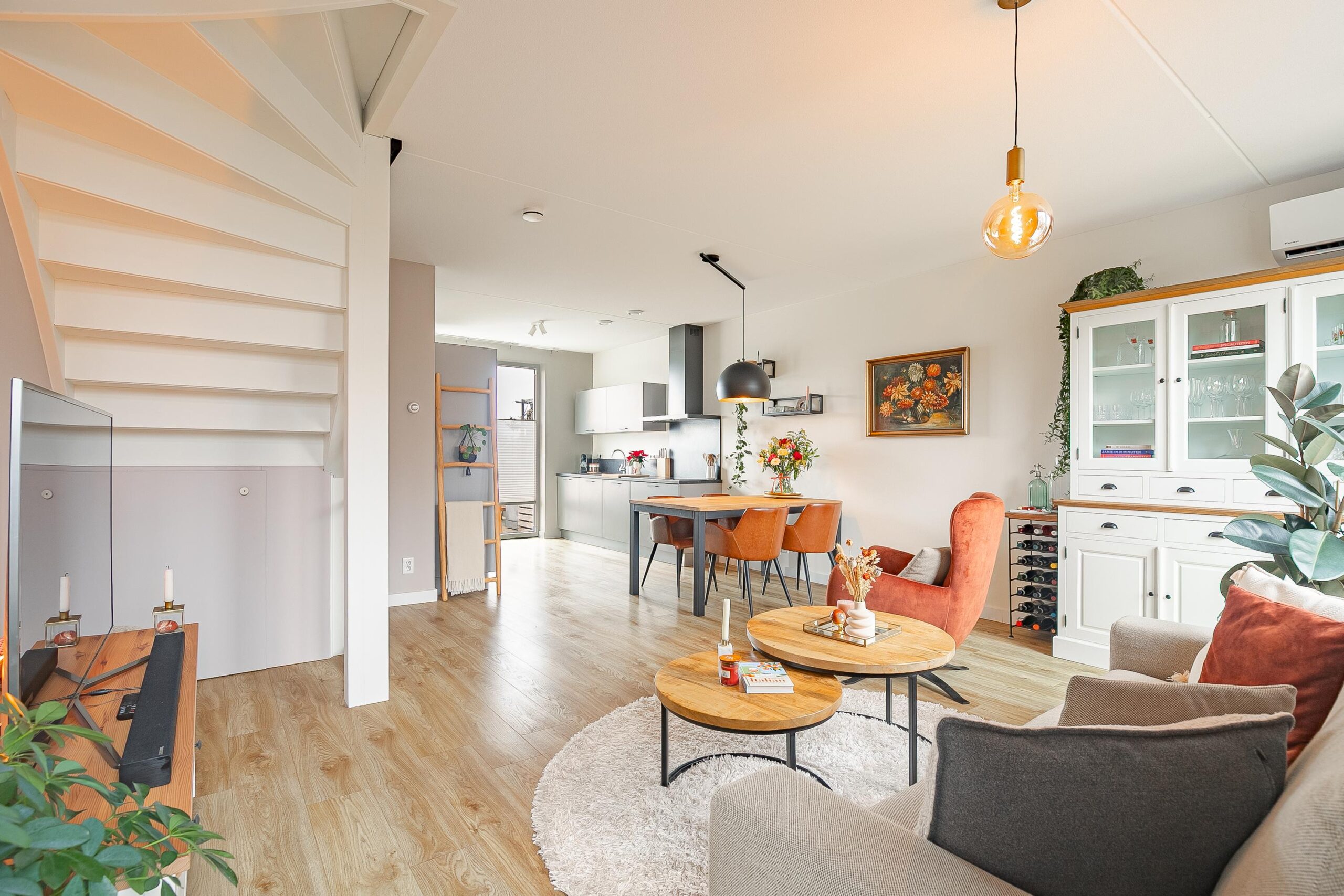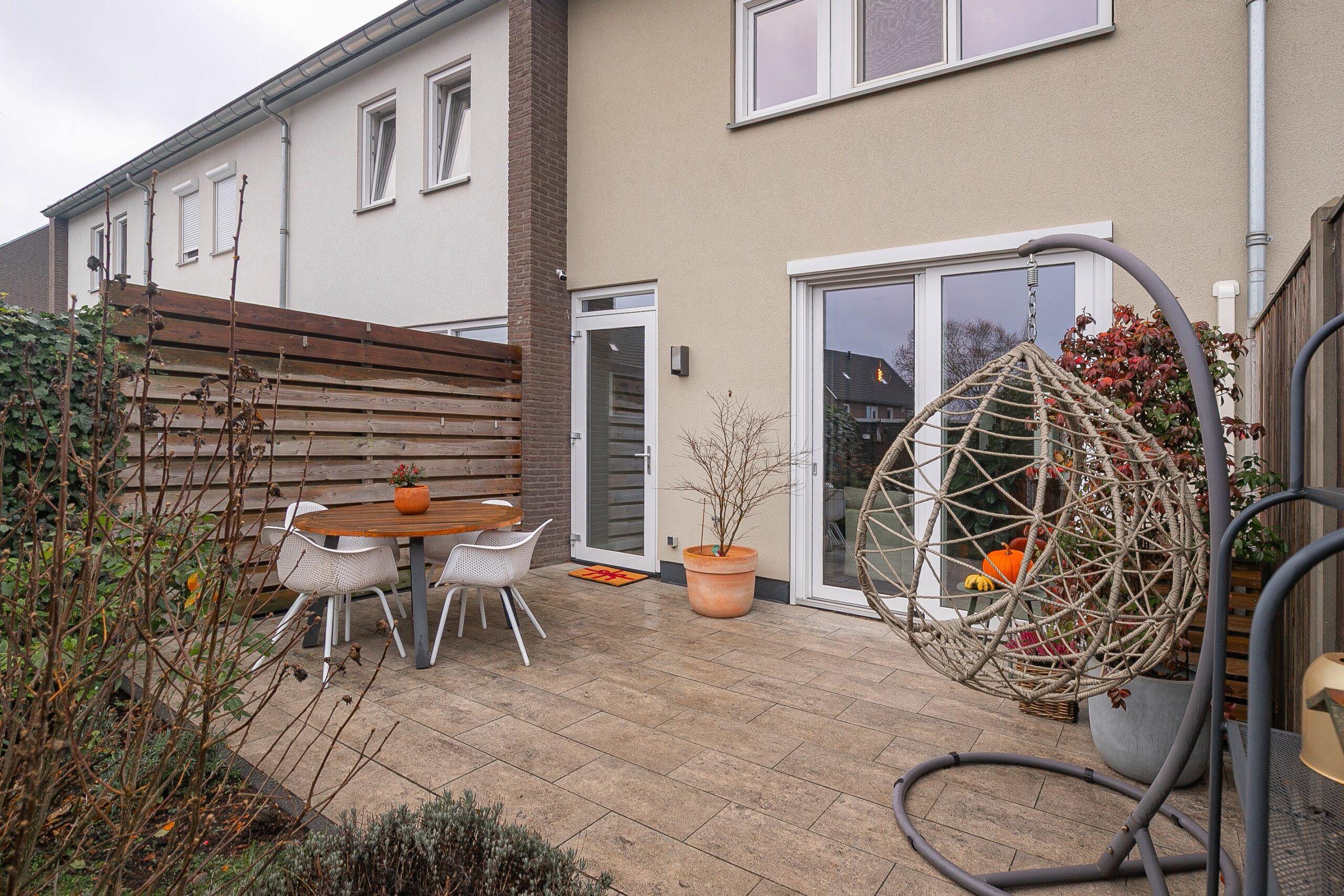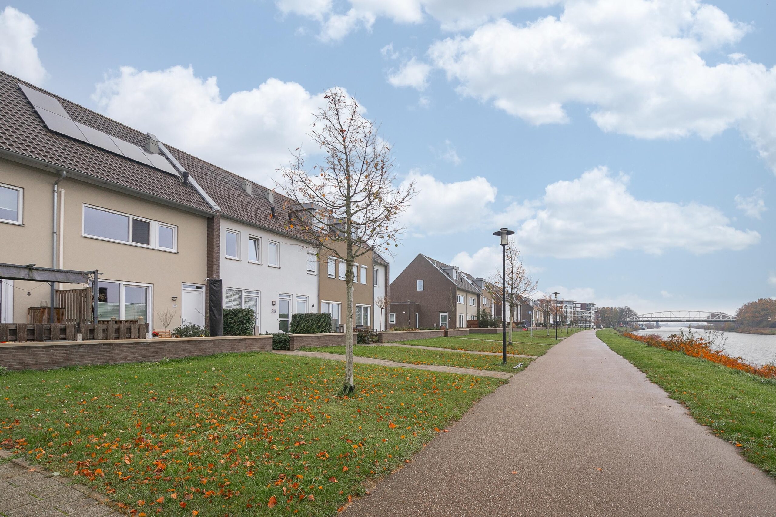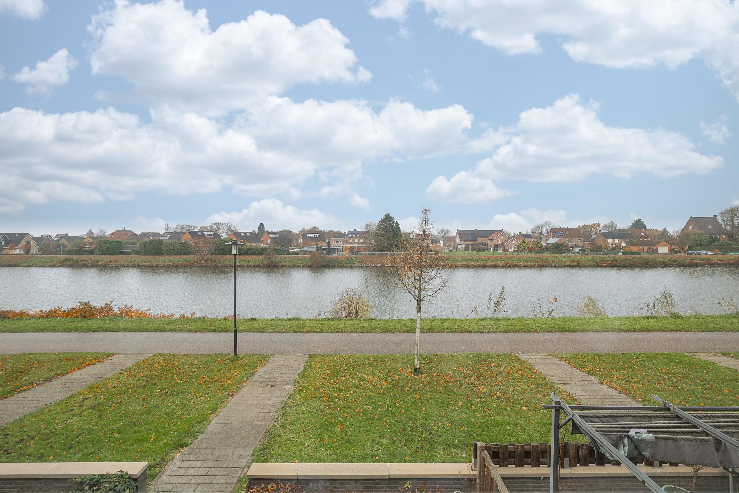 Hal met meterkast (13 groepen en 4 aardlekschakelaars) en modern toilet met wandcloset en fonteintje. Woonkamer (ca. 25.3m²) met vloerverwarming (ook in keuken), laminaatvloer en veel lichtinval. Open keuken (ca. 9m²) met moderne aanrechtcombinatie met de volgende apparatuur: inductiekookplaat, combimagnetron, koelkast, diepvries, spoelbak en afzuigkap. In de achtergevel is een schuifpui en een loopdeur die toegang bieden tot de op het oosten georiënteerde, geheel omsloten achtertuin met terras, sfeervolle tuin en houten tuinberging (ca. 6m²). Achter de tuin zijn twee privéparkeerplaatsen voor het parkeren van twee auto’s op eigen terrein. Aan de voorzijde van de woning is een ruim op het westen georiënteerd terras dat uitzicht biedt over het Julianakanaal en over het aan de andere kant van het kanaal gelegen Oud-Urmond.
