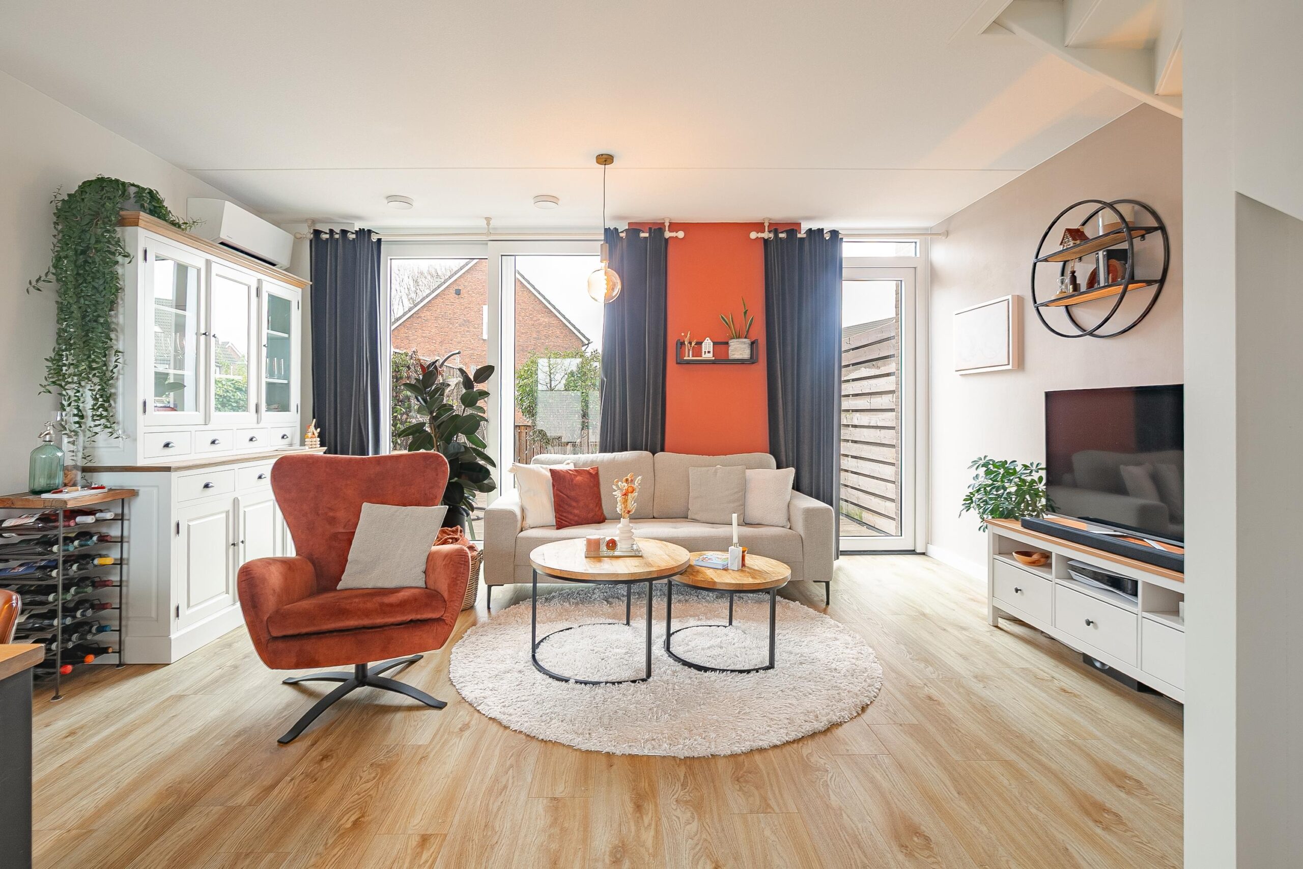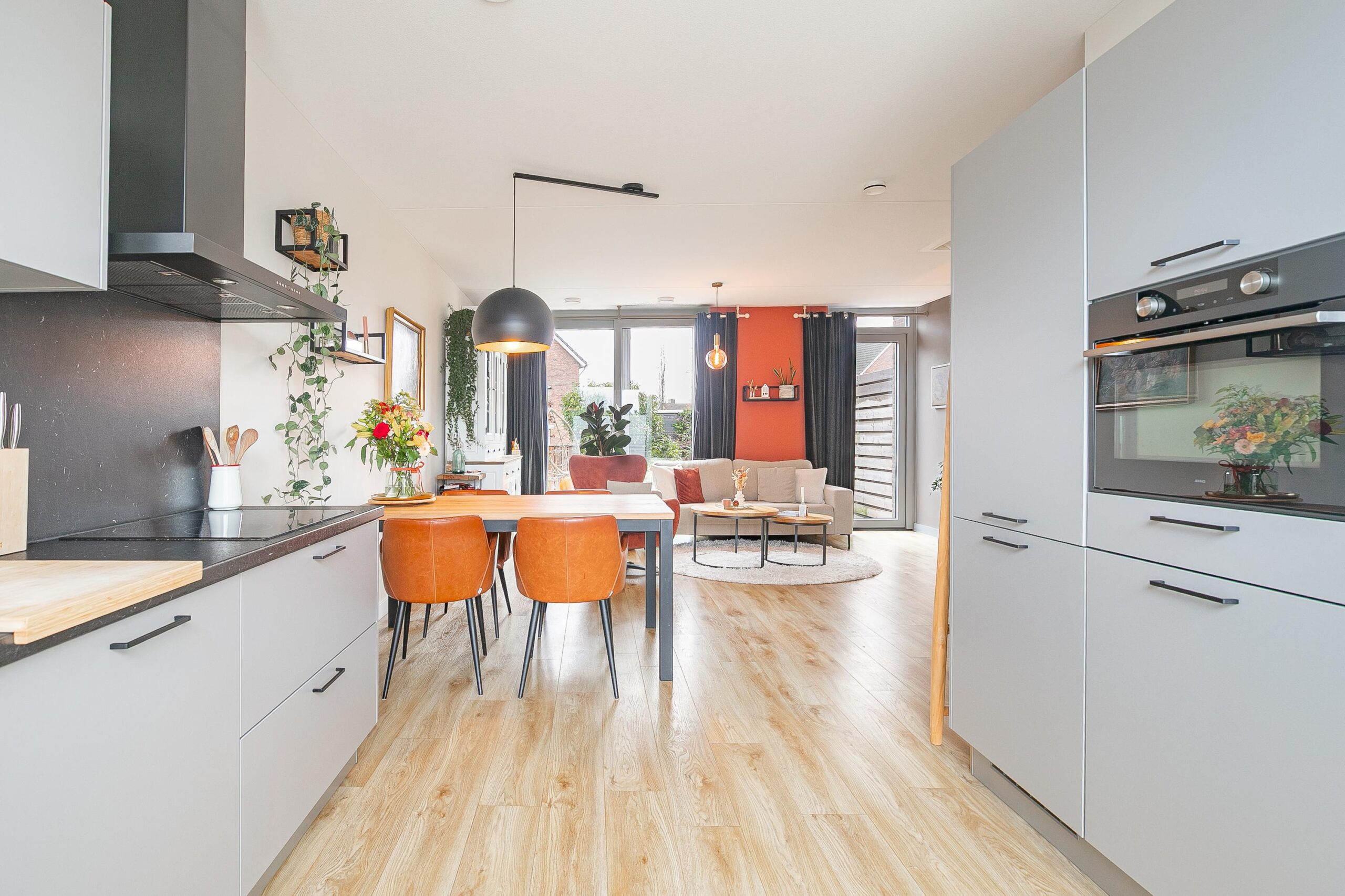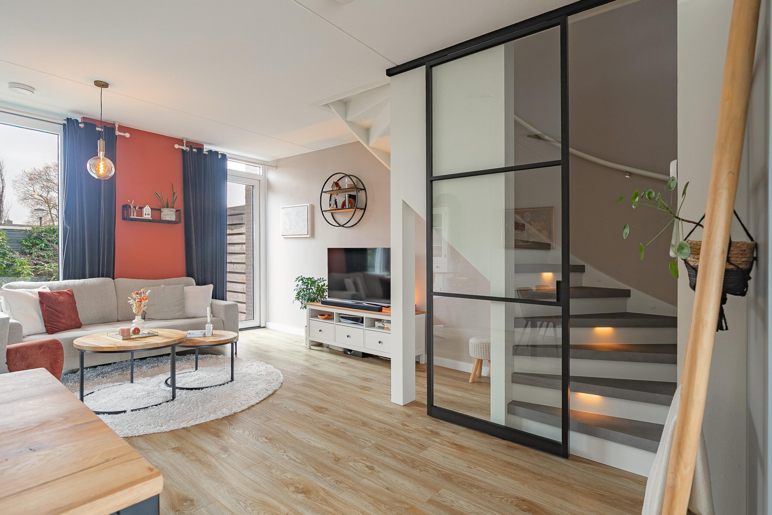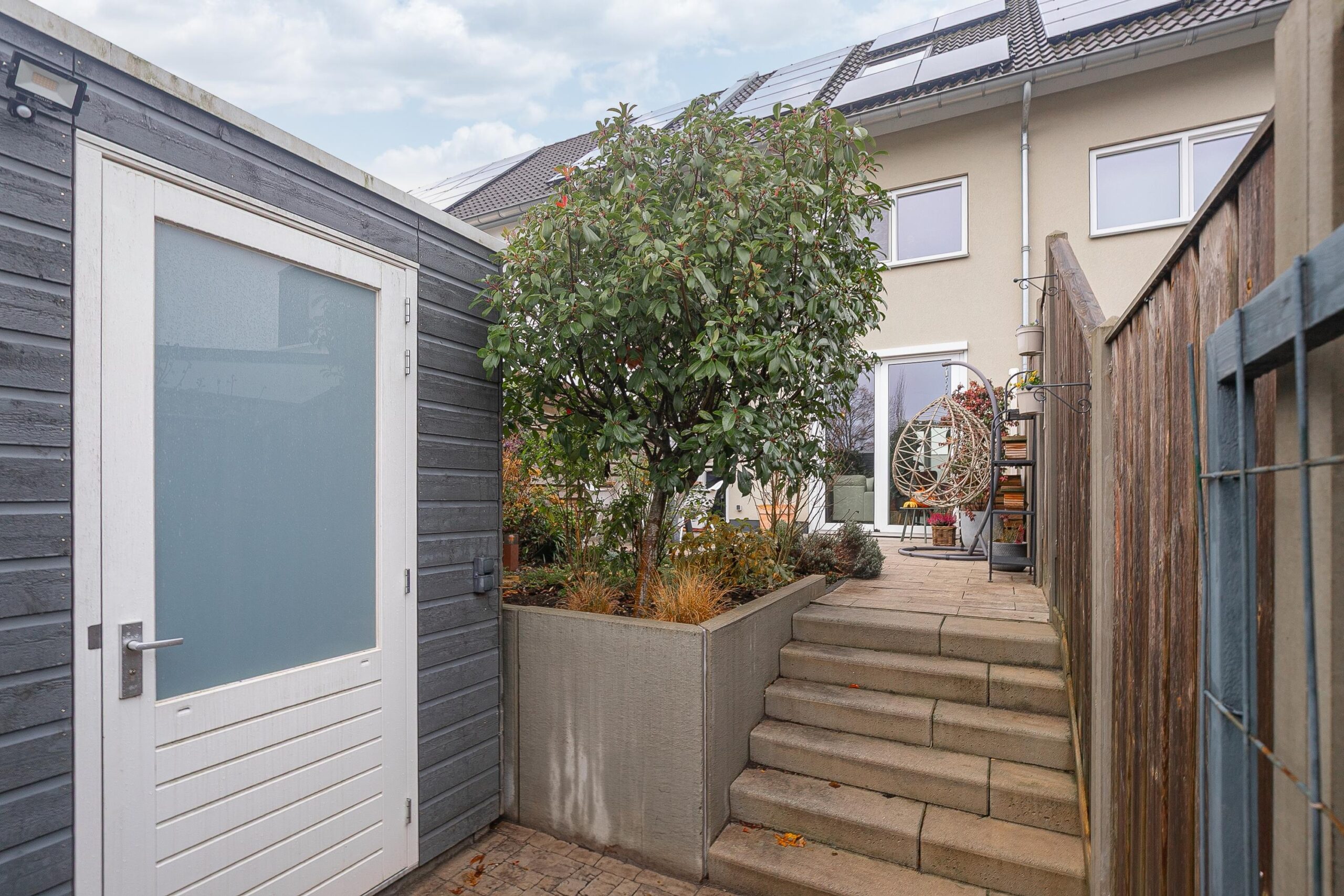 Hal met meterkast (13 groepen en 4 aardlekschakelaars) en modern toilet met wandcloset en fonteintje. Woonkamer (ca. 25.3m²) met vloerverwarming (ook in keuken), laminaatvloer en veel lichtinval. Open keuken (ca. 9m²) met moderne aanrechtcombinatie met de volgende apparatuur: inductiekookplaat, combimagnetron, koelkast, diepvries, spoelbak en afzuigkap. In de achtergevel is een schuifpui en een loopdeur die toegang bieden tot de op het oosten georiënteerde, geheel omsloten achtertuin met terras, sfeervolle tuin en houten tuinberging (ca. 6m²). Achter de tuin zijn twee privéparkeerplaatsen voor het parkeren van twee auto’s op eigen terrein. Aan de voorzijde van de woning is een ruim op het westen georiënteerd terras dat uitzicht biedt over het Julianakanaal en over het aan de andere kant van het kanaal gelegen Oud-Urmond.