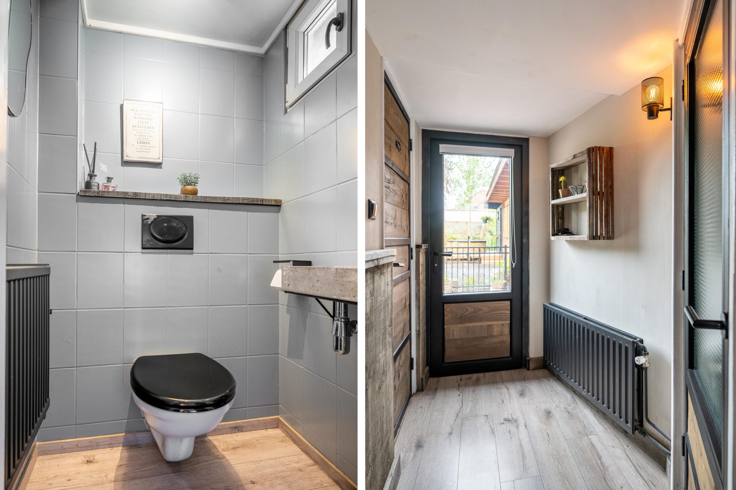 Middels vestibule met garderobe en vernieuwde meterkast, bereikt u middels een glazen deur de centrale hal met een gestoffeerde trap naar de eerste verdieping. Daarnaast bevindt zich hier het geheel betegelde toilet met vrijhangend closet, betonnen fonteintje, radiator en raam voor natuurlijke ventilatie.