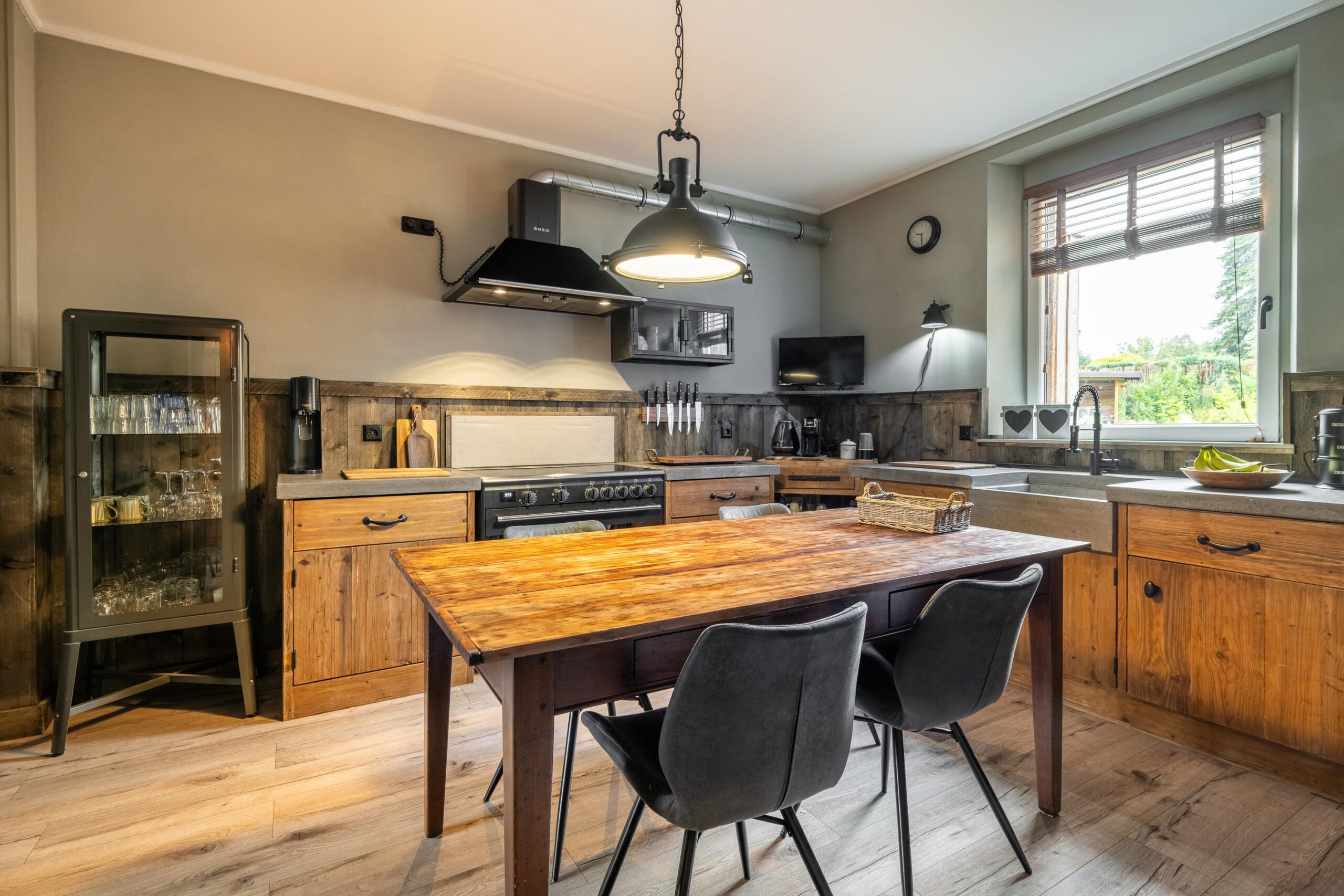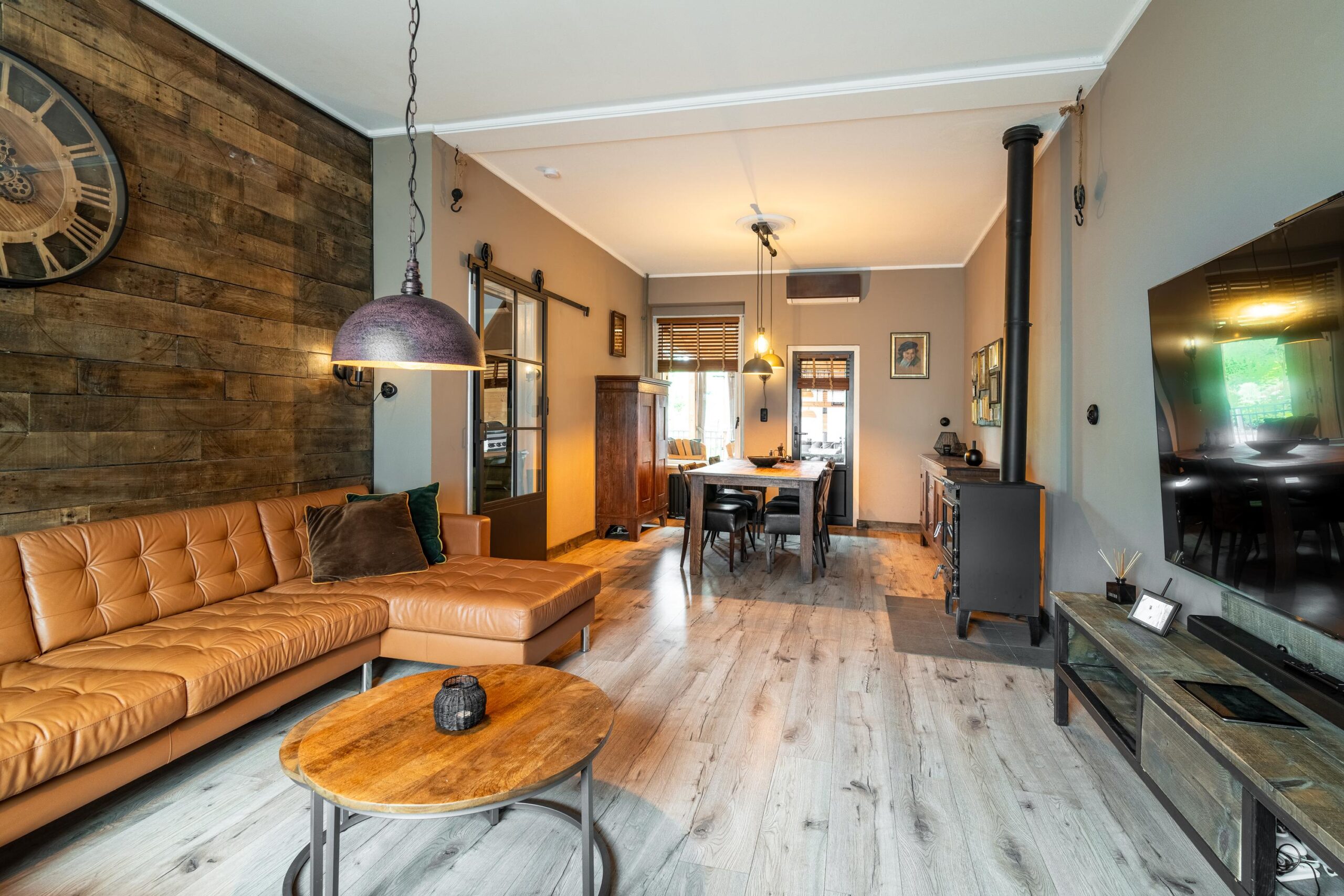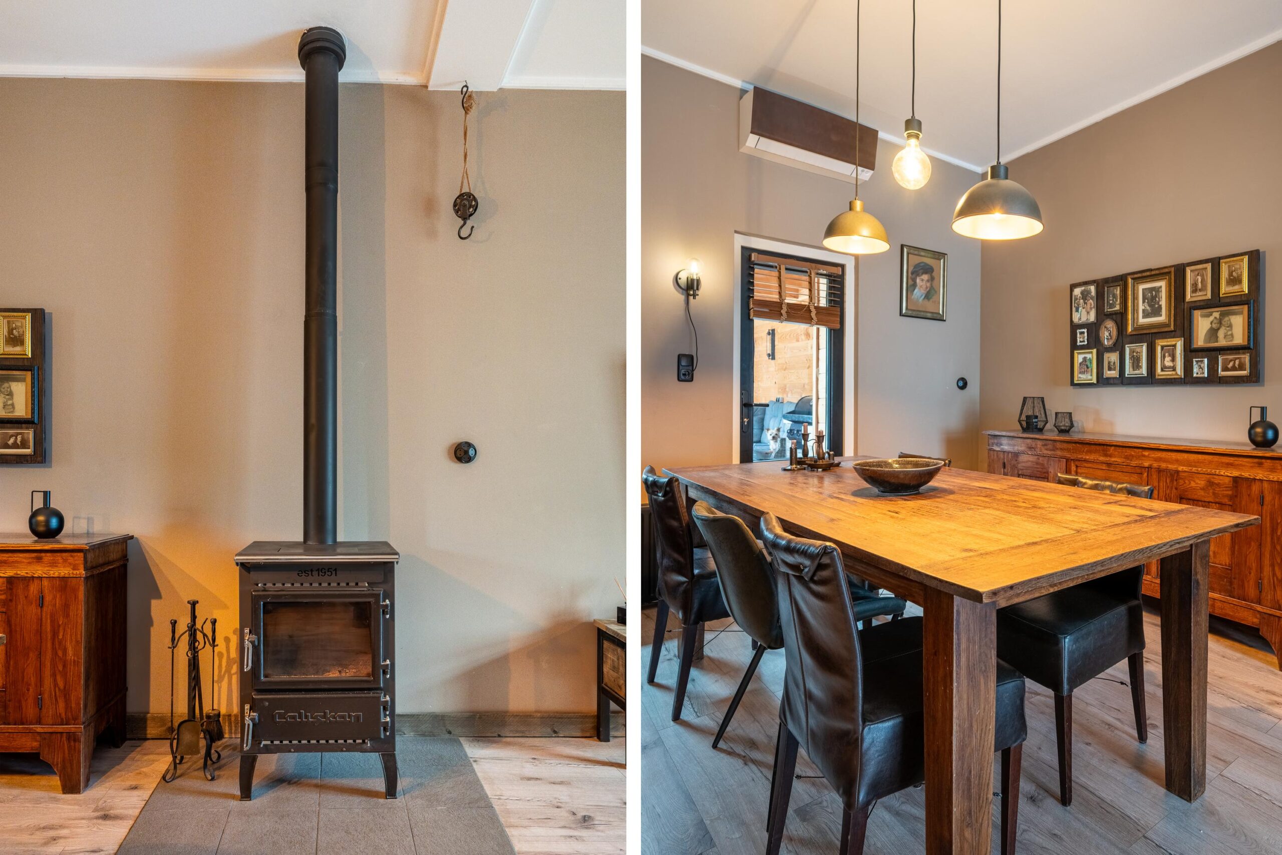 De sfeervolle woonkamer ademt karakter door de hoge plafonds, gestucte wanden, moderne laminaatvloer en een fraaie houtkachel. Vanuit de woonkamer is er direct toegang tot de royale overkapping, een heerlijke plek om te genieten van het buitenleven en een waar verlengstuk van de woonkamer.
