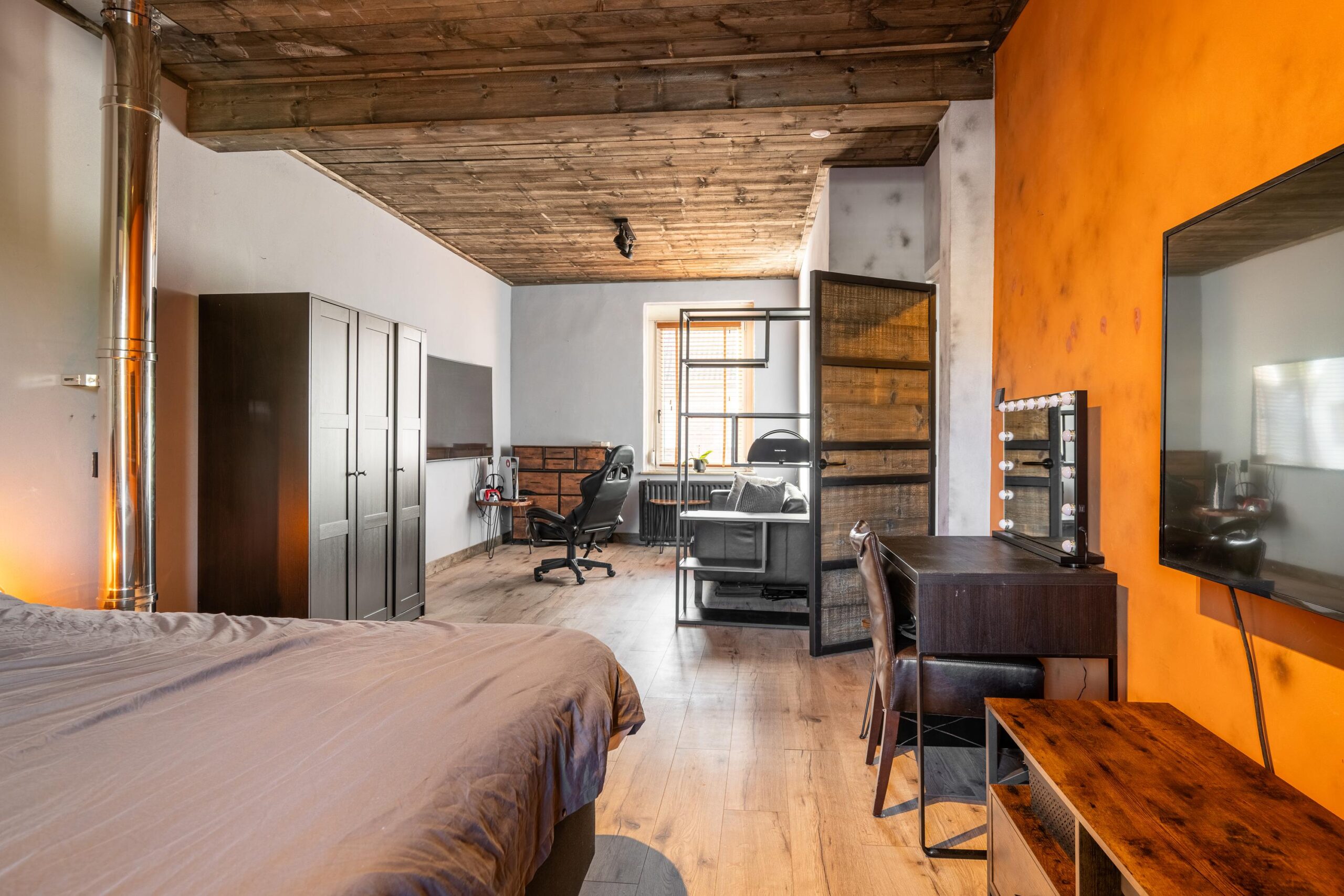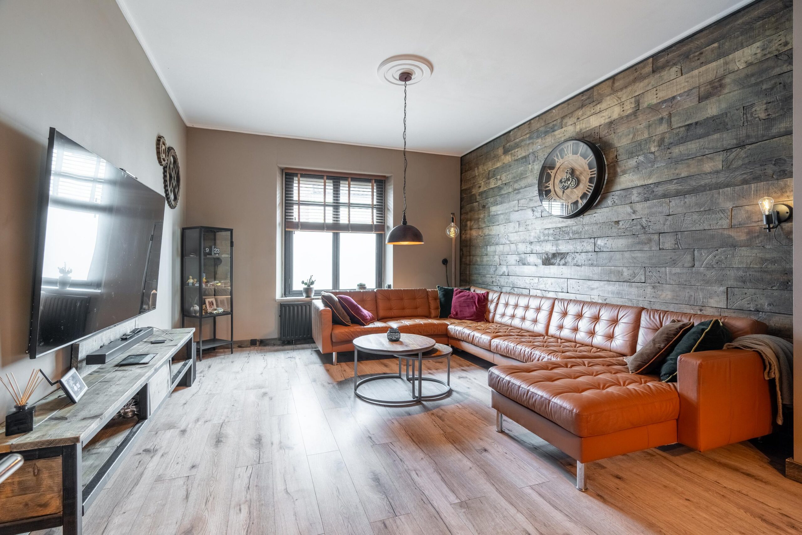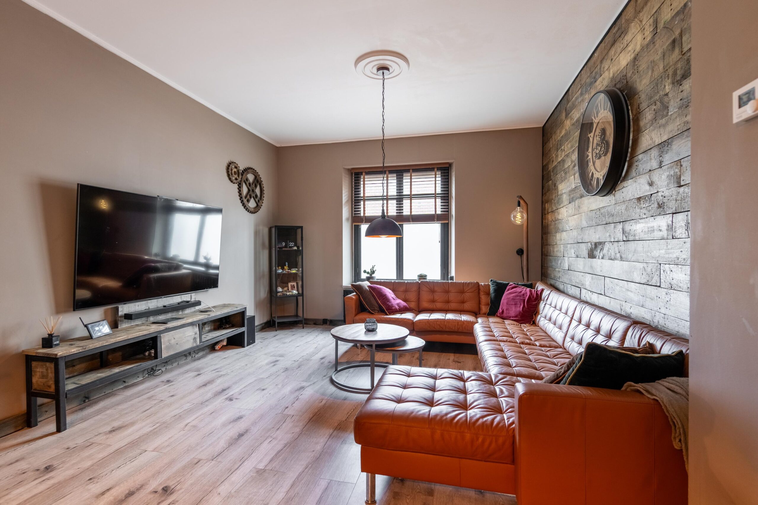 De sfeervolle woonkamer ademt karakter door de hoge plafonds, gestucte wanden, moderne laminaatvloer en een fraaie houtkachel. Vanuit de woonkamer is er direct toegang tot de royale overkapping, een heerlijke plek om te genieten van het buitenleven en een waar verlengstuk van de woonkamer.
