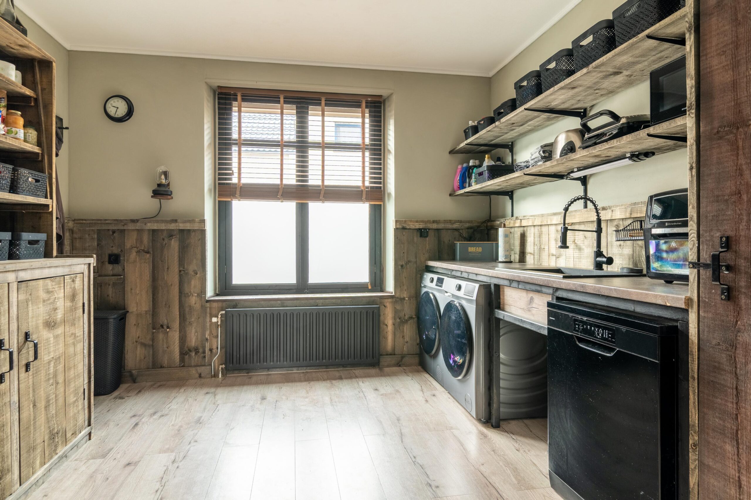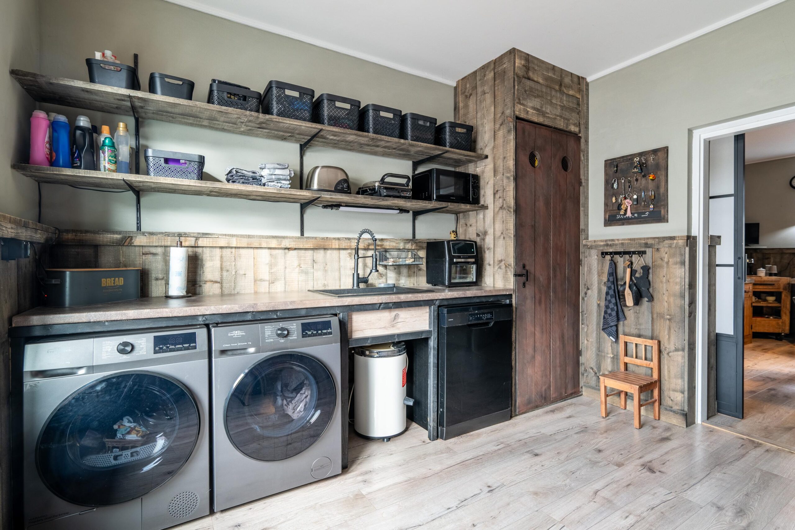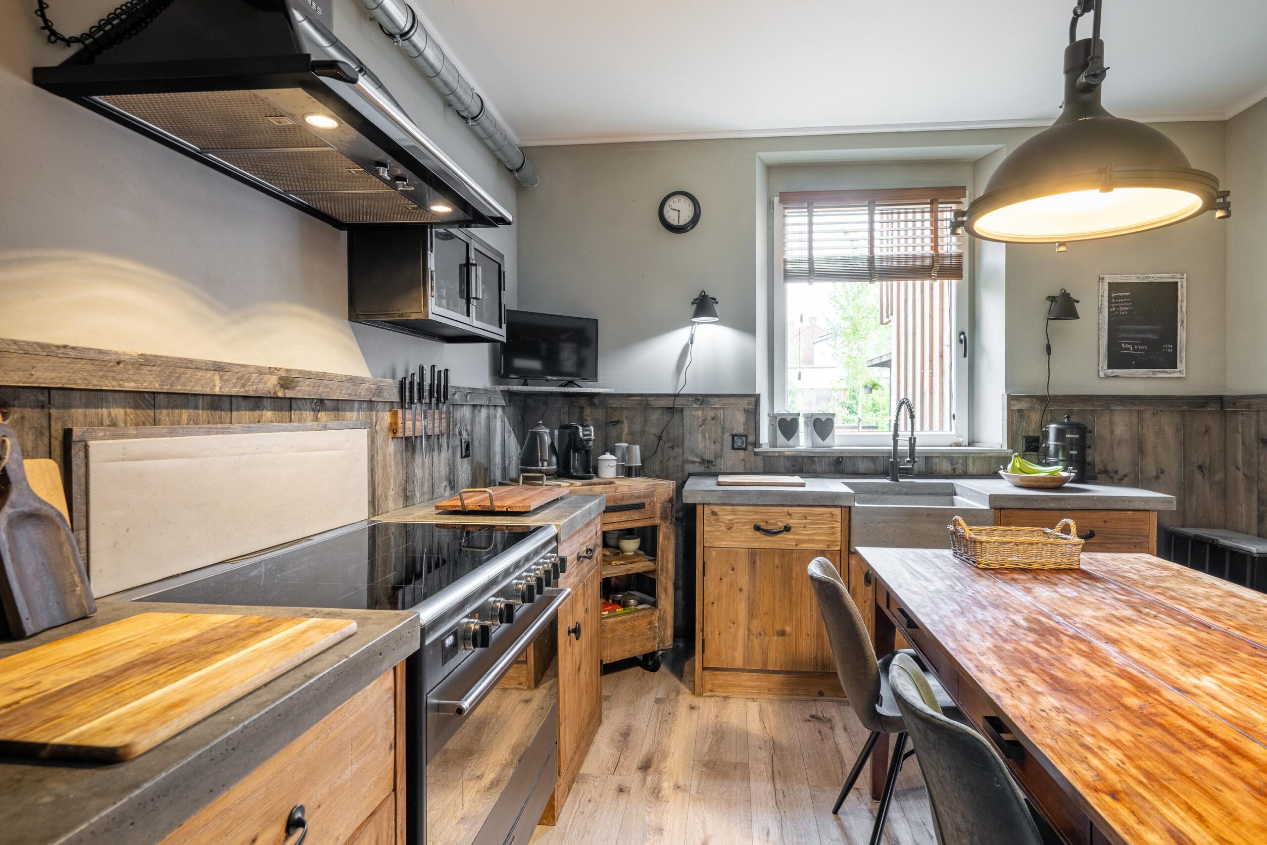 De tegenovergelegen keuken is een uniek, eigen ontwerp met een robuuste uitstraling dankzij beton en steigerhout. Deze is uitgerust met hoogwaardige apparatuur van het merk “Smeg” w.o. een 5-pits inductiekookplaat, grote oven en afzuigkap. Aangrenzend ligt de ruime bijkeuken/wasruimte met aansluitingen voor witgoed, een vaatwasser, separate cv-kast (Remeha HR-combiketel, bouwjaar 2019, huur) en een op maat gemaakte voorraadkast.