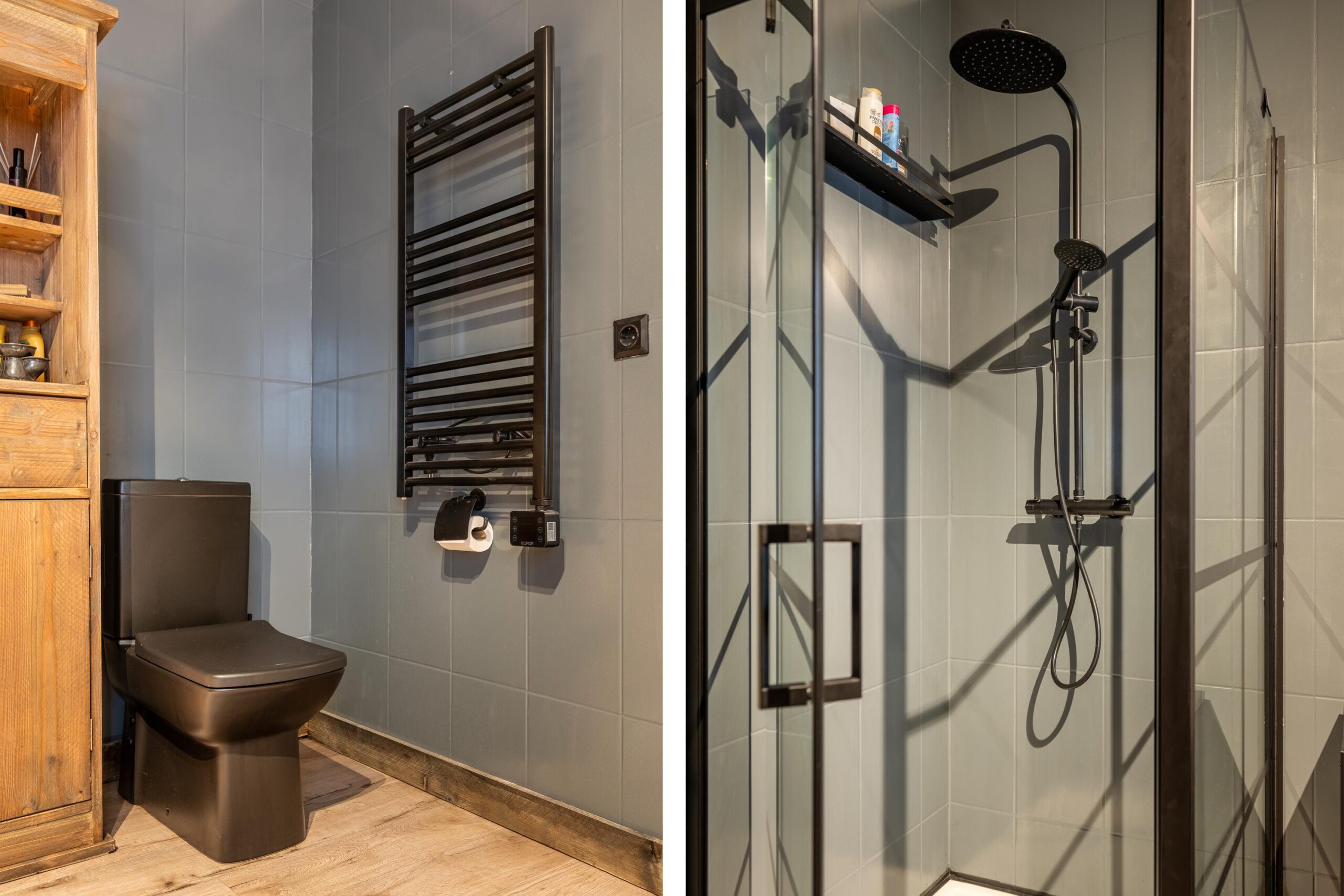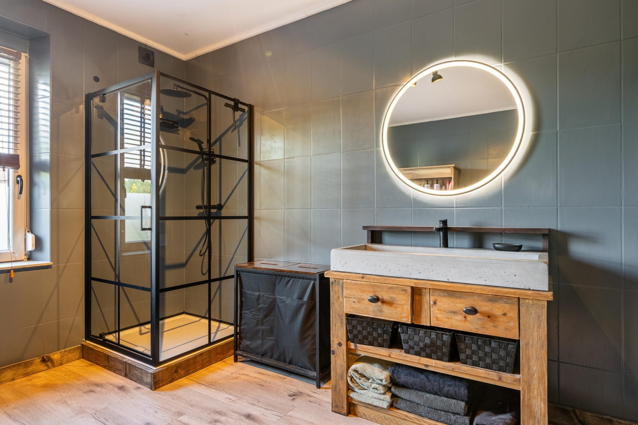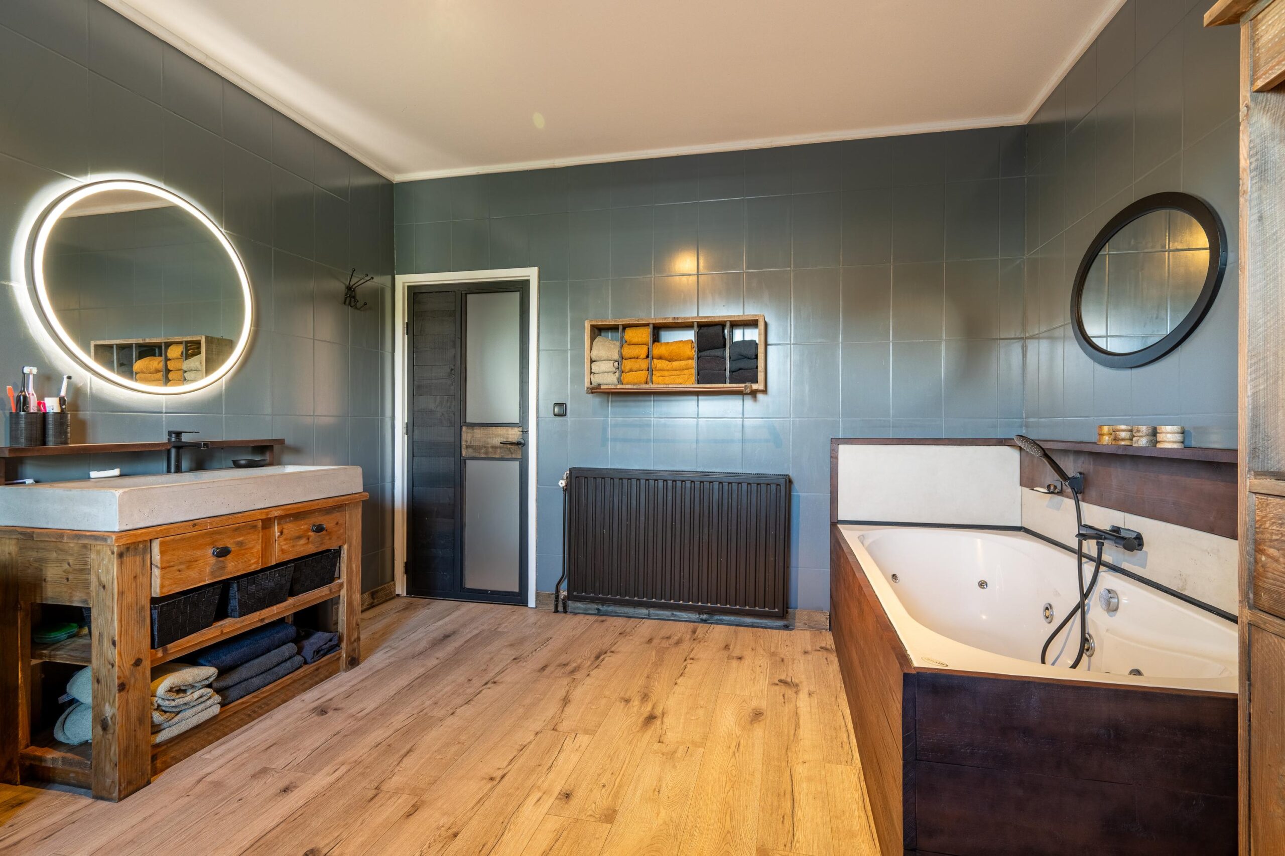 De royale badkamer 3.93 x 3.61 is geheel betegeld en beschikt over een ligbad met whirlpoolfunctie, tweede toilet, handdoekradiator, douche met stijlvolle “steellook” deur, een op maat gemaakt badmeubel, mechanische ventilatie en een raam voor daglicht en extra frisse lucht.