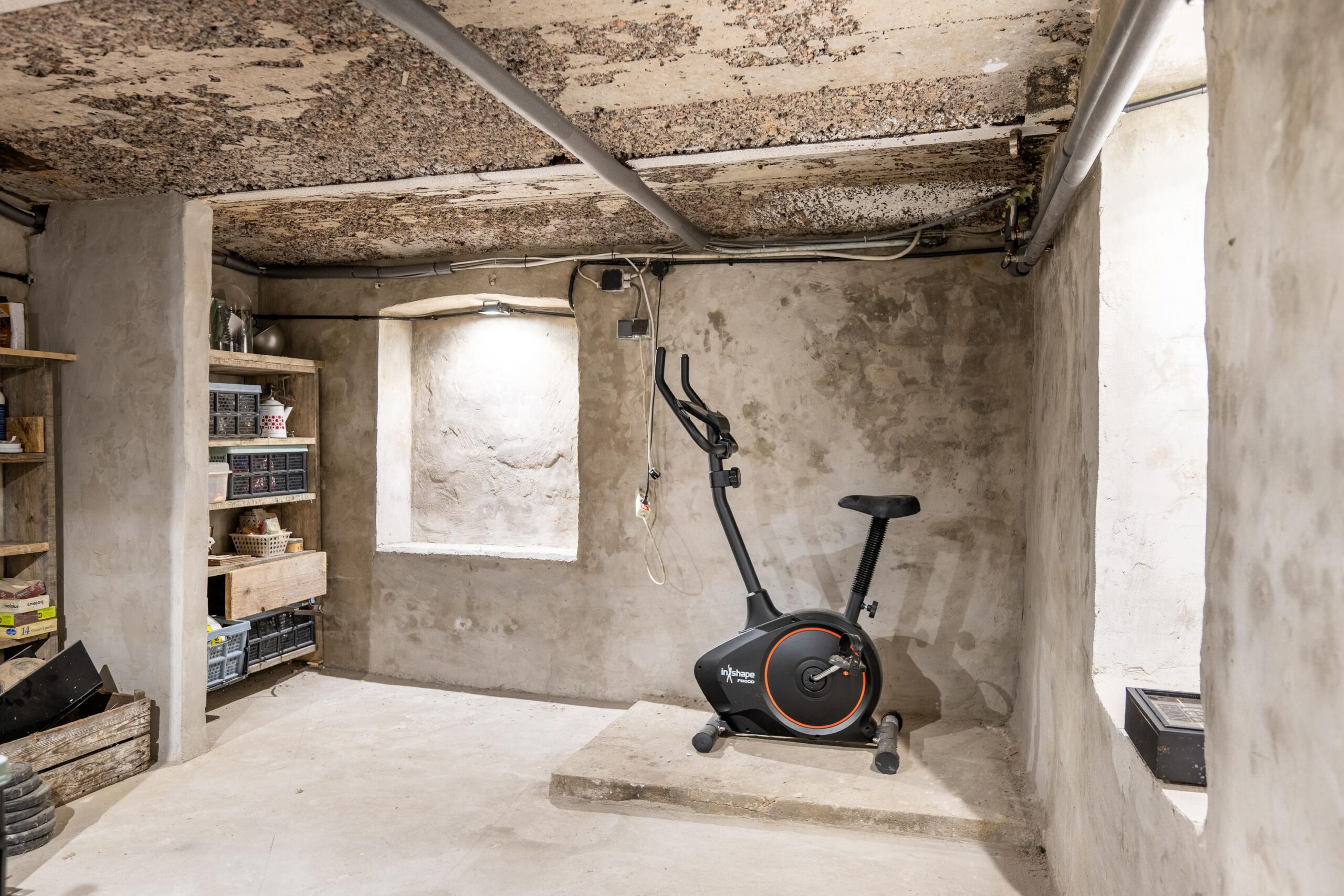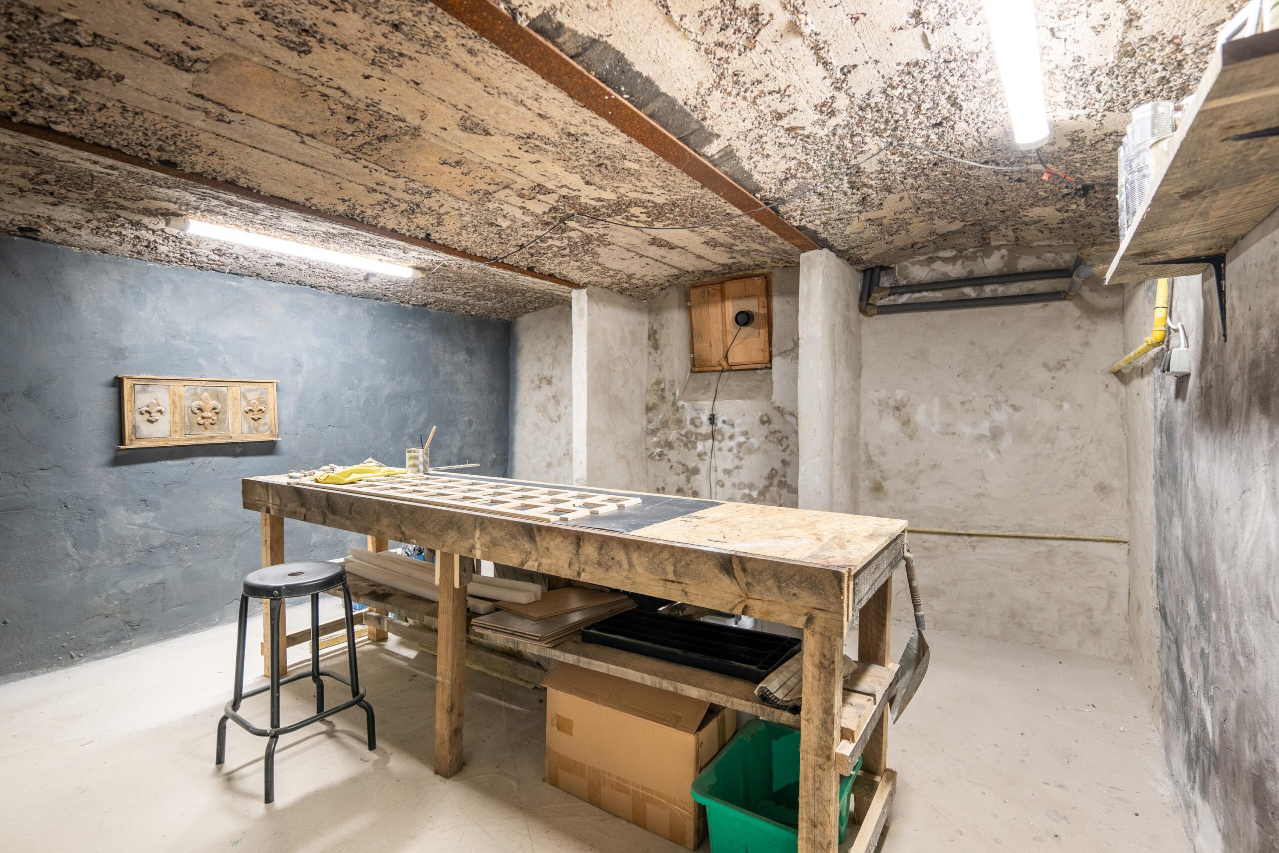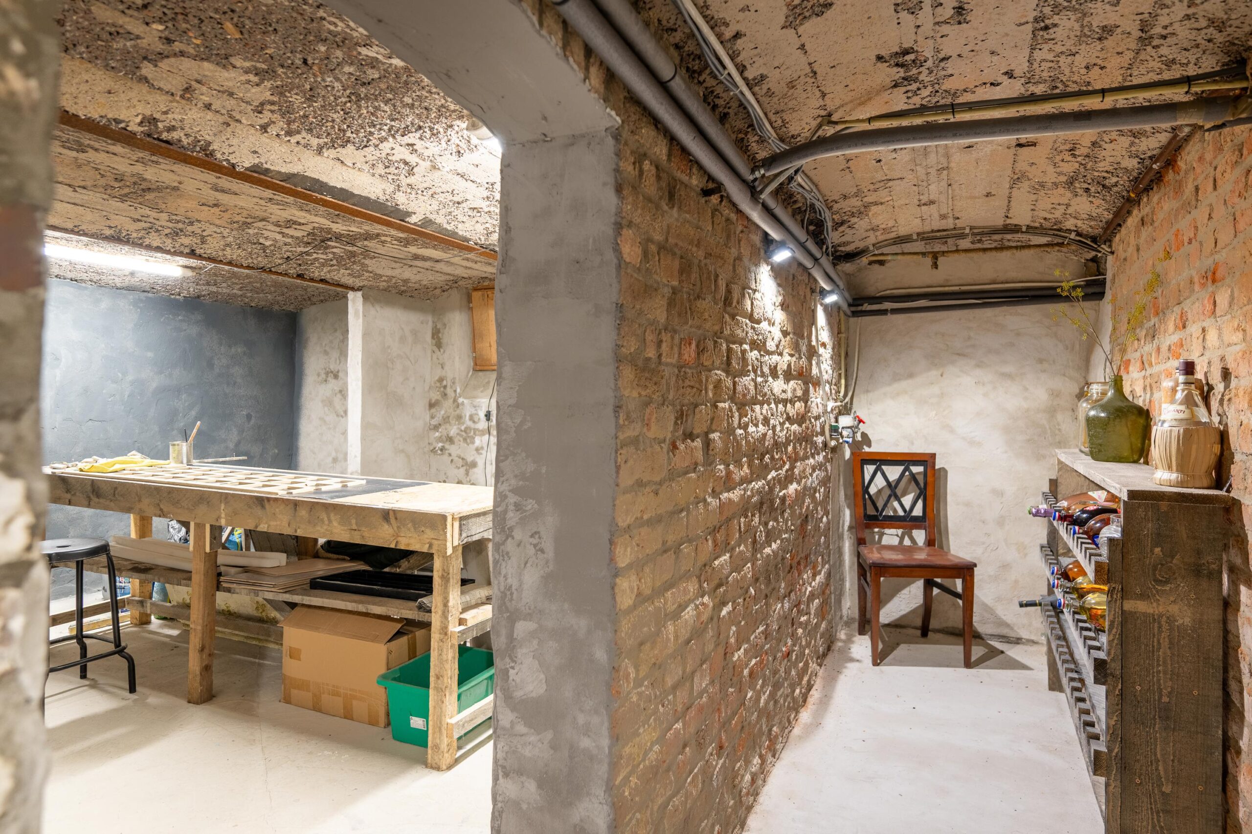Via een fraaie betonnen trap bereikt u de ruime kelder, verdeeld in drie separate ruimtes: een sfeervolle wijnkelder, een praktische werkplaats/hobbyruimte en een royale berging van respectievelijk groot:
