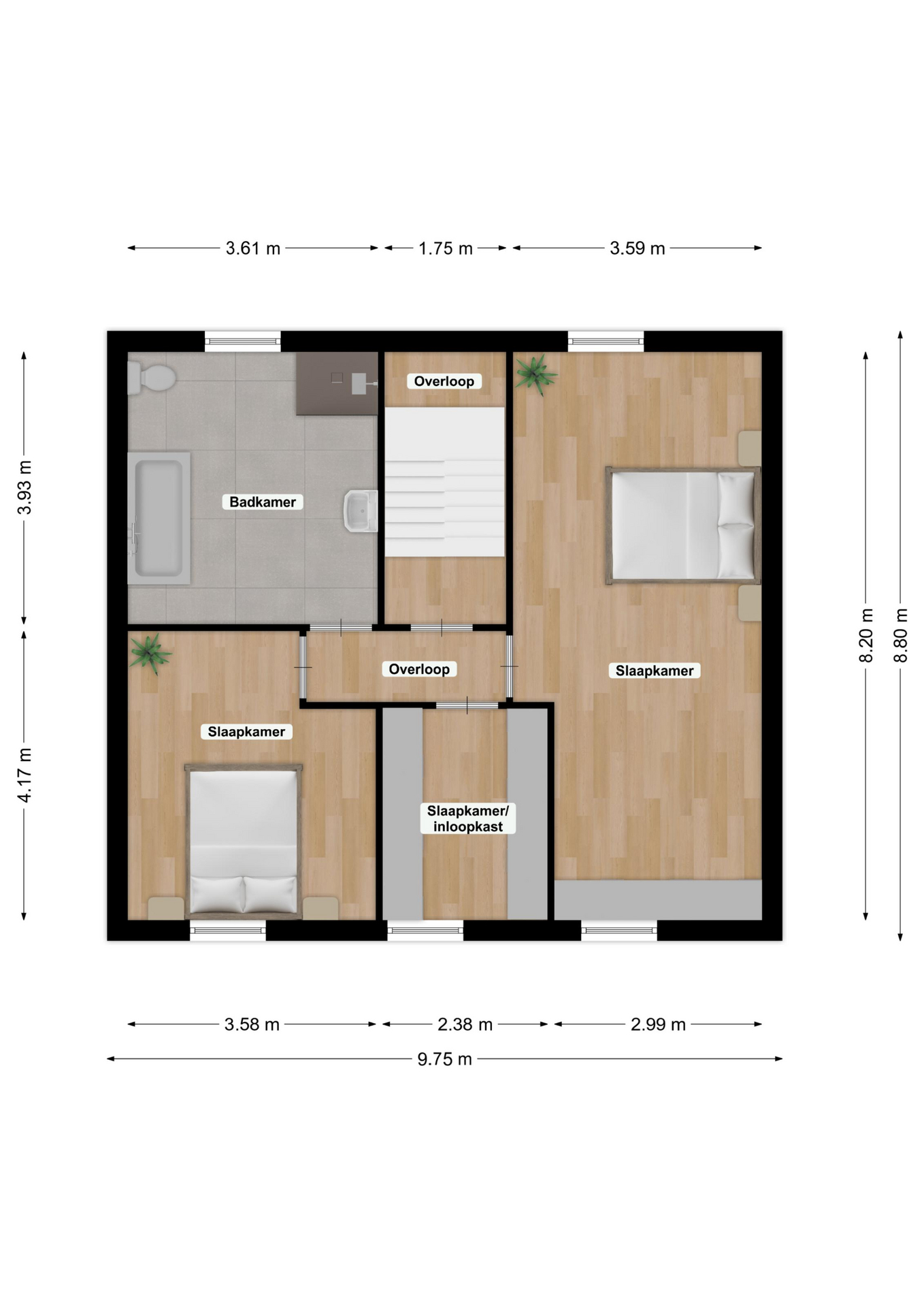 Op de ruime overloop bevinden zich drie goed afgewerkte slaapkamers, waarvan twee voorzien van airconditioning. De slaapkamers zijn respectievelijk groot: