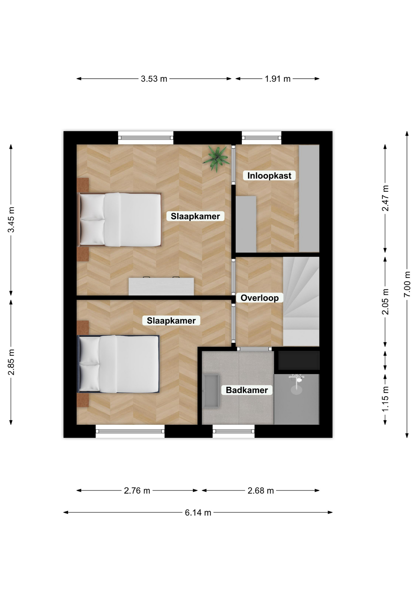 De overloop biedt toegang tot twee goed afgewerkte slaapkamers van respectievelijk: