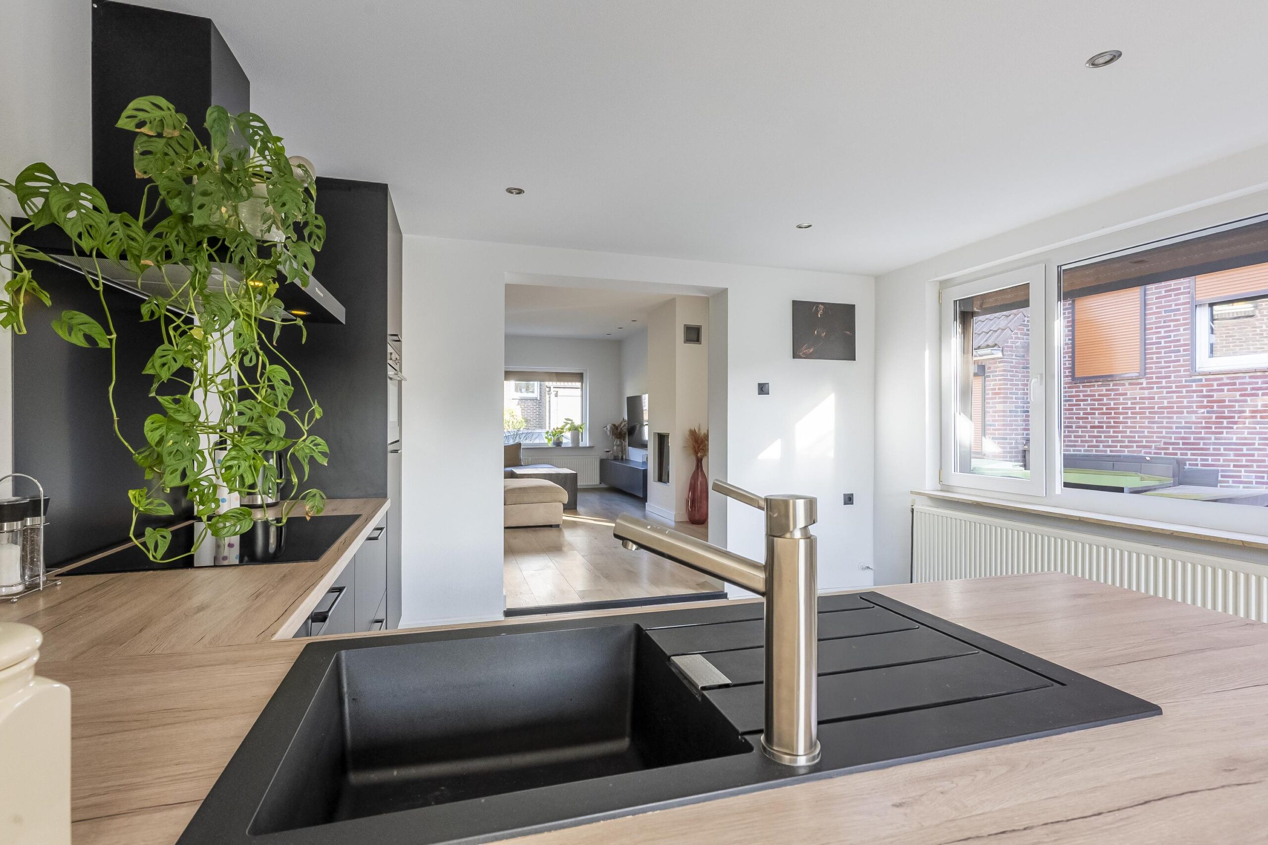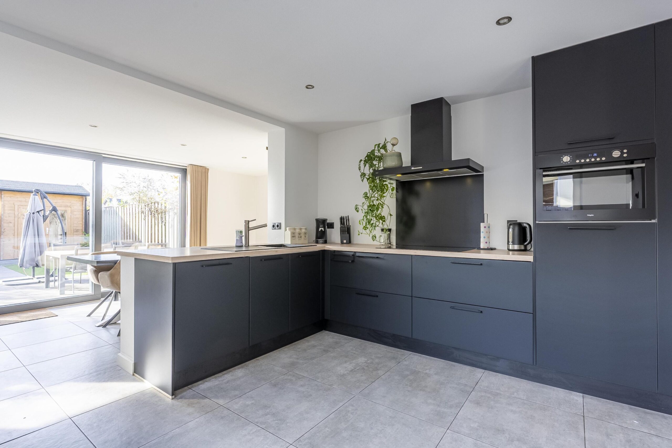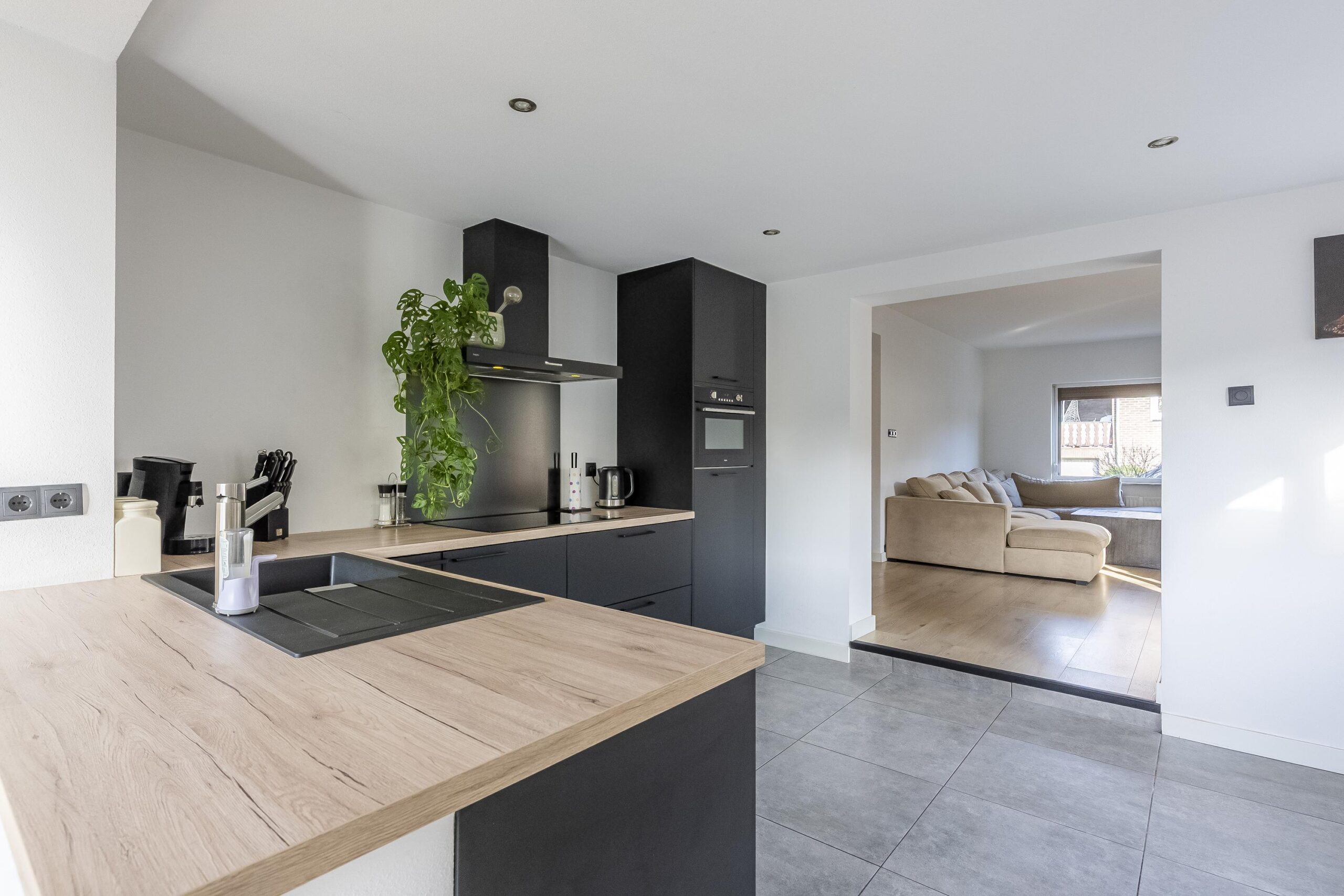 De royaal opgezette woonkamer biedt een heerlijke, ruime zithoek aan de voorzijde met veel natuurlijk lichtinval. De ruimte is afgewerkt met een moderne laminaatvloer, wanden in spuitwerk en voorzien van airconditioning voor optimaal comfort. De woonkamer staat in open verbinding met de centraal gelegen keuken en eetkamer. De moderne L-vormige matzwarte keuken is uitgerust met diverse inbouwapparatuur, waaronder een koelkast, combimagnetron, inductiekookplaat, afzuigkap en vaatwasser.