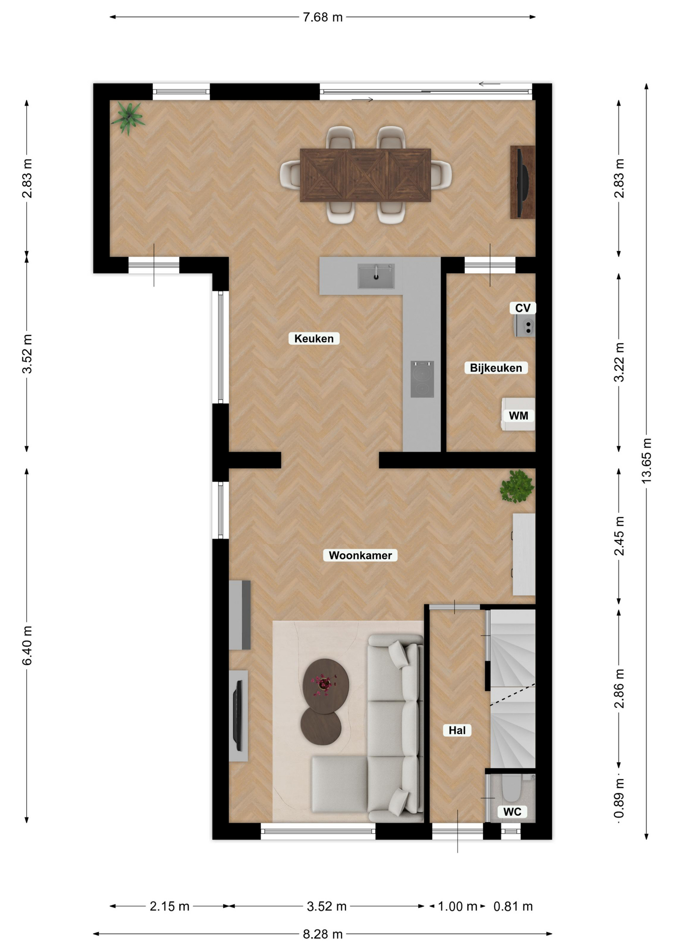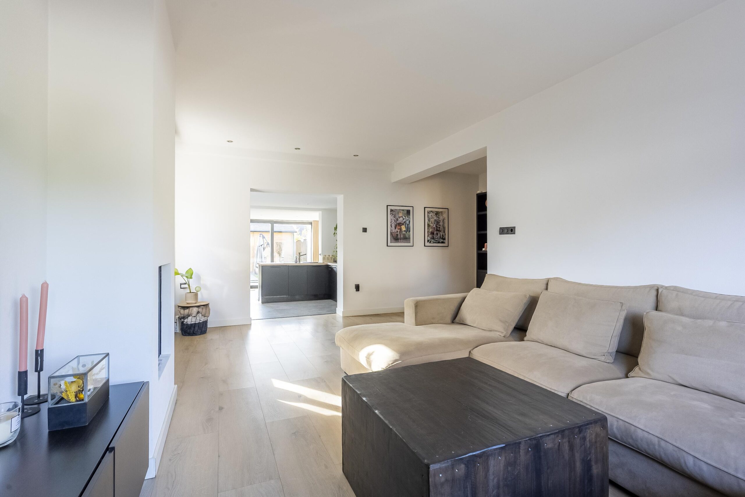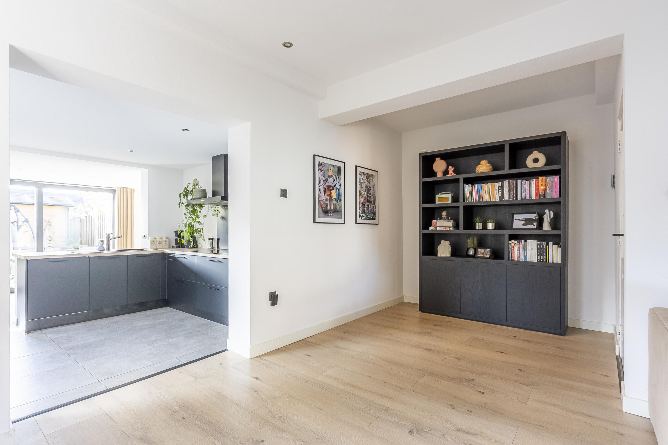 De royaal opgezette woonkamer biedt een heerlijke, ruime zithoek aan de voorzijde met veel natuurlijk lichtinval. De ruimte is afgewerkt met een moderne laminaatvloer, wanden in spuitwerk en voorzien van airconditioning voor optimaal comfort. De woonkamer staat in open verbinding met de centraal gelegen keuken en eetkamer. De moderne L-vormige matzwarte keuken is uitgerust met diverse inbouwapparatuur, waaronder een koelkast, combimagnetron, inductiekookplaat, afzuigkap en vaatwasser.
