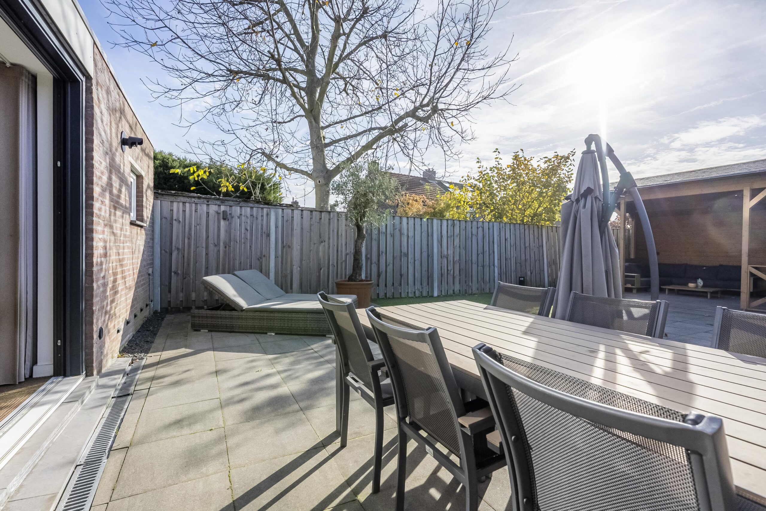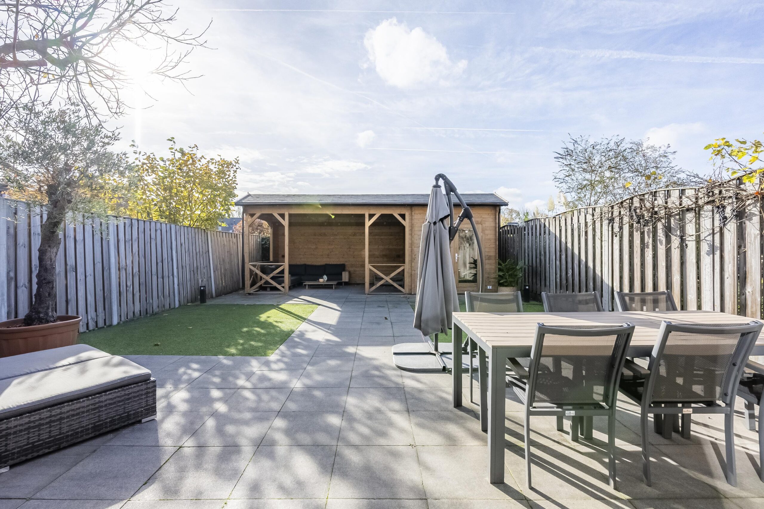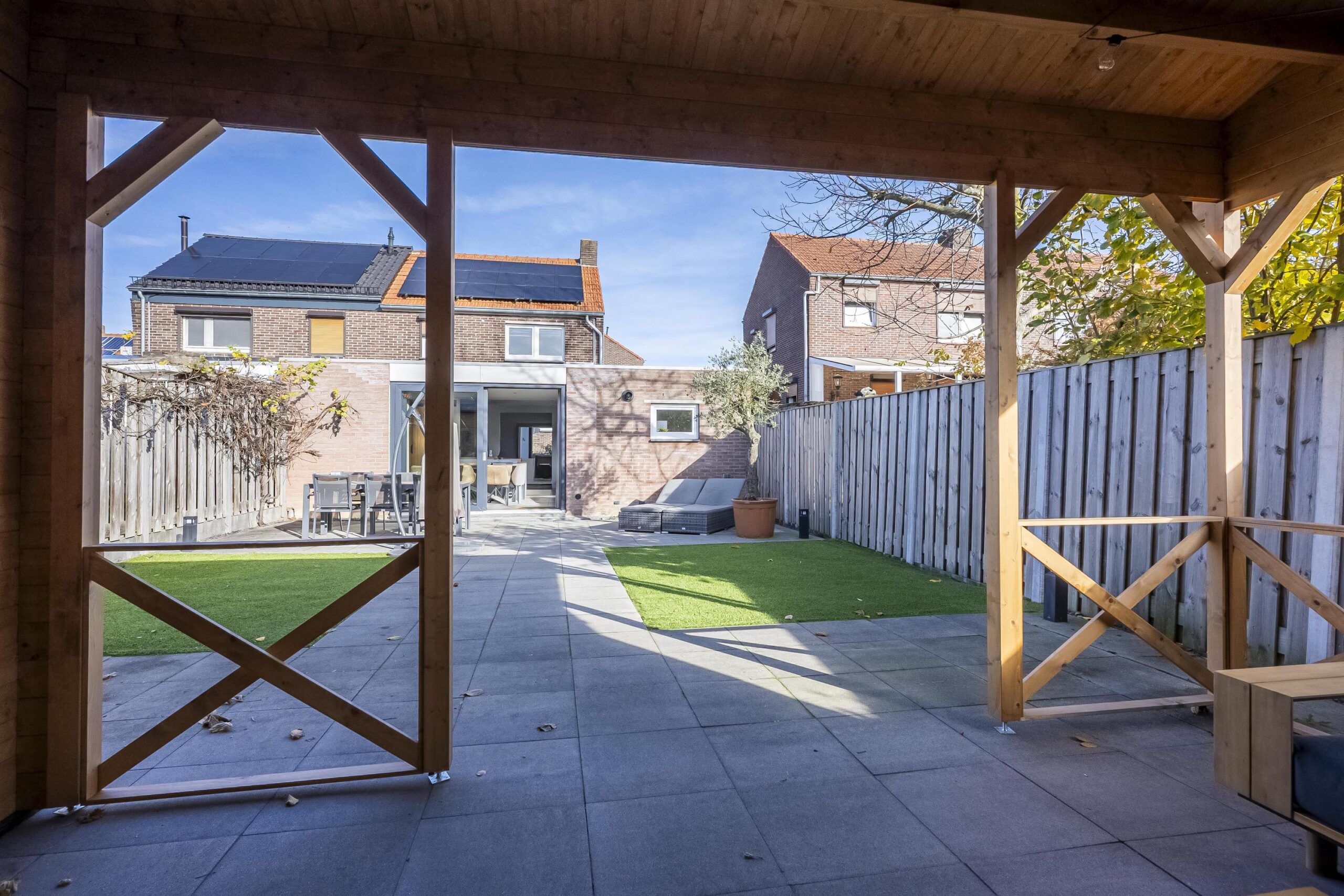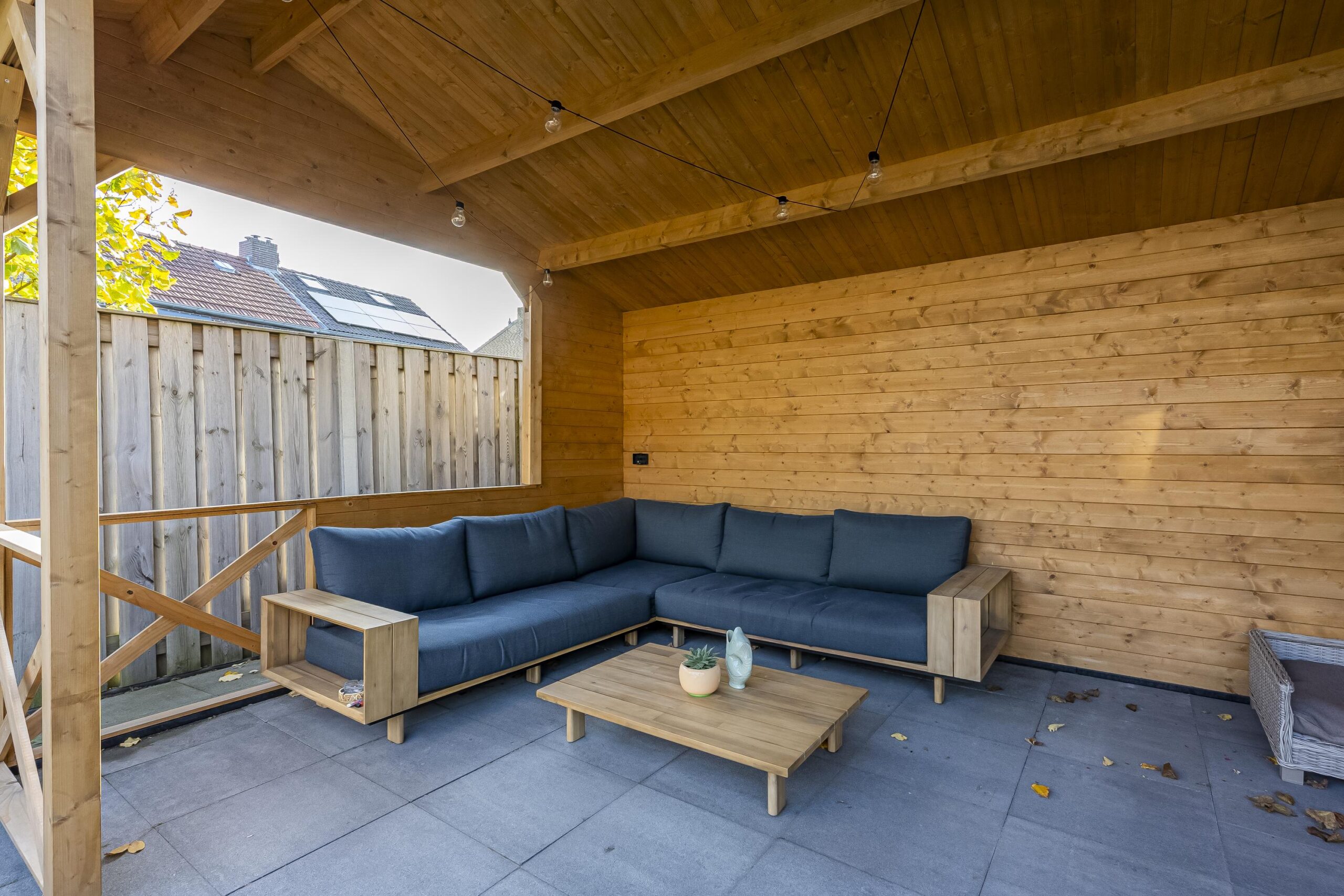 Via de royale schuifpui vanuit de eetkamer stap je de fraai aangelegde, geheel vernieuwde achtertuin in. Deze beschikt over een ruim terras, onderhoudsvriendelijk kunstgras en achterin een houten overkapping met tuinhuis. Perfect voor lange zomeravonden.