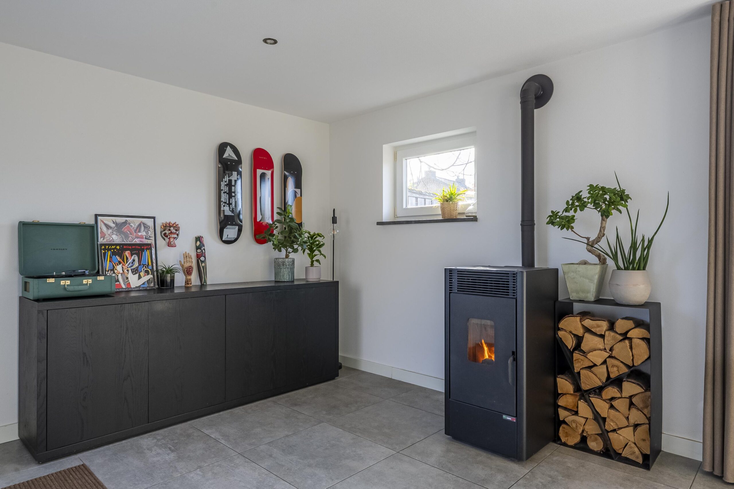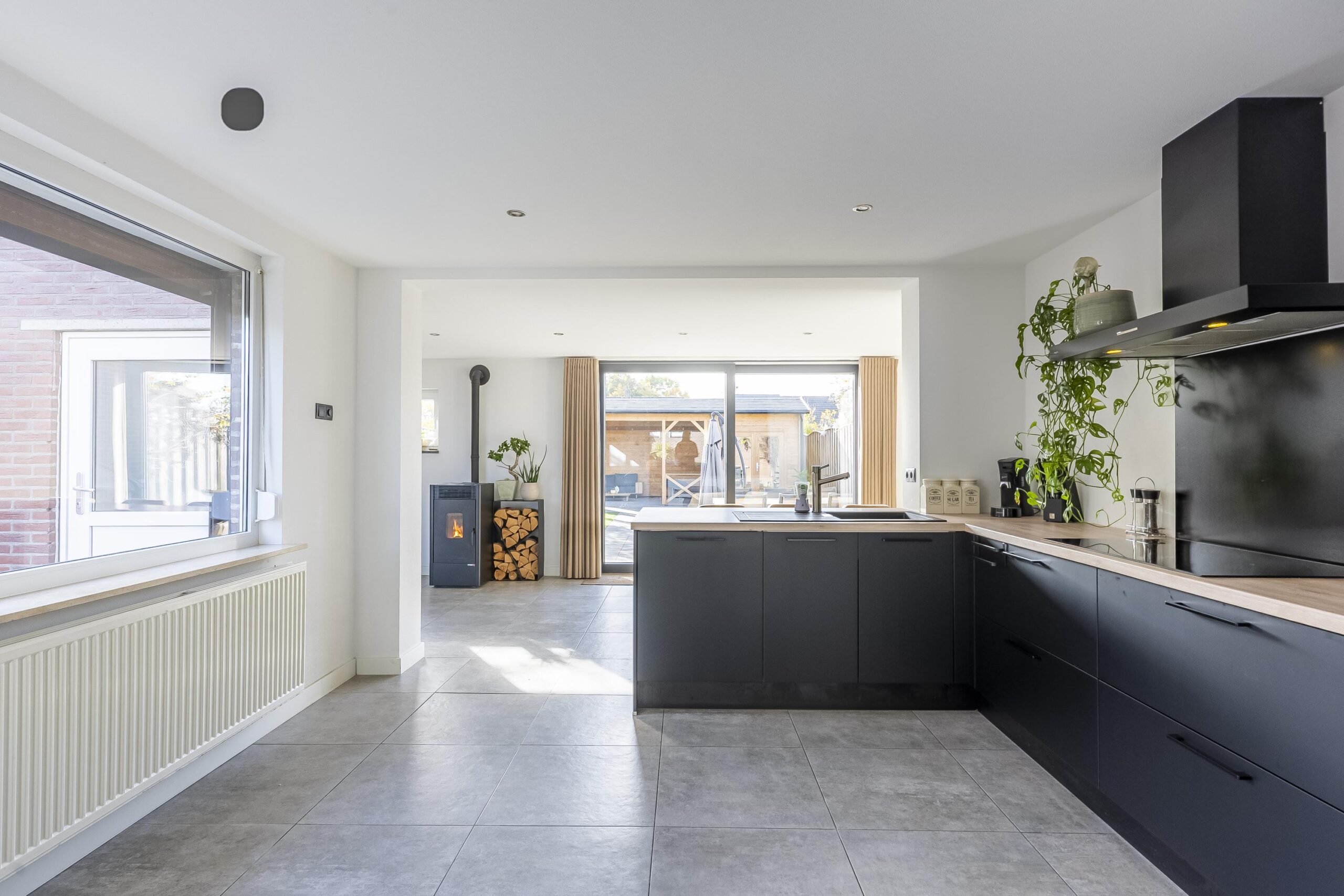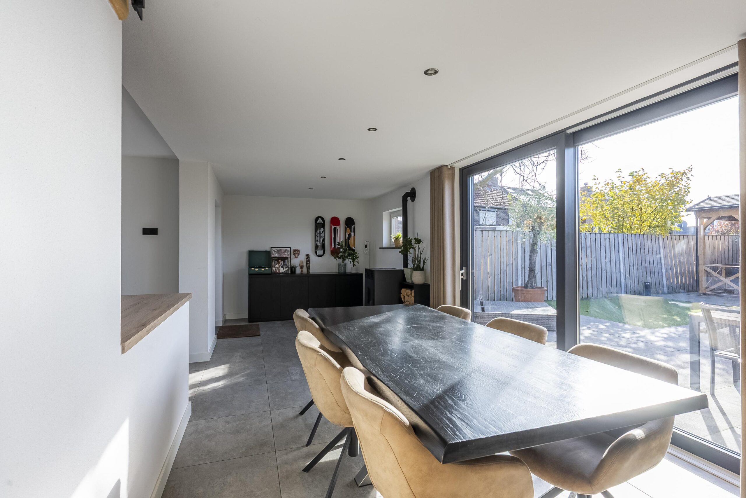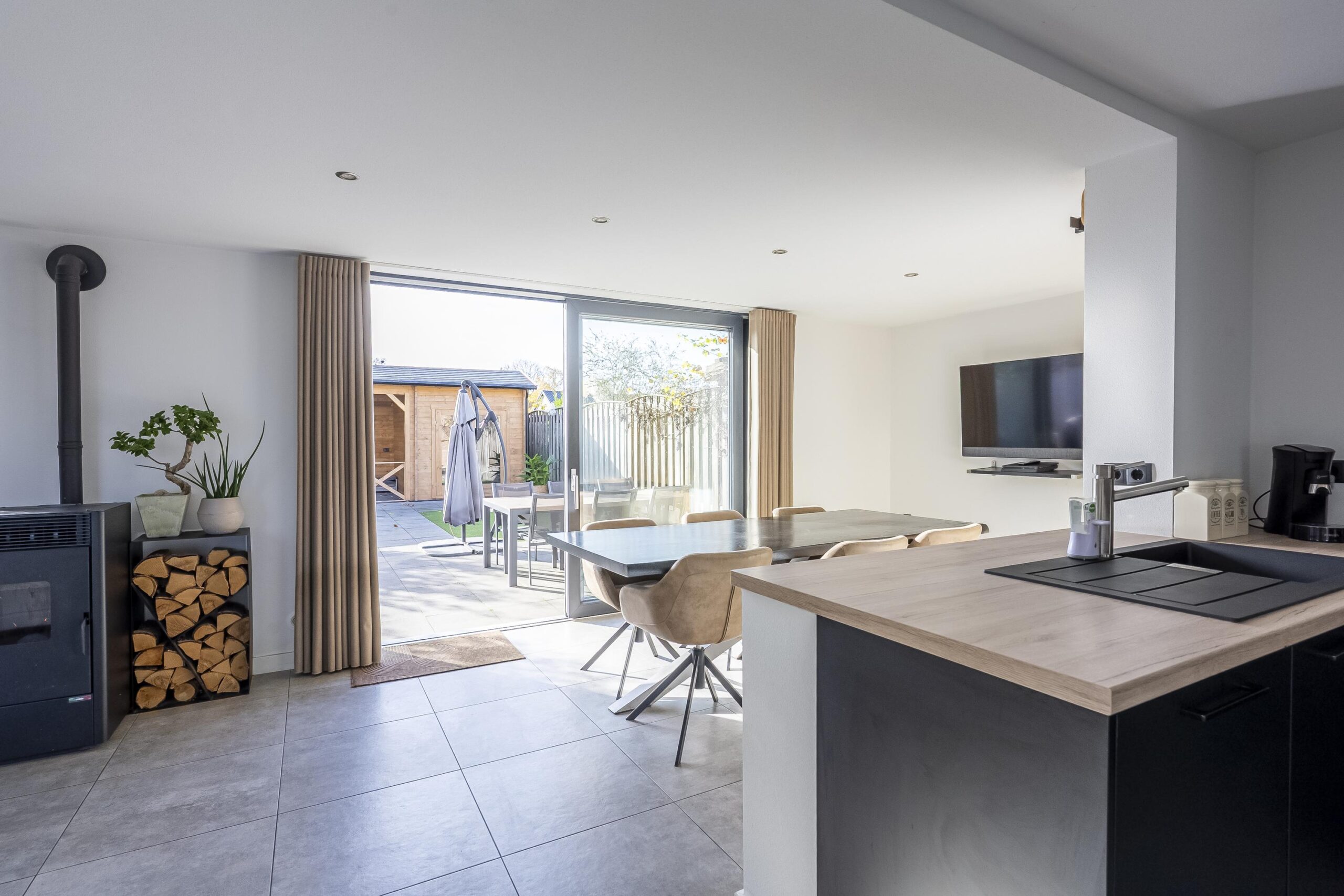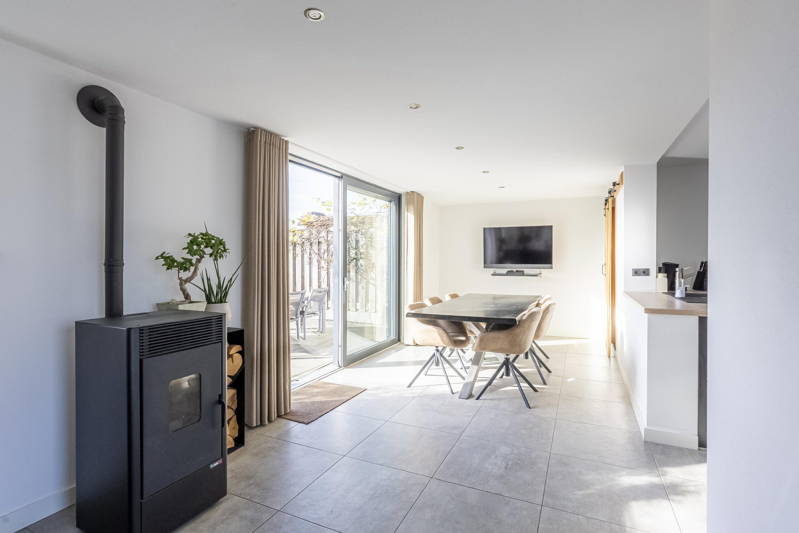 Aangrenzend bevindt zich de gezellige en ruime eetkamer met pelletkachel, die zorgt voor extra warmte en sfeer. De keuken en eetkamer zijn afgewerkt met een moderne betonlook tegelvloer. Door de royale schuifpui geniet men het gehele jaar hier van een uitstekende lichtinval.