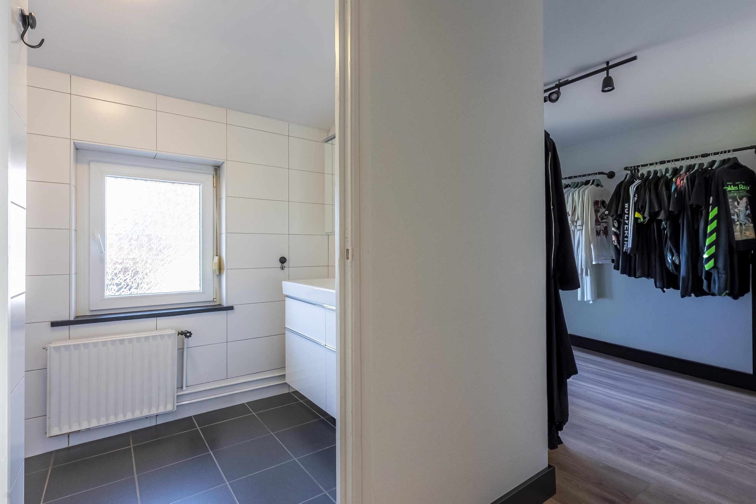 De slaapkamer aan de achterzijde beschikt over airconditioning en een doorloop naar een inloopkast, die desgewenst ook als derde slaapkamer kan worden ingericht. De geheel betegelde, tijdloze badkamer is voorzien van een inloopdouche, dubbele wastafel met bijpassend badmeubel, spiegelkast, radiator en een raam voor natuurlijke ventilatie en daglicht.