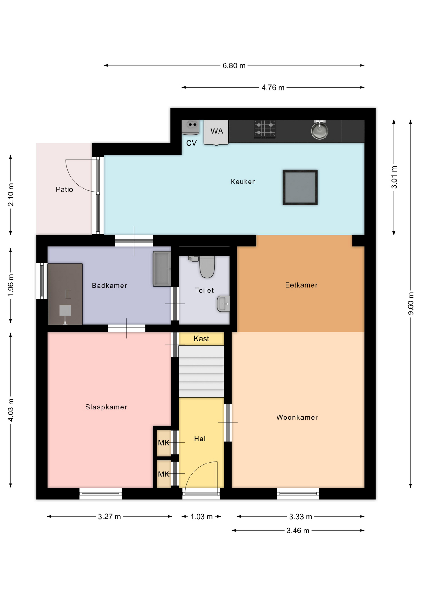 Via de inkomhal heeft u toegang tot de trapopgang naar de eerste verdieping, de meterkast en de eerste woning op de begane grond. De woonkamer staat in open verbinding met de keuken. De keuken, in lijnopstelling, is uitgerust met een vaatwasser, 4-pits gasfornuis, spoelbak, koelkast met vriesvak en afzuigkap. Naast de keuken bevinden zich de witgoedaansluitingen en de cv-installatie. Via de keuken bereikt u de badkamer en de slaapkamer aan de voorzijde van de woning.