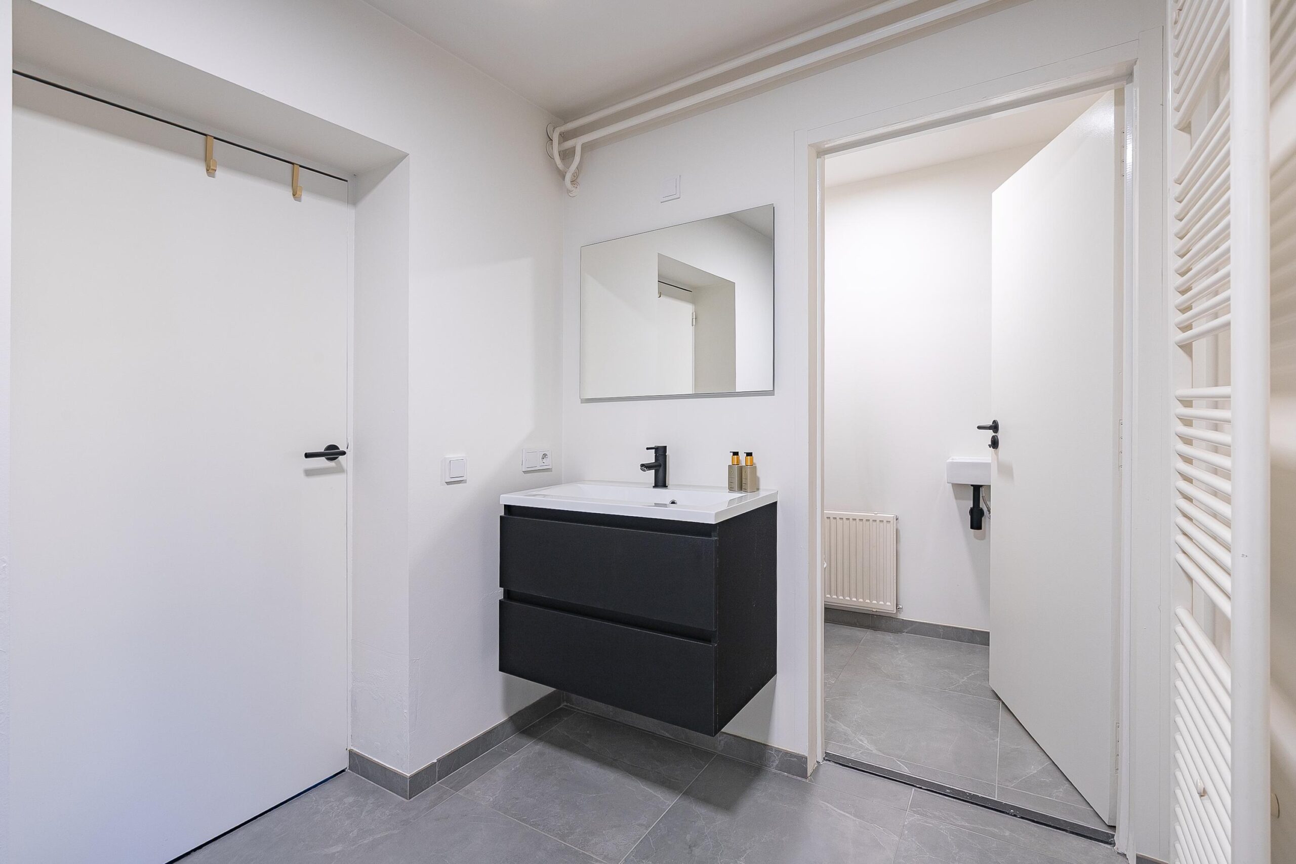 De badkamer is uitgerust met een inloopdouche, wastafel en een separaat toilet. Vanuit de keuken is er toegang tot een kleine patio met achterom.