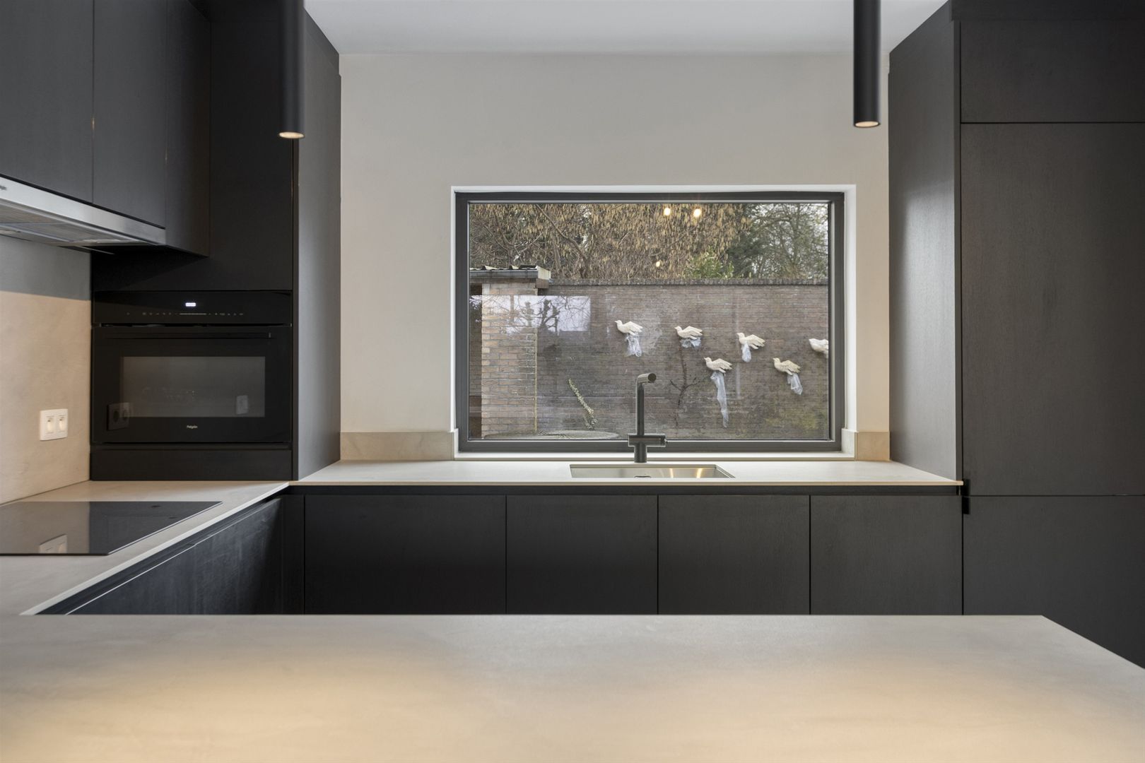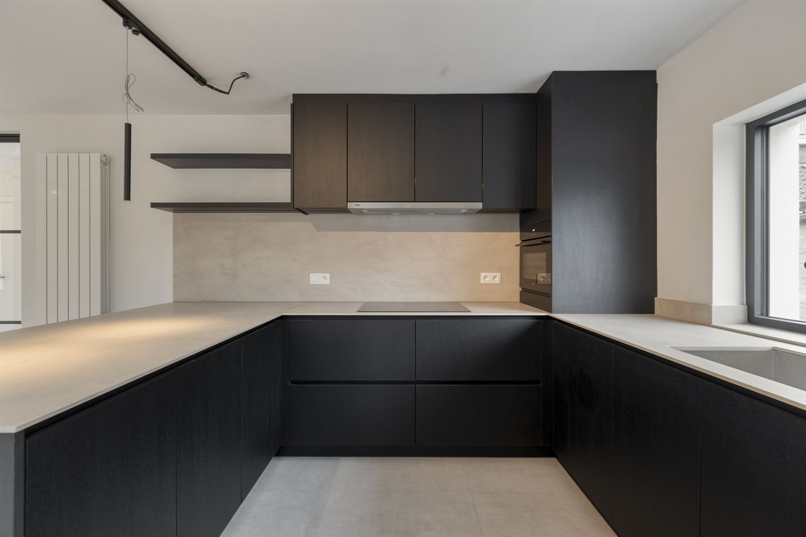 Luxe open keuken (zwarte houtlook frontjes en een betonlook keramisch werkblad), voorzien van inductiekookplaat, dampkap, vaatwasser, koelkast, diepvries en combi-magnetron