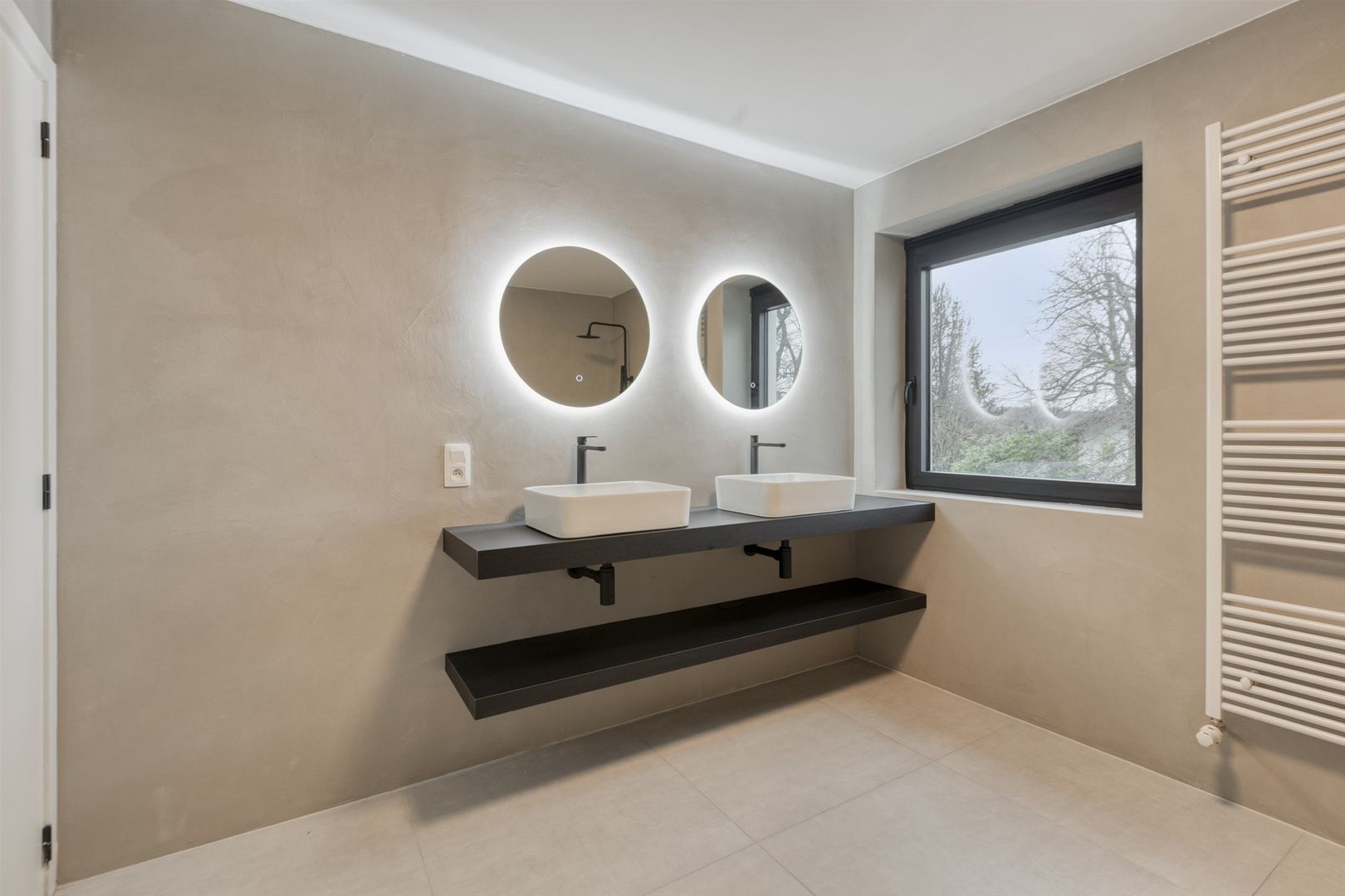 Luxe badkamer met ligbad, hangtoilet en een dubbele wastafel met spiegel