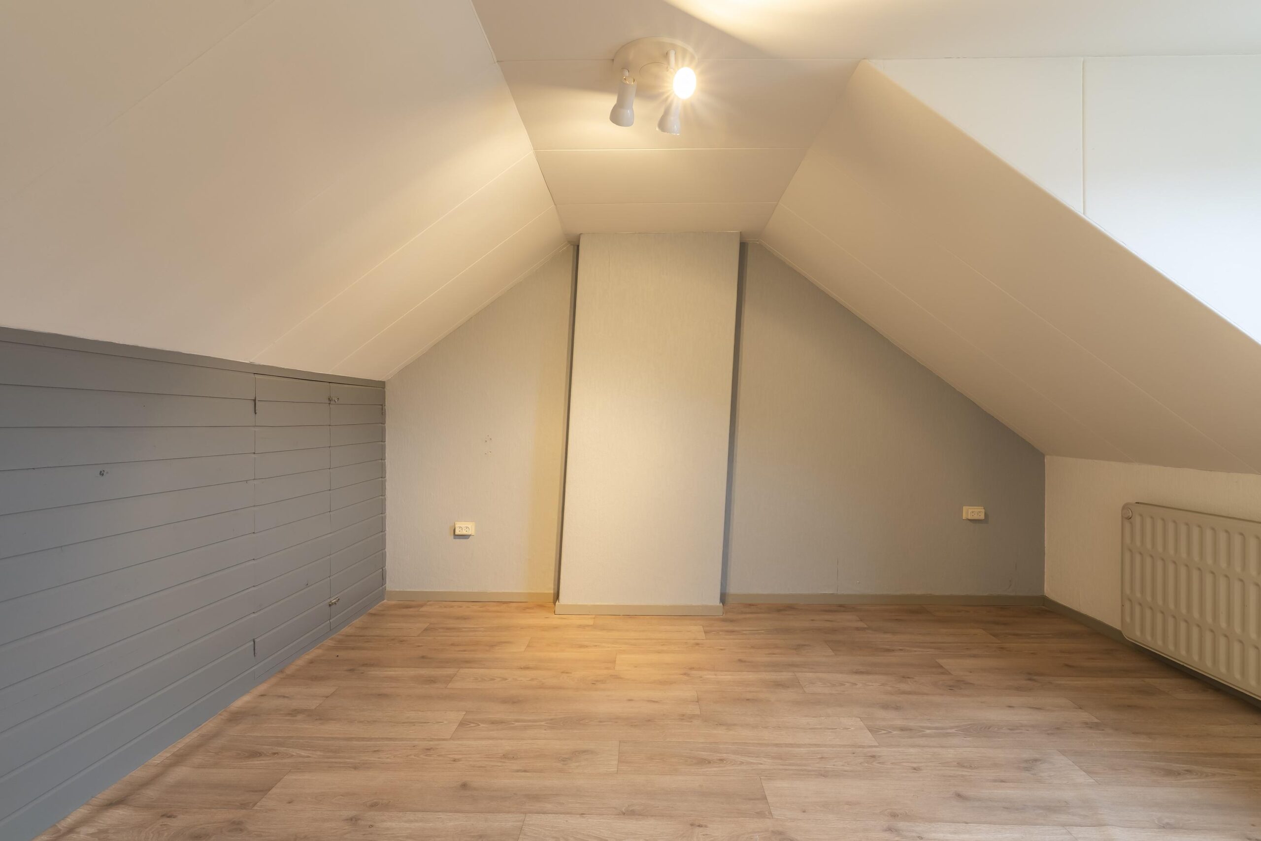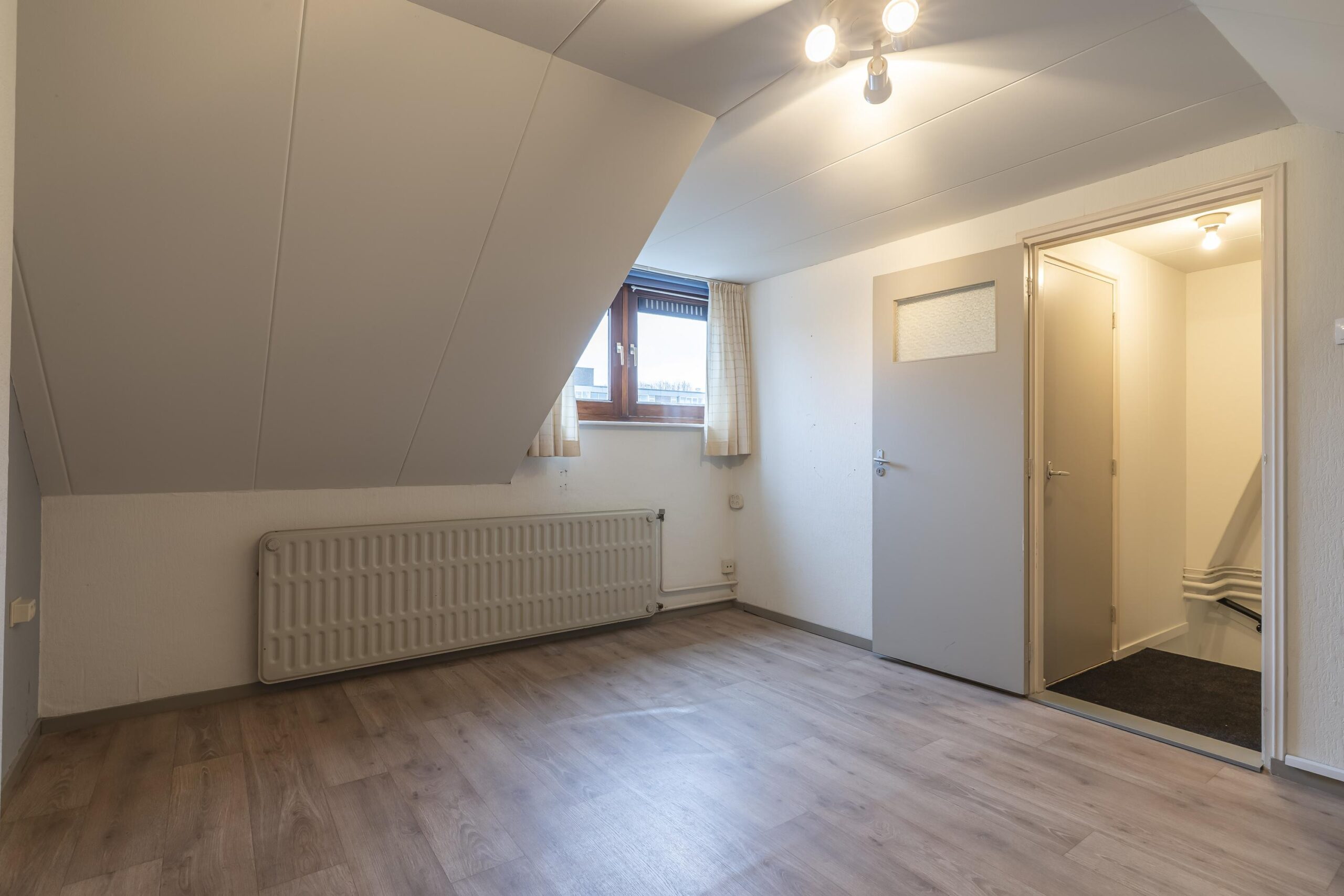De zolder is afgewerkt met een lichte vinylvloer en biedt extra bergruimte en een extra slaapkamer (ca. 12m²). In de technische ruimte op zolder bevindt zich de CV-installatie (Nefit, ca. 15 jaar oud, eigendom). Op deze verdieping is een houten kozijn met enkelglas aanwezig.