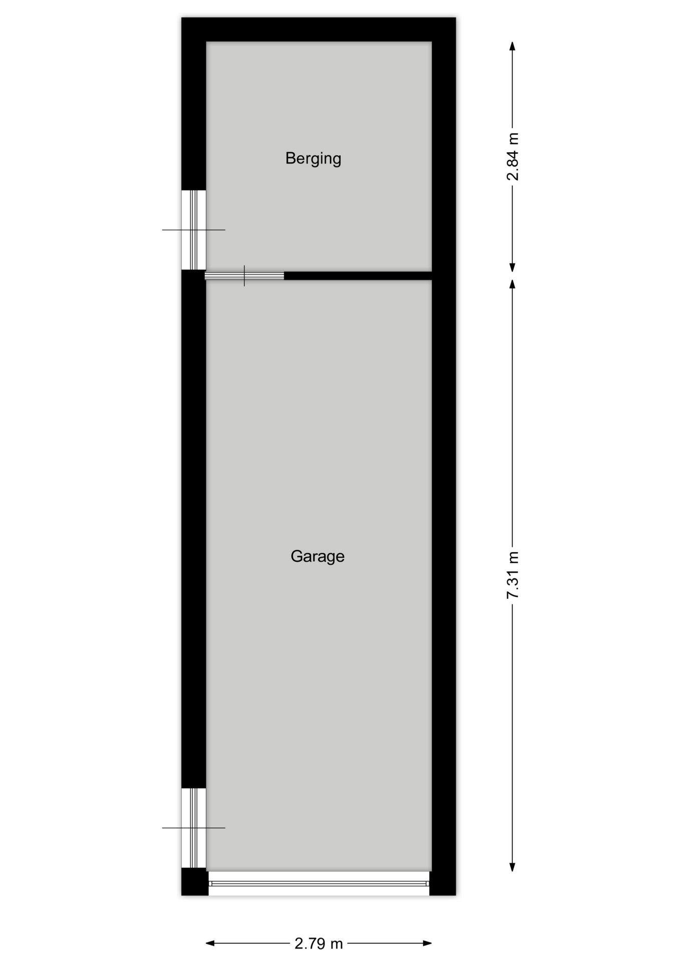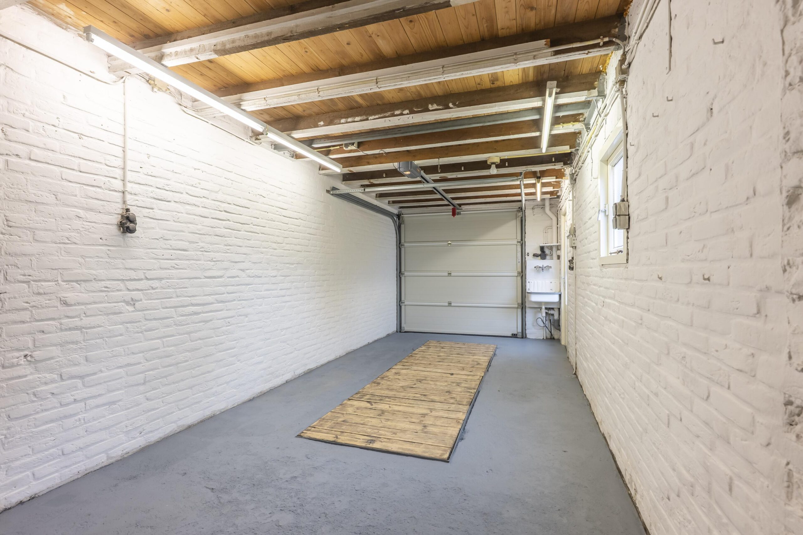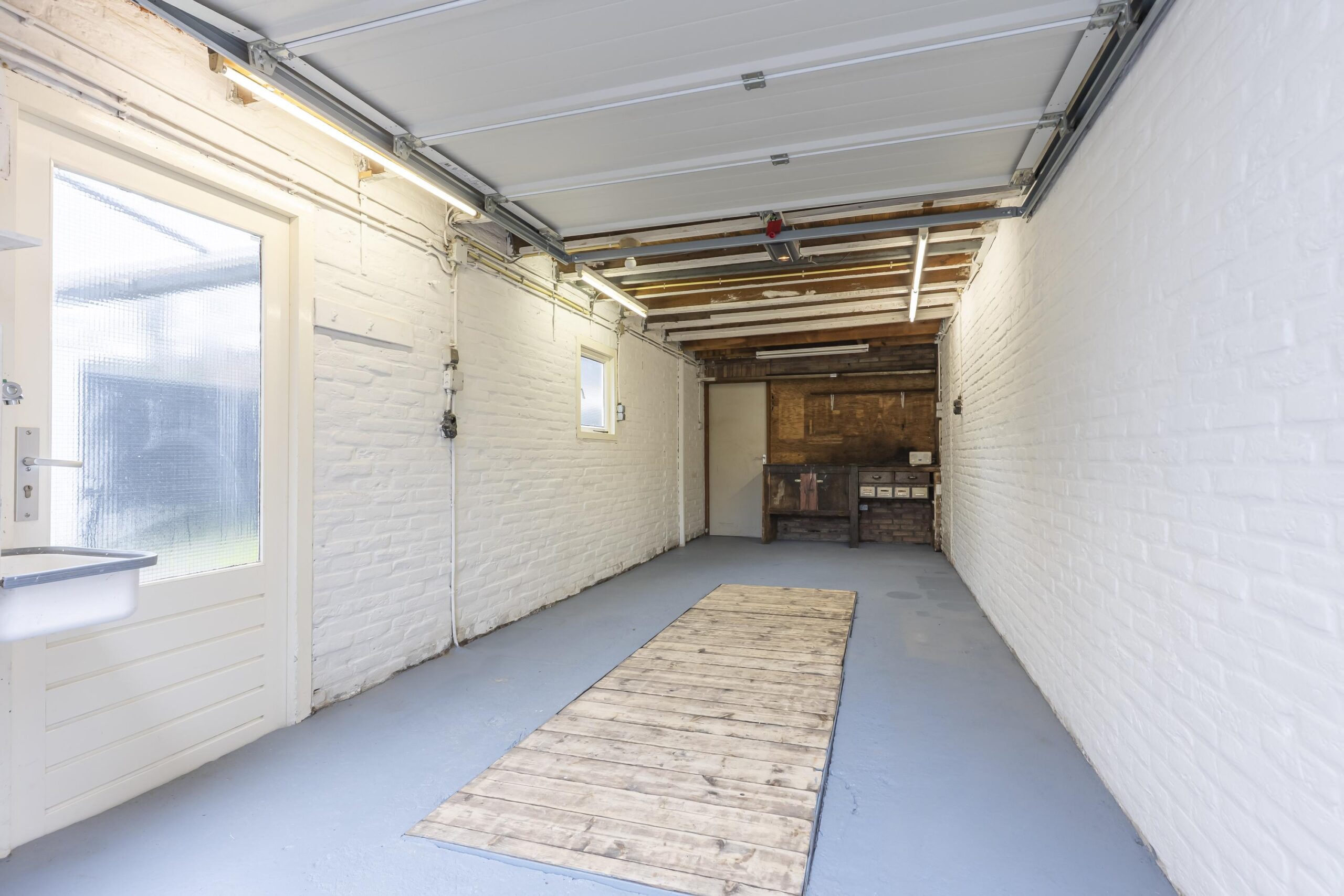 De ruime garage (ca. 20m²) is voorzien van een elektrische sectionaalpoort, warm en koud water en elektra. Een groot pluspunt is de 2 meter diepe smeerput. Achter de garage bevindt zich nog een extra berging (ca. 7m²), ideaal voor fietsen of tuingereedschap.