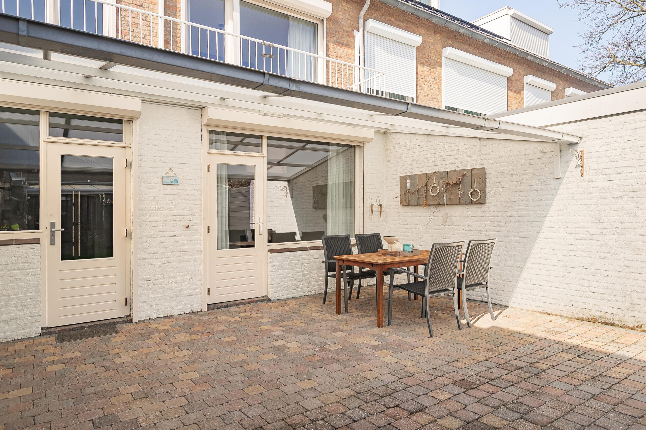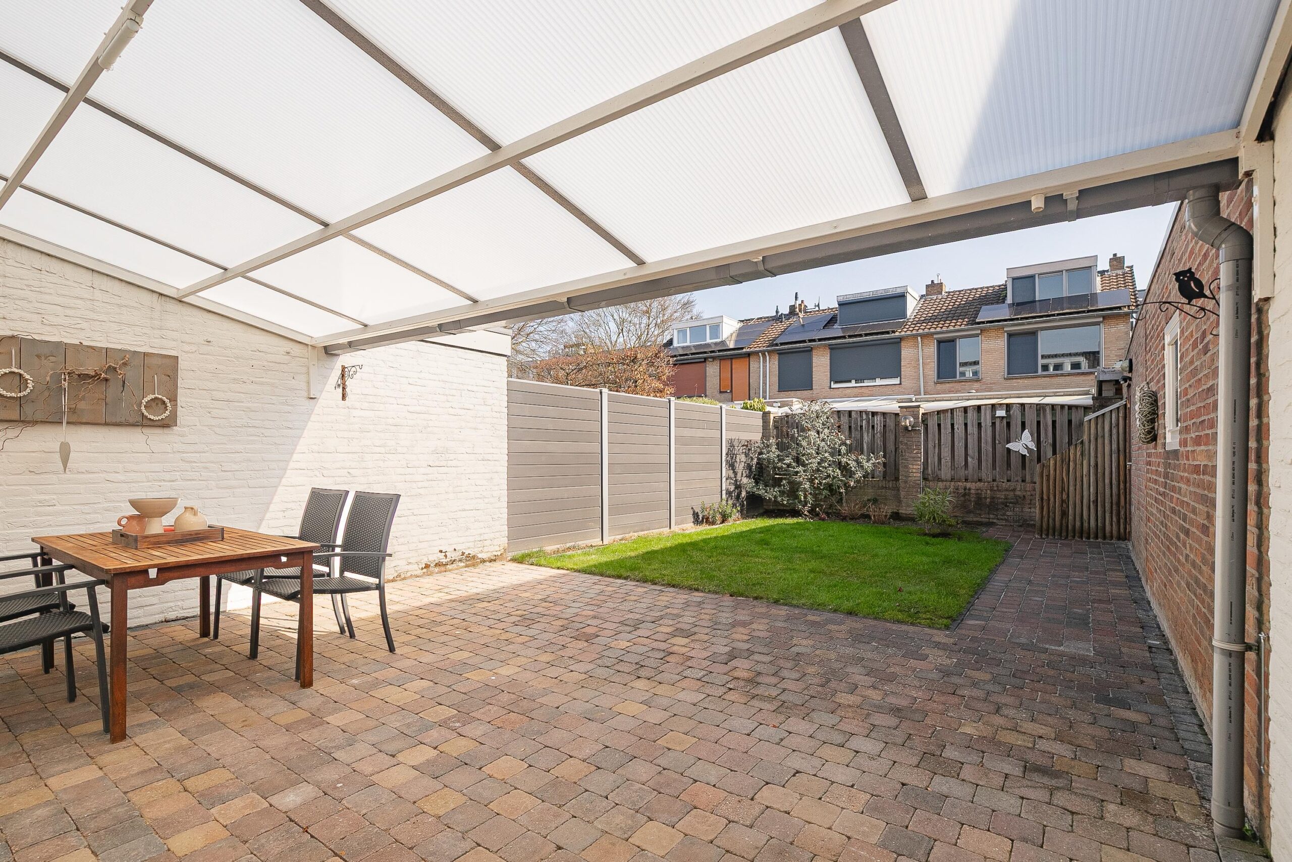 De onderhoudsvriendelijke achtertuin is bereikbaar via een achterom en biedt een prettige mix van terras, gazon en een overkapping waar men heerlijk beschut kan zitten.
