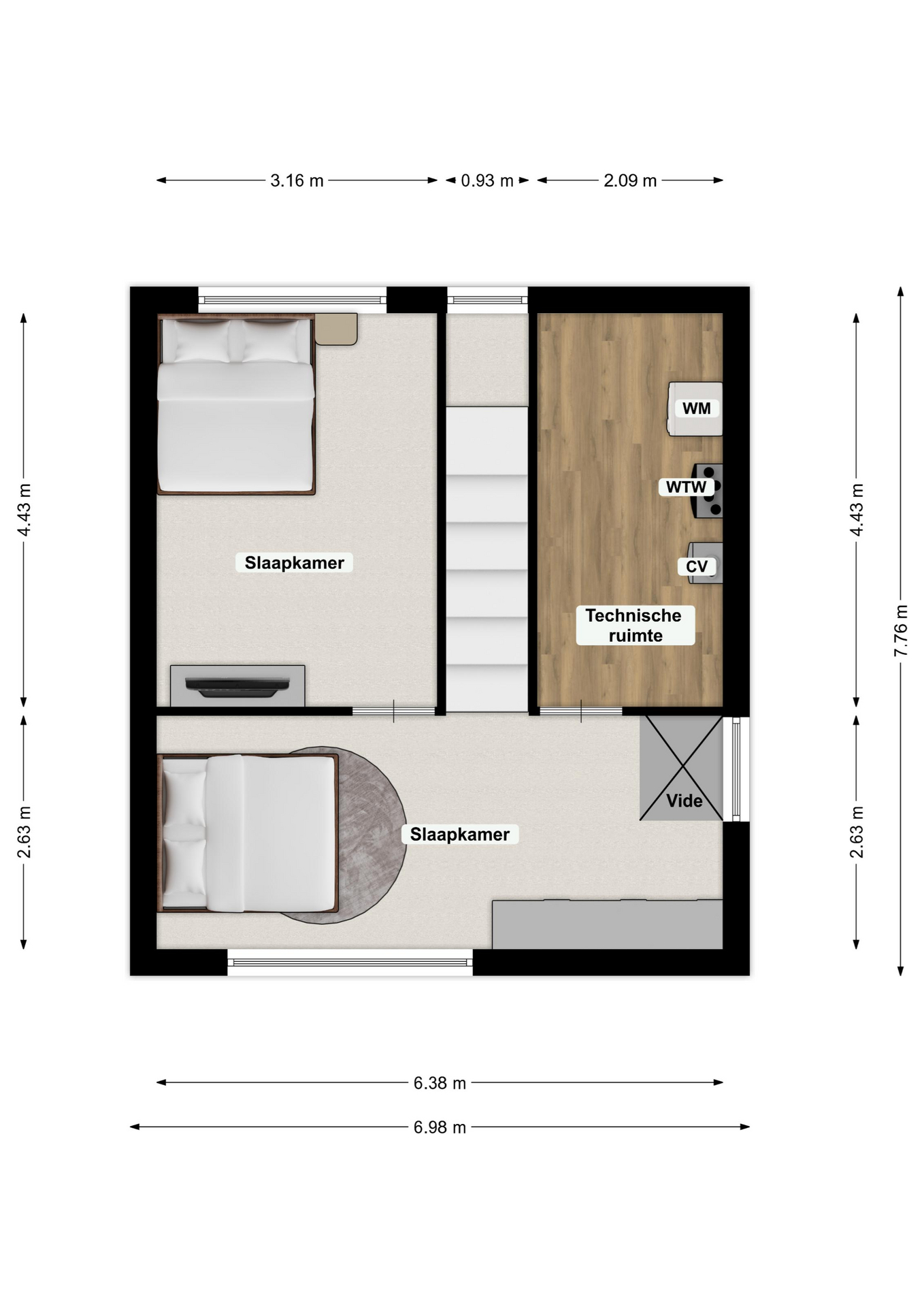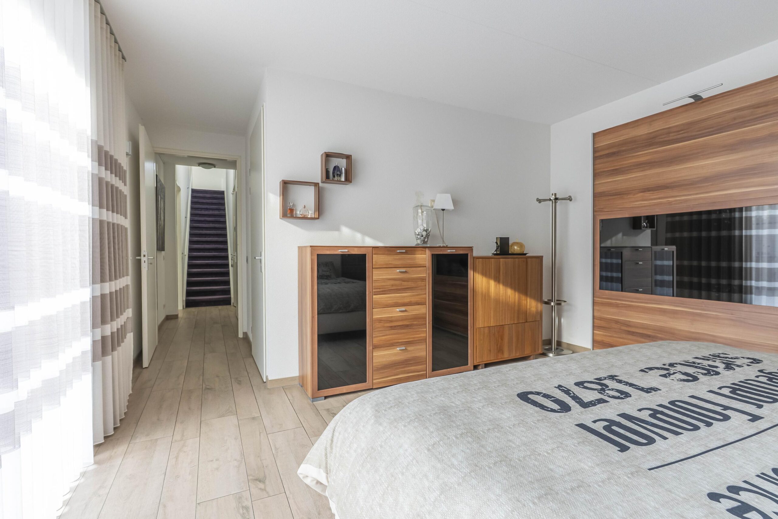 Via een gemakkelijk beloopbare trap betreedt u de eerste verdieping met twee royale slaapkamers, waarvan één met airconditioning. Daarnaast bevindt zich hier een technische ruimte met aansluiting voor wasmachine, WTW-installatie, cv-ketel (Intergas, eigendom, 2012) en omvormers voor de 21 zonnepanelen.