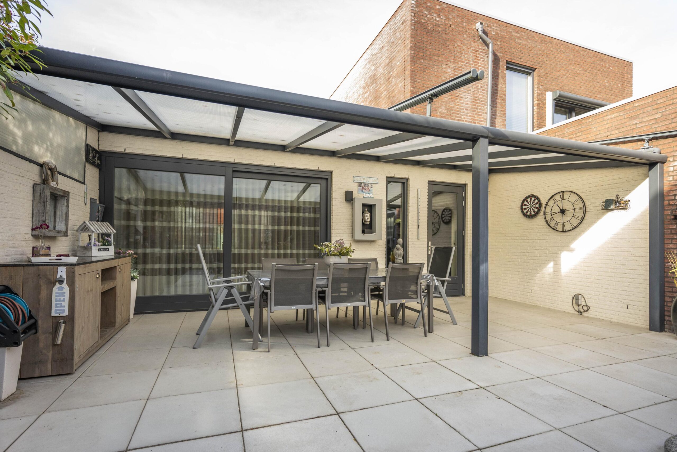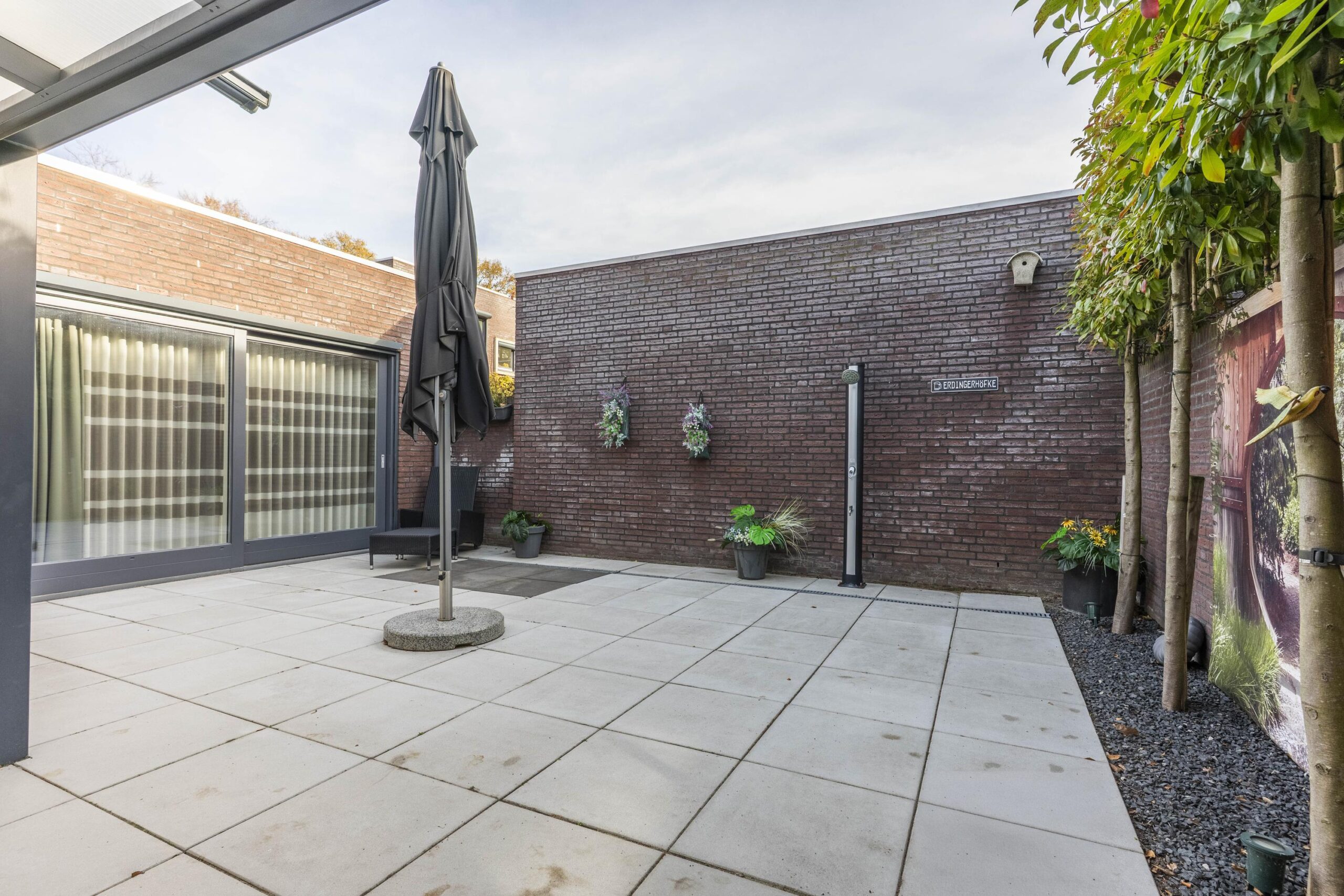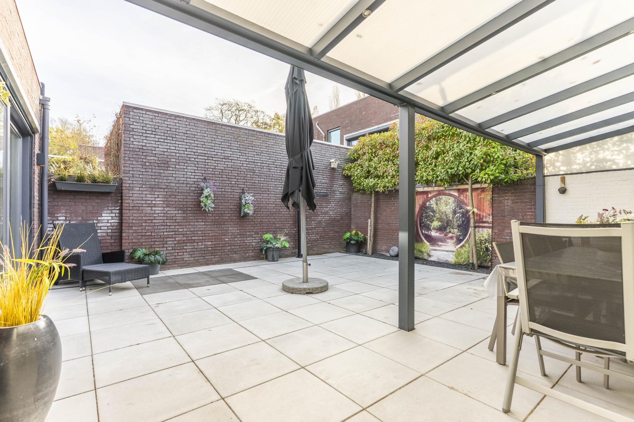 Vanuit de keuken, woonkamer en slaapkamer is er directe toegang tot de fraai aangelegde, geheel omsloten patiotuin met een luxe uitstraling. De tuin beschikt over een antracieten aluminium terrasoverkapping met ingebouwde verlichting en zonwering, evenals een buitendouche — een heerlijke plek om in privacy van de zon te genieten.
