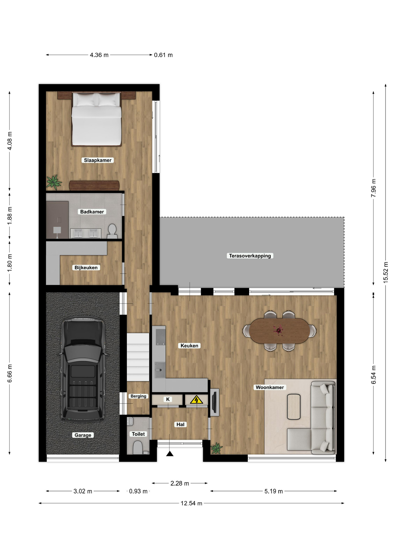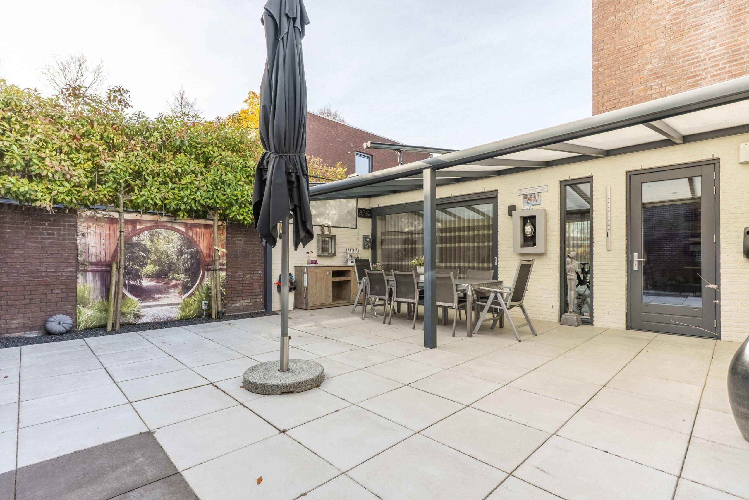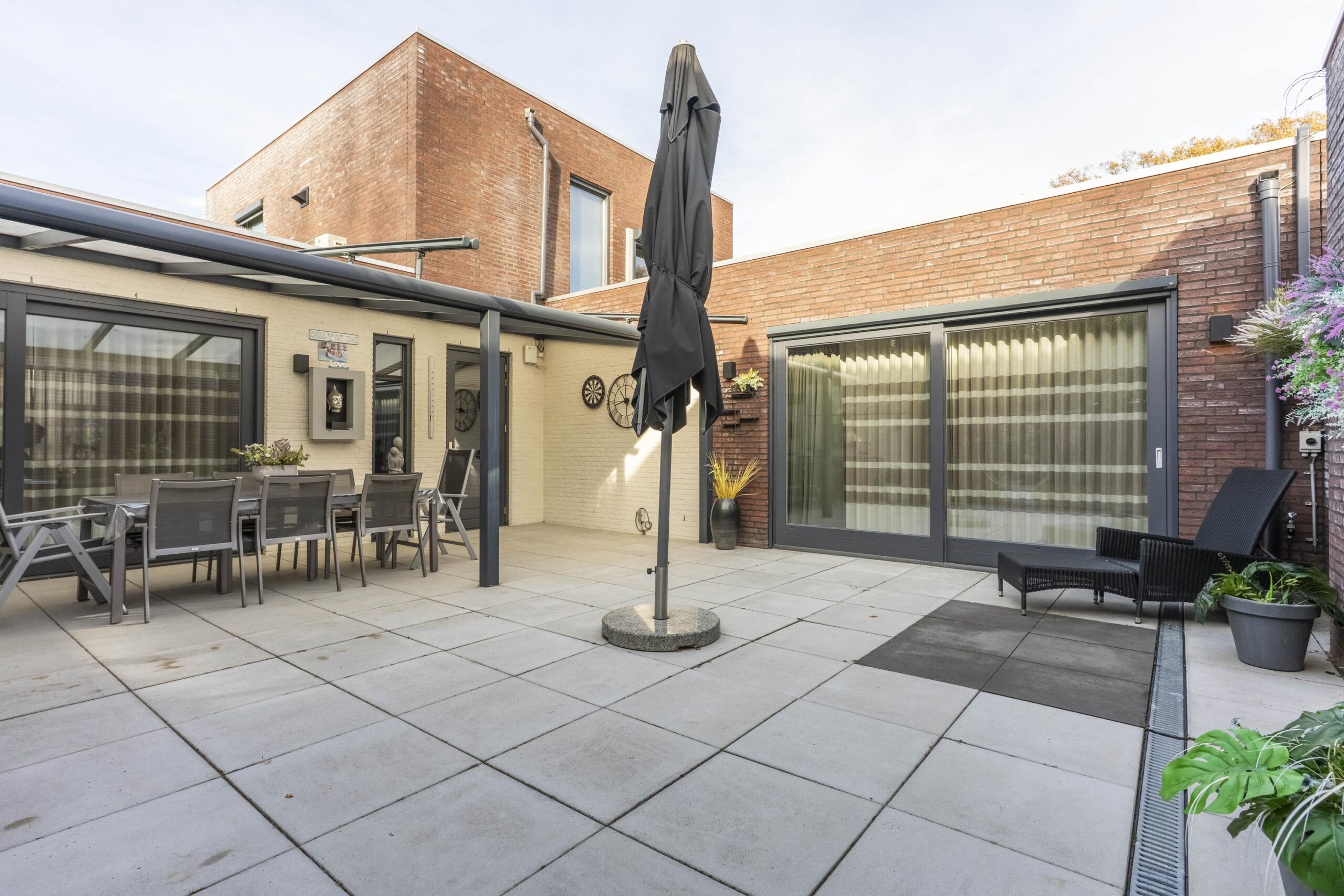 Vanuit de keuken, woonkamer en slaapkamer is er directe toegang tot de fraai aangelegde, geheel omsloten patiotuin met een luxe uitstraling. De tuin beschikt over een antracieten aluminium terrasoverkapping met ingebouwde verlichting en zonwering, evenals een buitendouche — een heerlijke plek om in privacy van de zon te genieten.