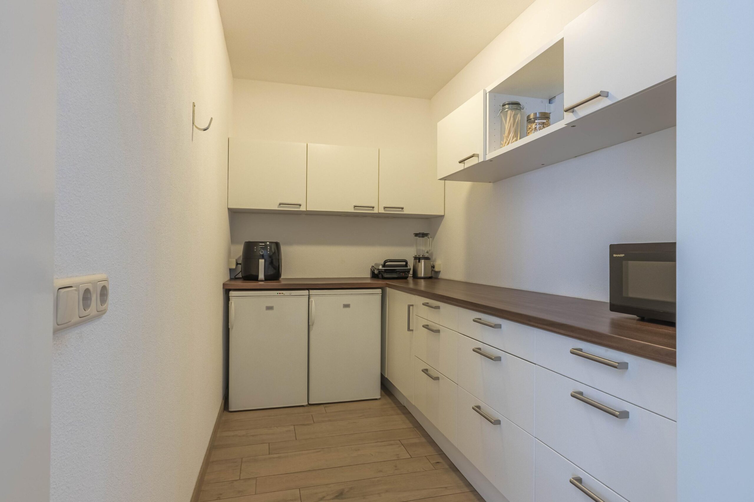 Via de verdeelhal bereik je de inpandige, geïsoleerde garage met sectionaalpoort en siergrindvloer. Achter de garage bevindt zich een royale bergkast met de verdeler van de vloerverwarming. De luxe bijkeuken beschikt over een extra aanrechtunit en volop bergruimte.