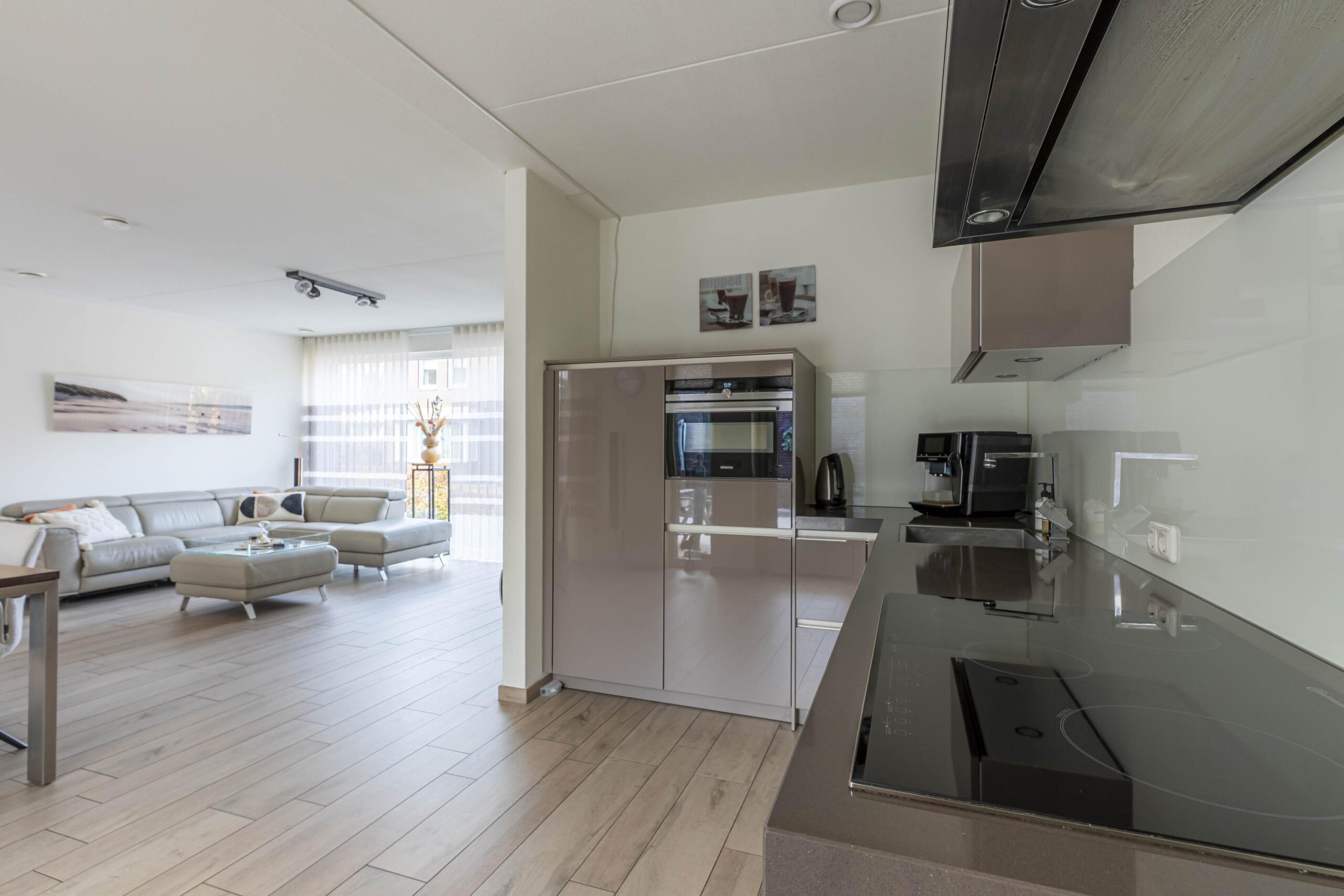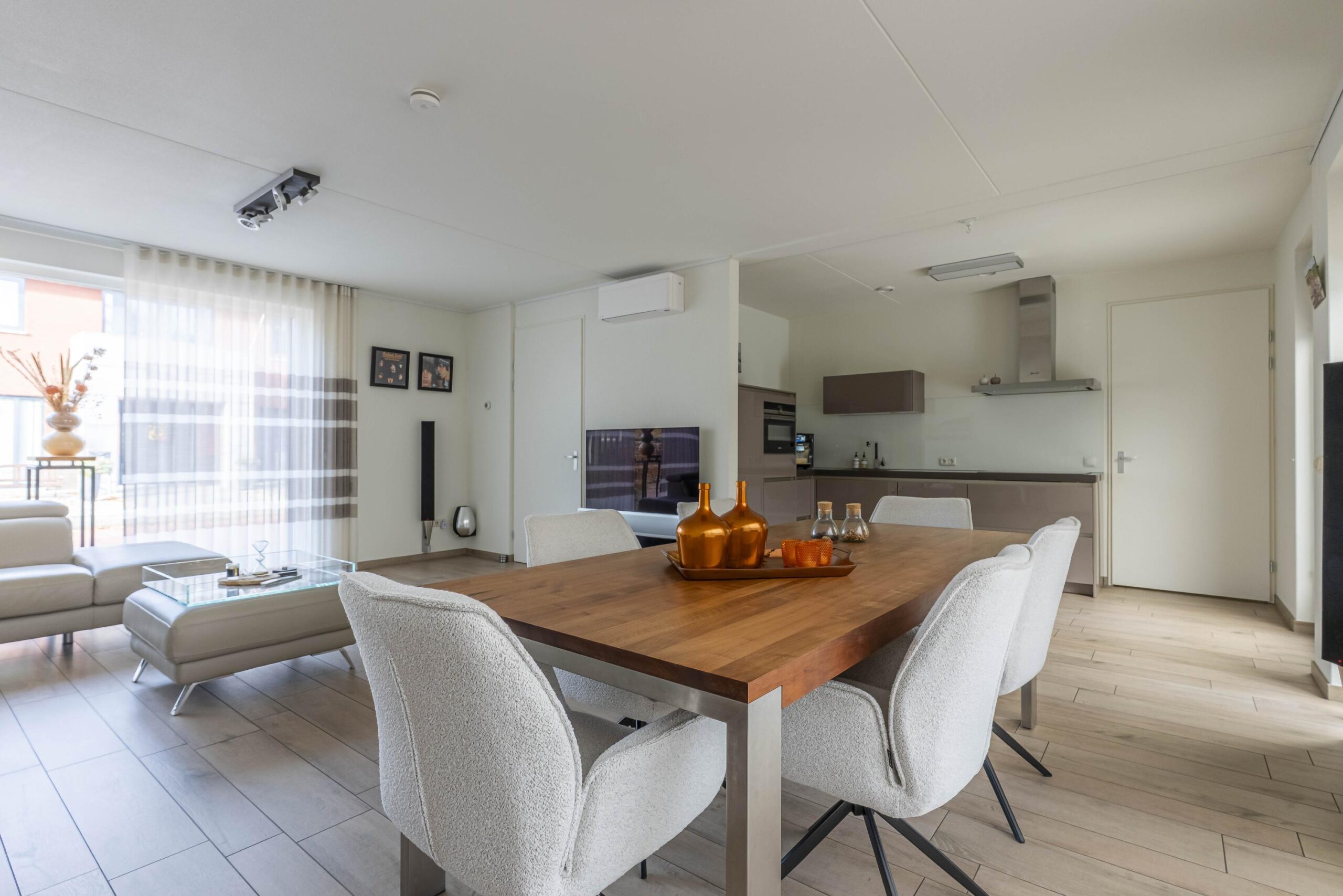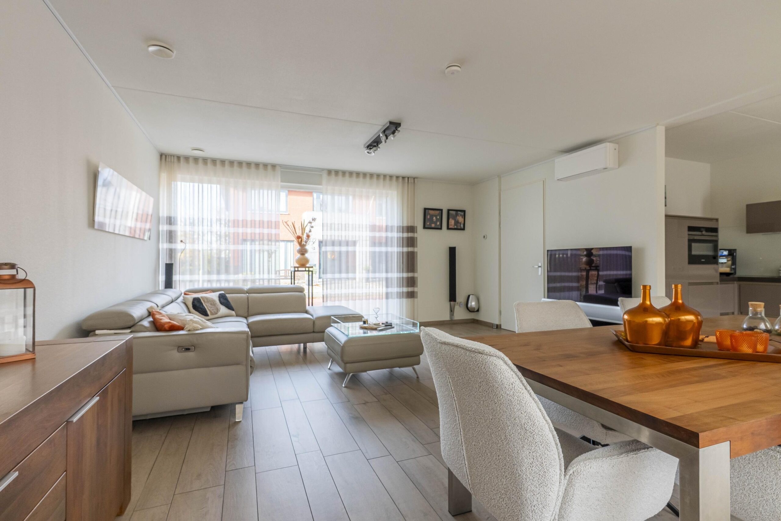 De sfeervolle woonkamer valt op door de grote raampartijen en royale schuifpui, waardoor binnen en buiten moeiteloos in elkaar overlopen. De open hoogglans keuken in hoekopstelling is afgewerkt met een composiet werkblad en glazen achterwand, en uitgerust met inbouwapparatuur zoals een koelkast, inductiekookplaat, rvs-afzuigkap, combimagnetron en vaatwasser. De living is voorzien van een airconditioning.